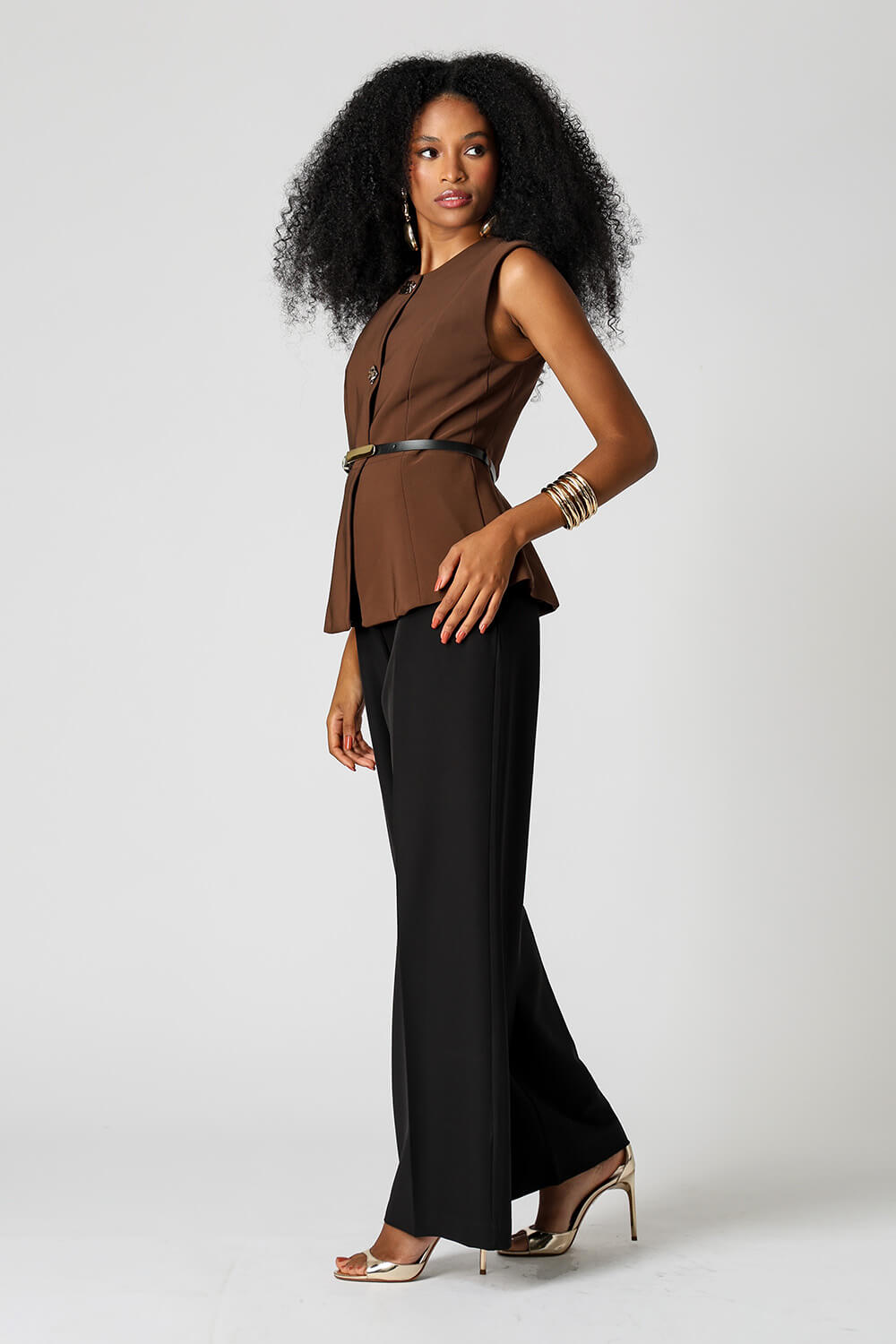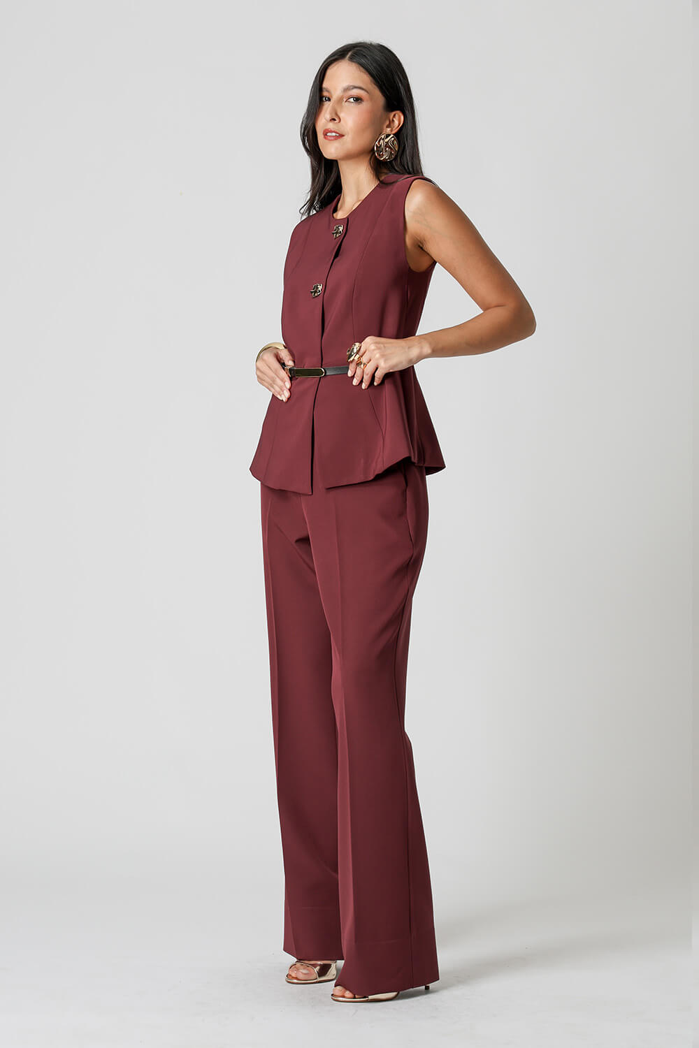 Blusa colete em tecido de alfaiataria, com modelagem acinturada, recortes estruturados e fechamento superior por três botões.