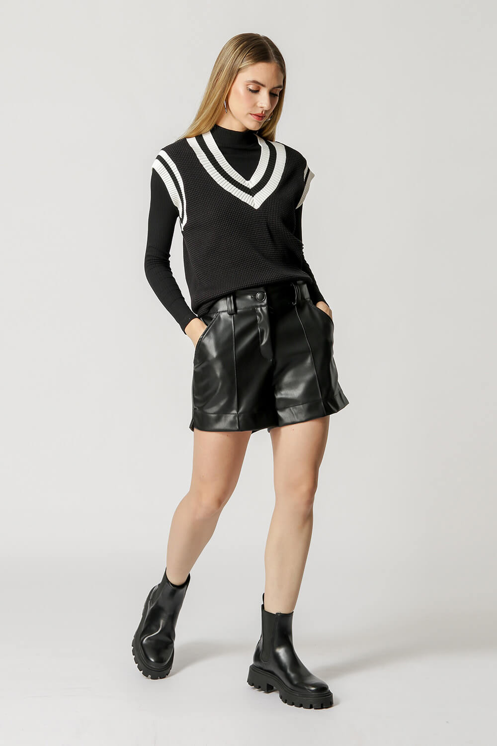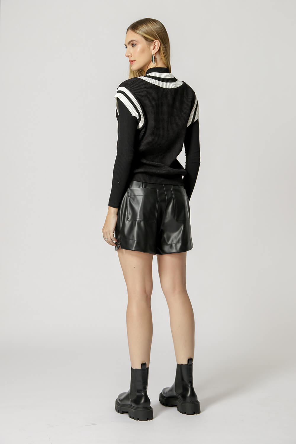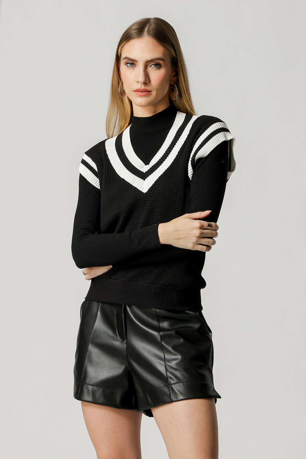 Blusa Colete com detalhe de listras na gola e cava. Um modelo confeccionado em tecido malha com textura de tricot. Um peça super versátil para compor diversos looks casual e arrasar.