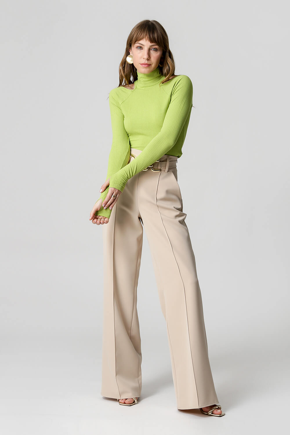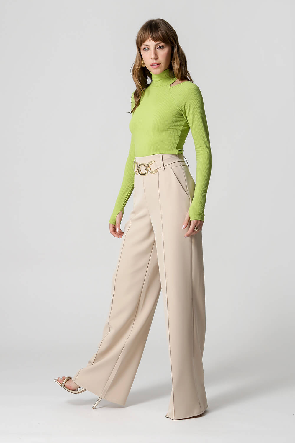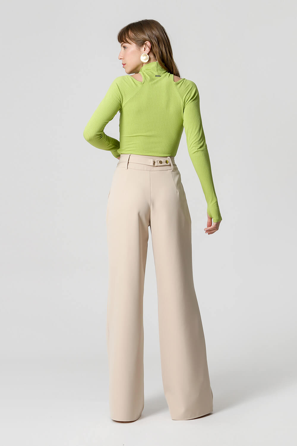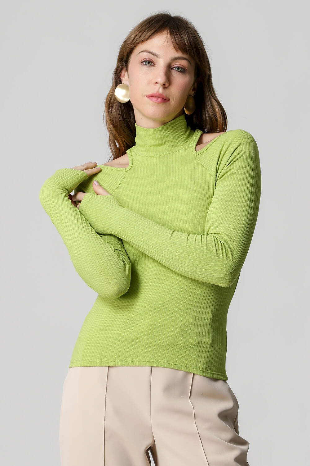 Blusa feita em malha canelada, com gola alta e um detalhe de recorte no ombro, com shape justo ao corpo, a manga é levemente mais alongada, com um detalhe de abertura para o dedal, para dias mais frios.