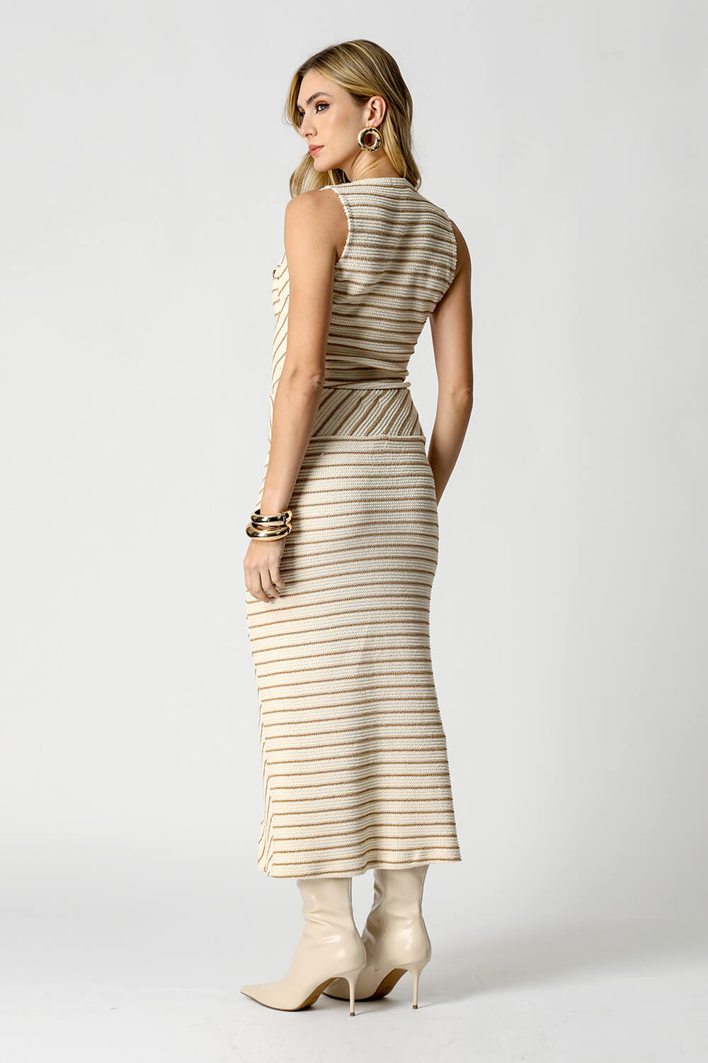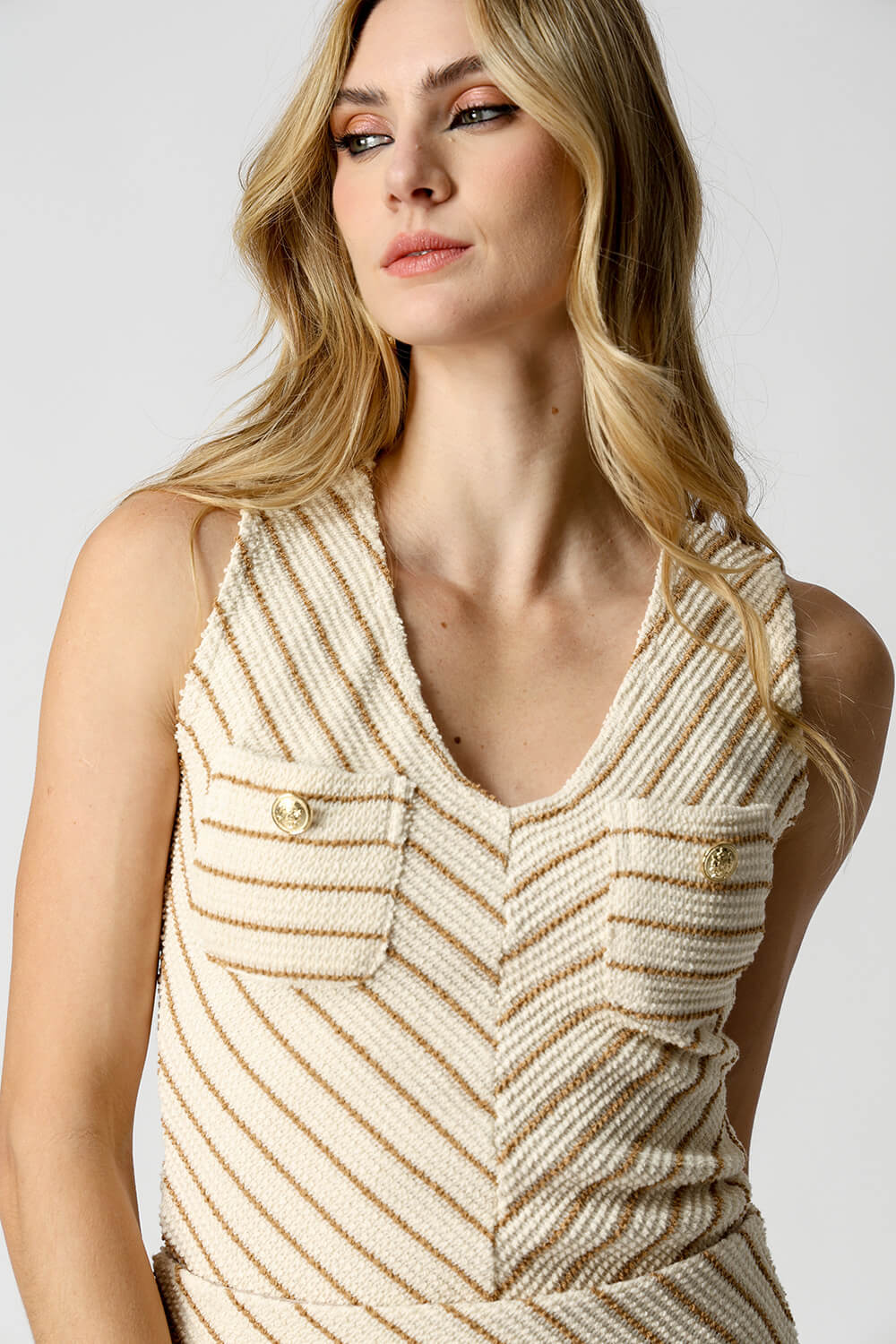 Com design sofisticado e moderno, essa blusa sem manga de ombro largo traz dois bolsos frontais e botões brasão que adicionam um toque de estilo único. O tricô listrado oferece um visual elegante e confortável, perfeito para compor looks casuais ou mais arrumados.