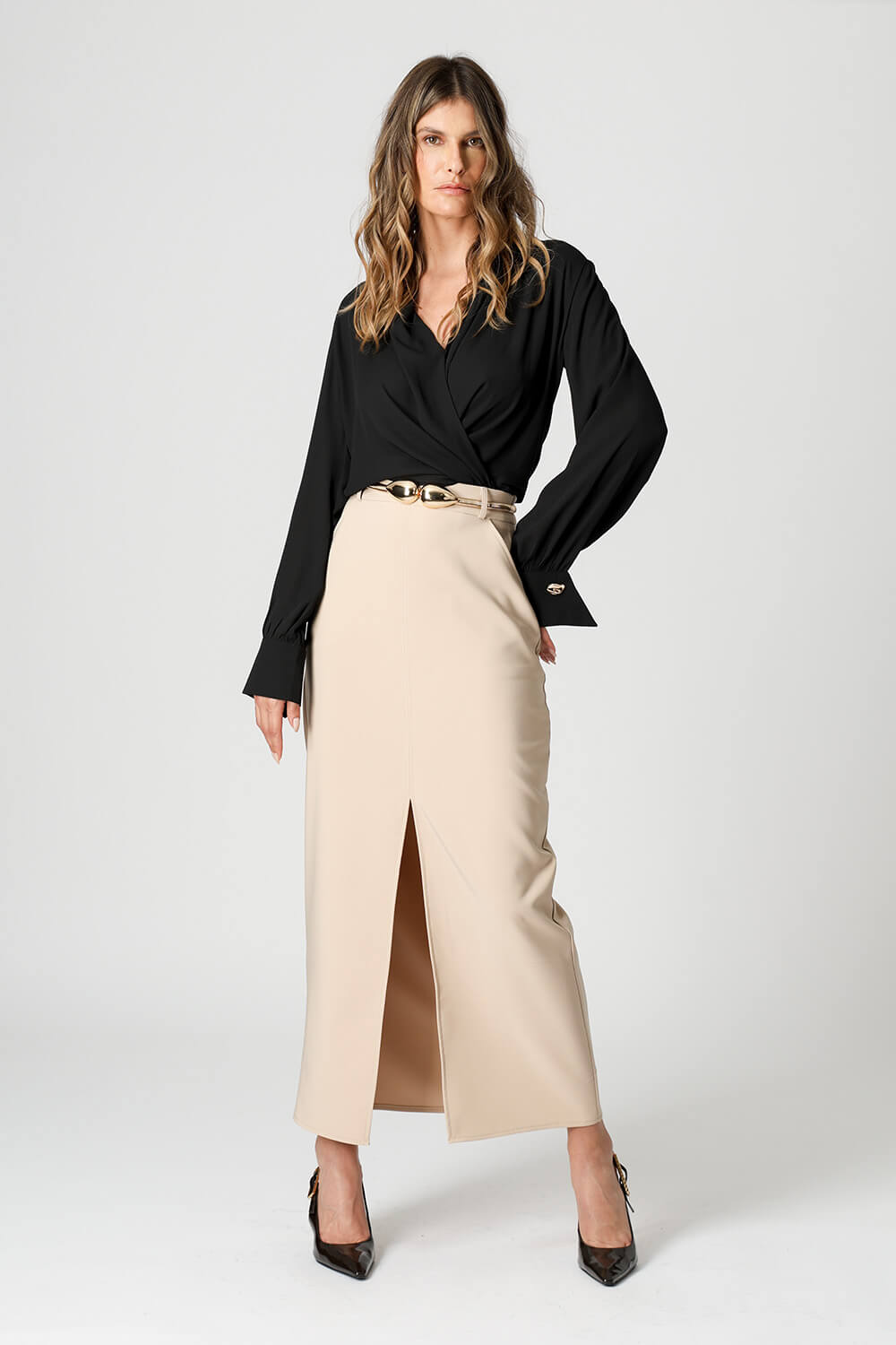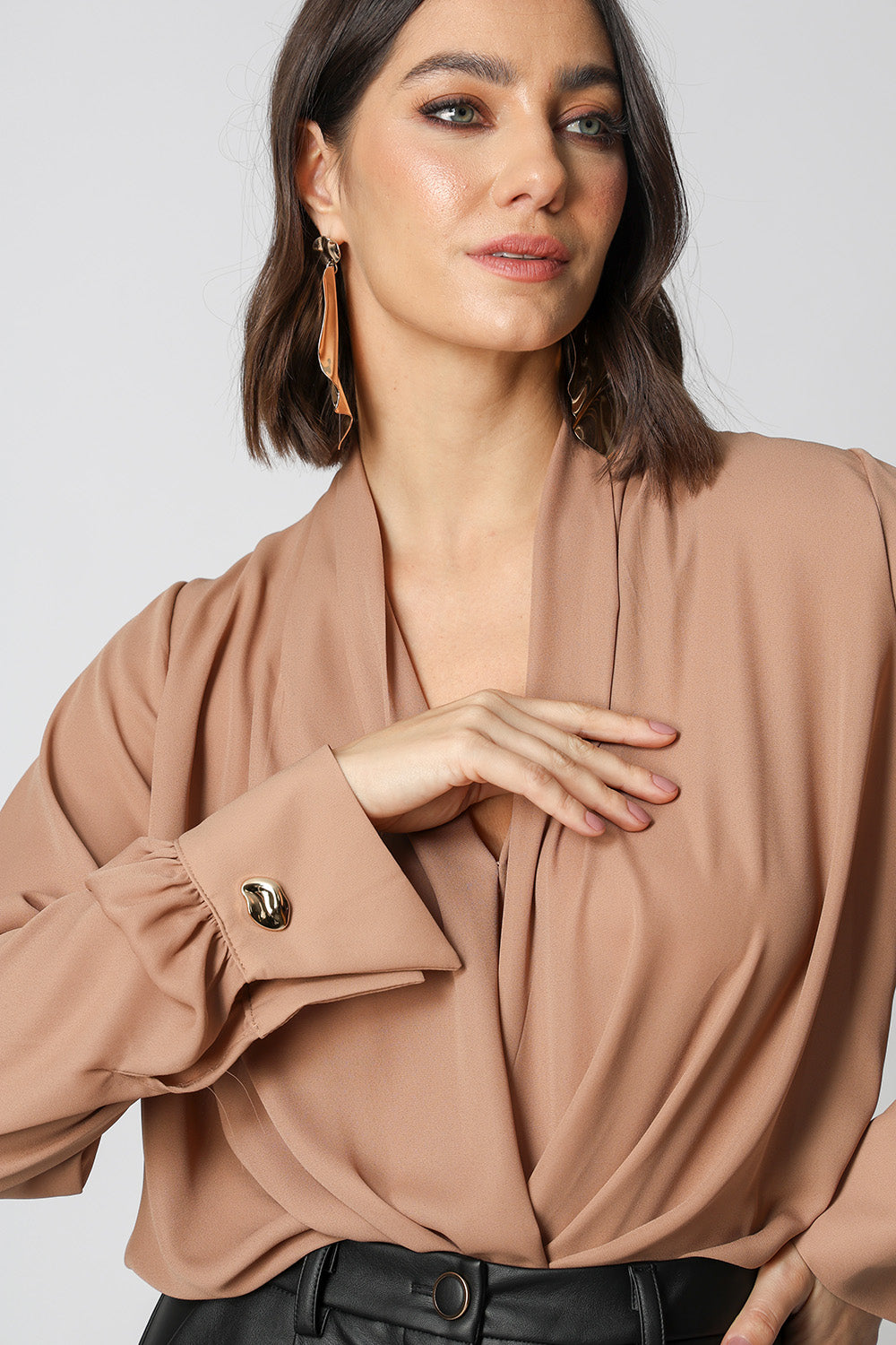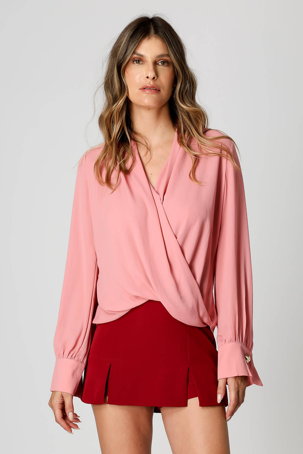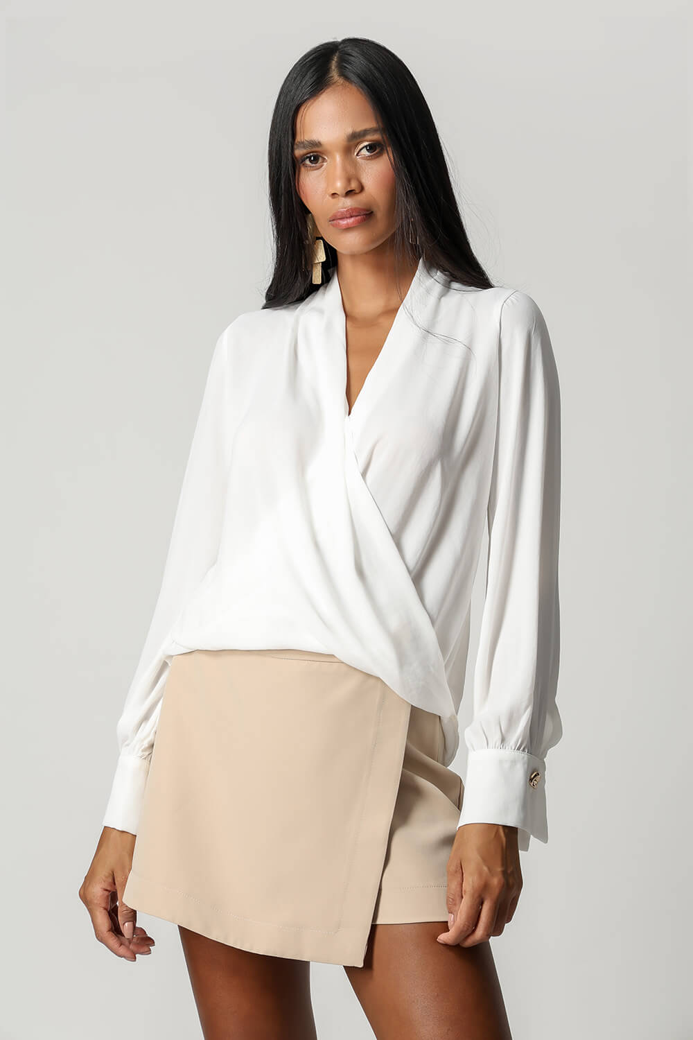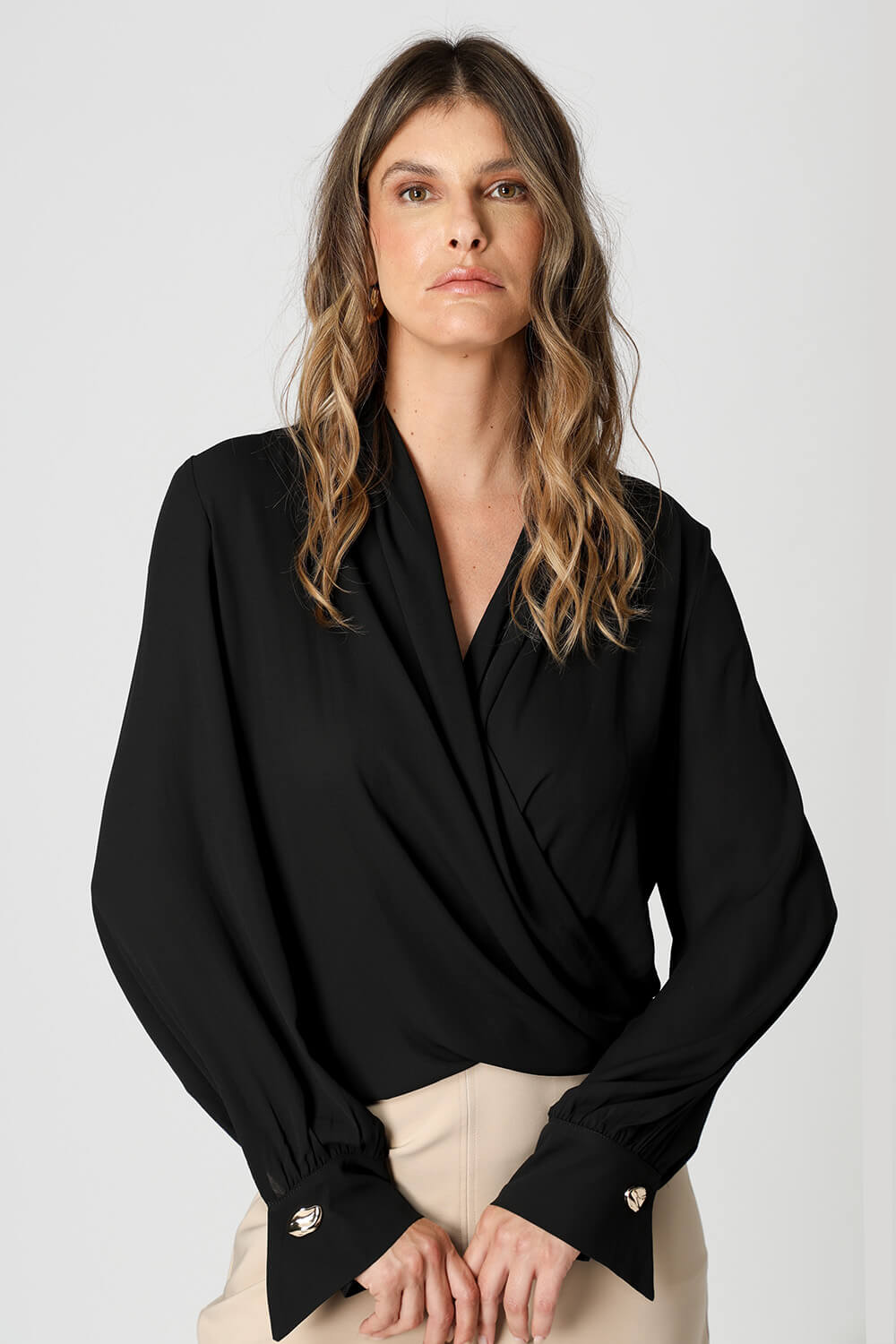 Blusa manga longa com botão diferenciado de dourado, modelagem cachecouer confeccionado em crepe fluído. Uma peça clássica e atemporal para um look elegante.