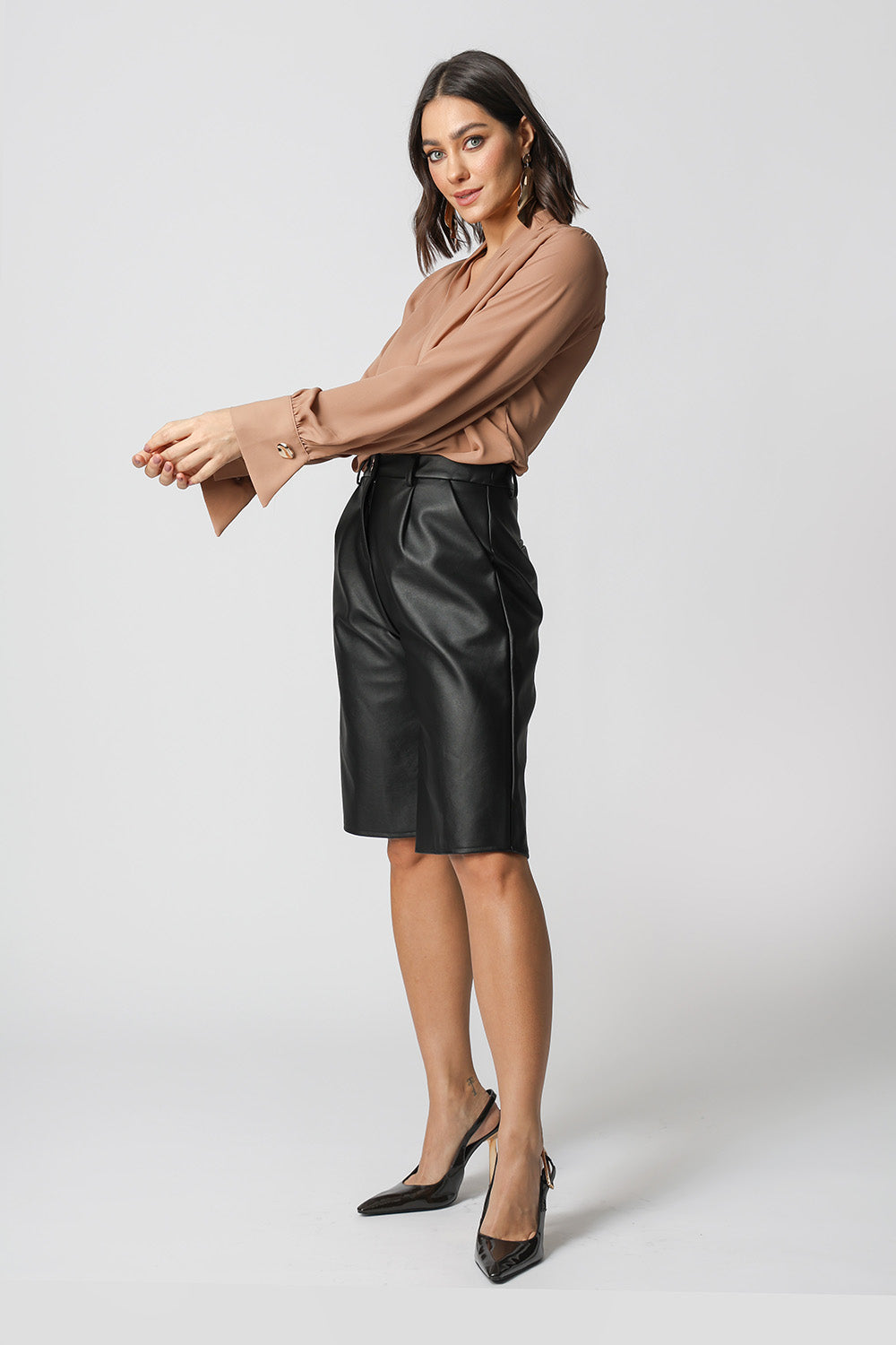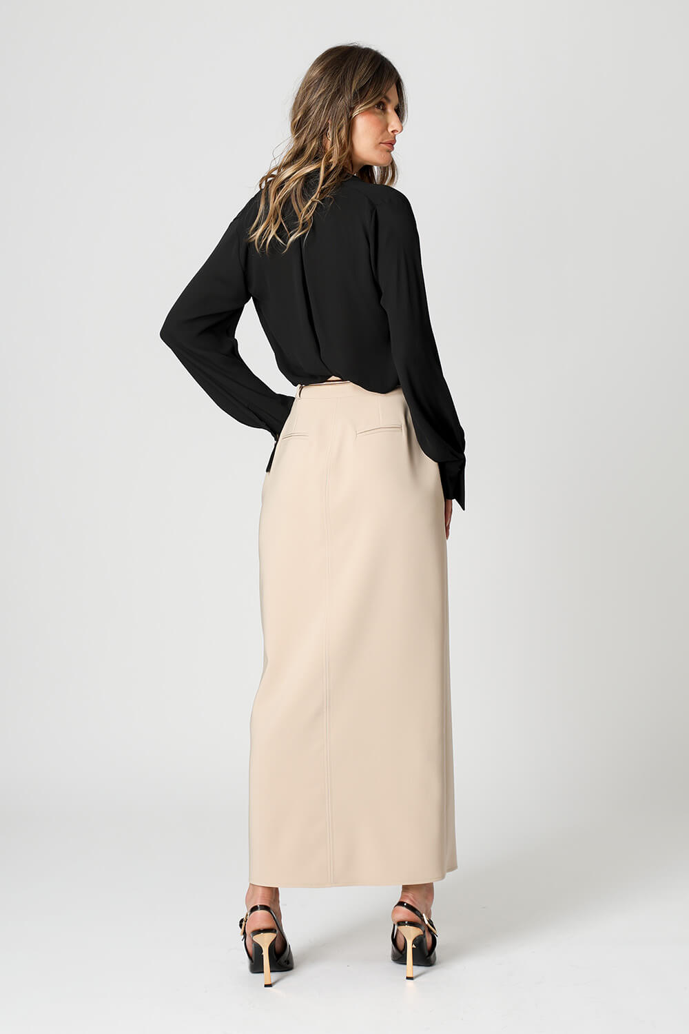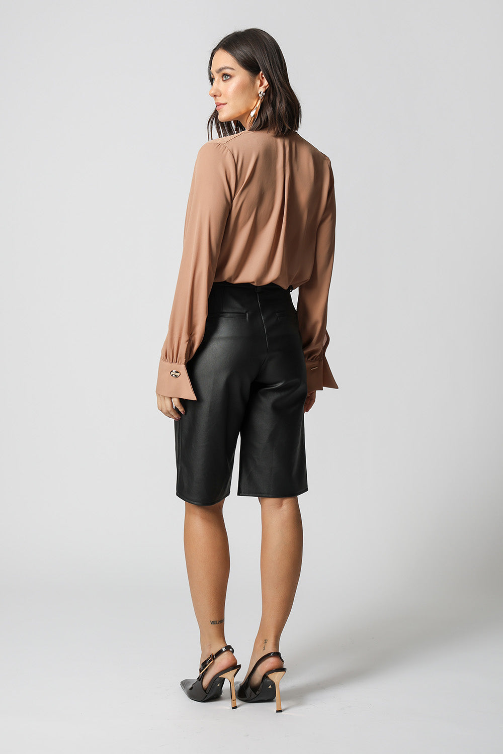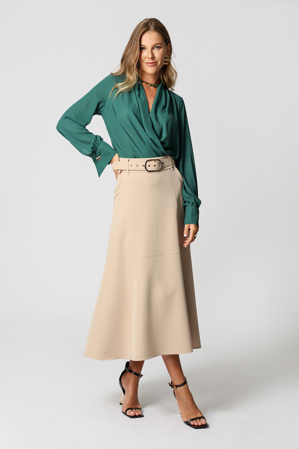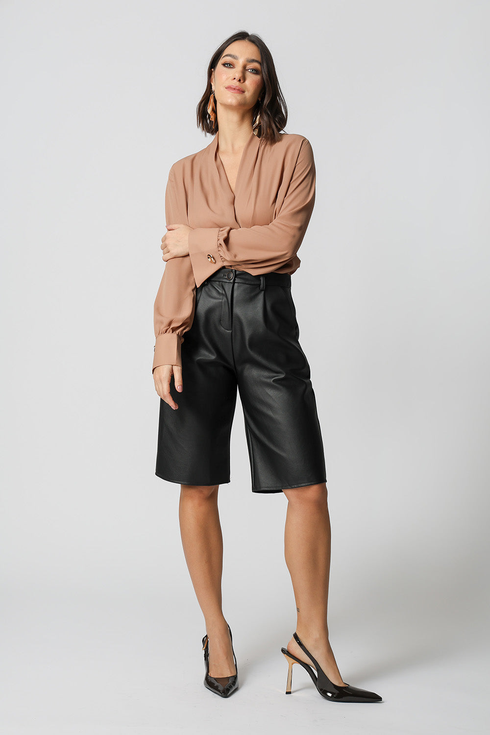 Blusa manga longa com botão diferenciado de dourado, modelagem cachecouer confeccionado em crepe fluído. Uma peça clássica e atemporal para um look elegante.