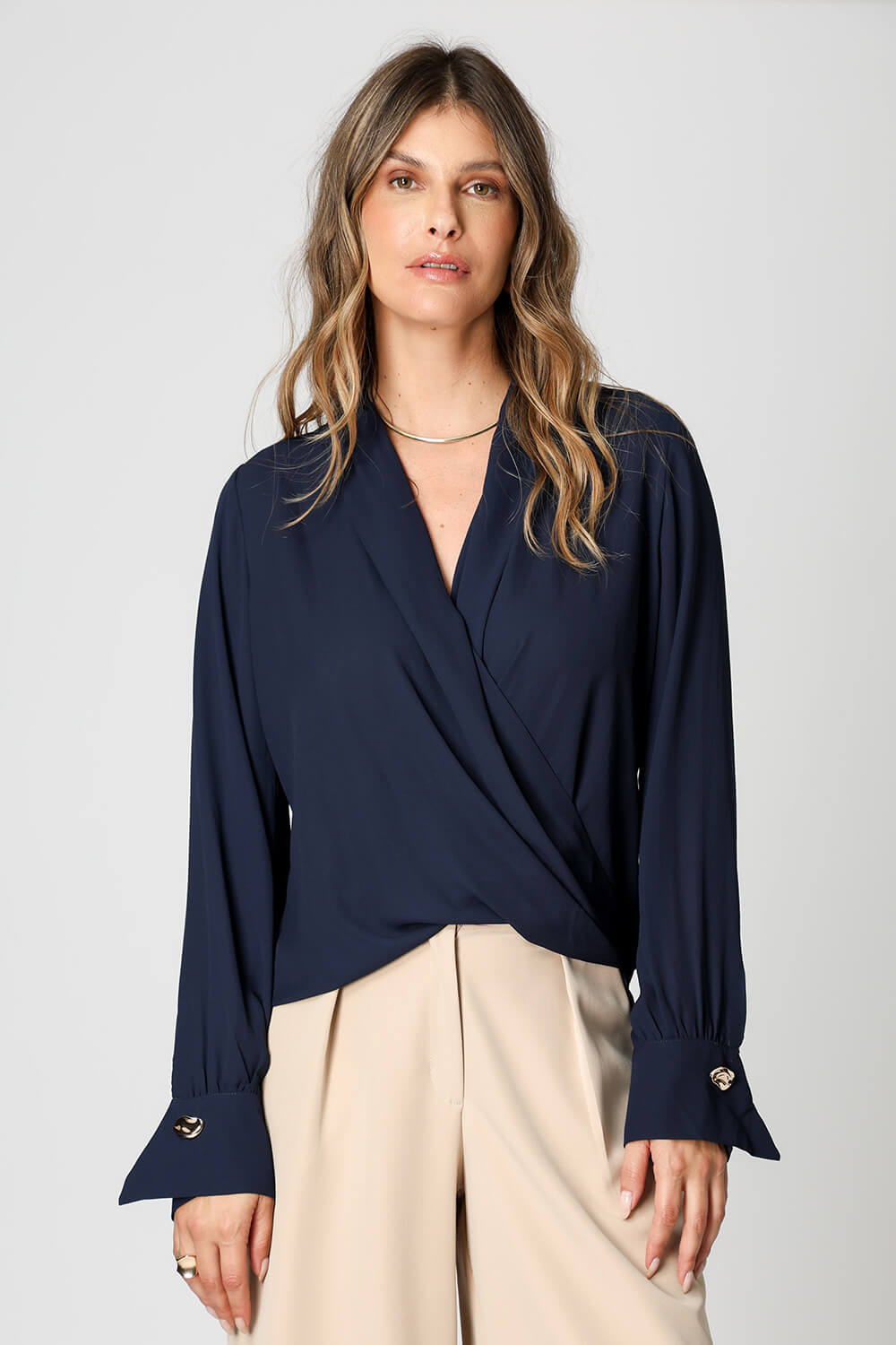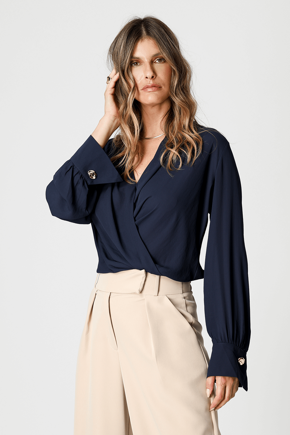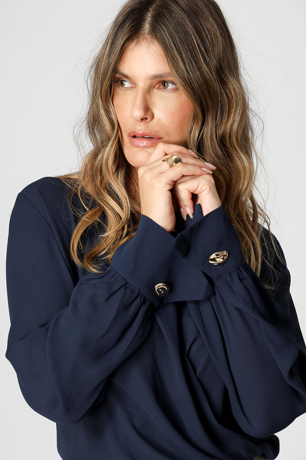 Blusa manga longa com botão diferenciado de dourado, modelagem cachecouer confeccionado em crepe fluído. Uma peça clássica e atemporal para um look elegante.
