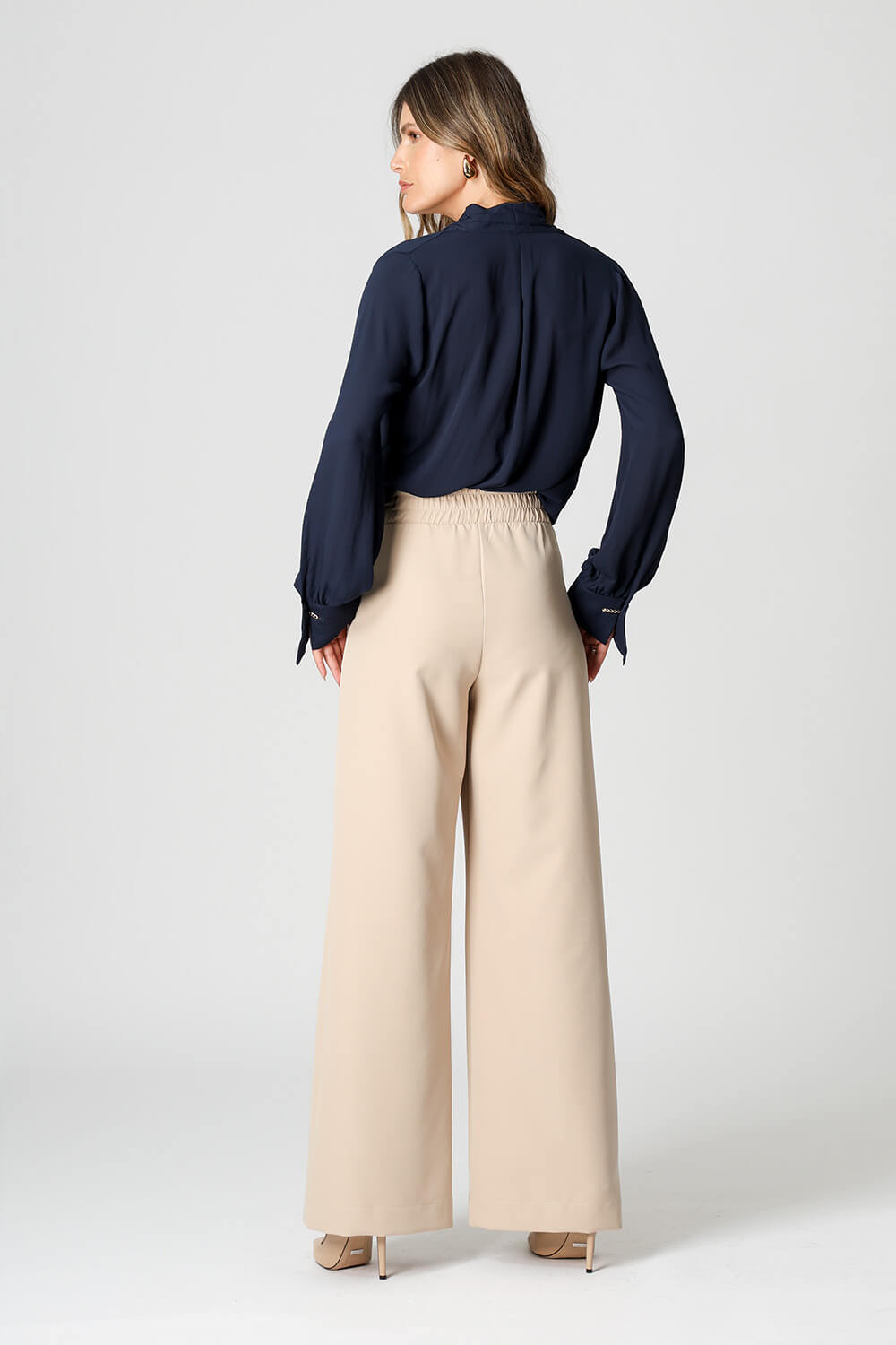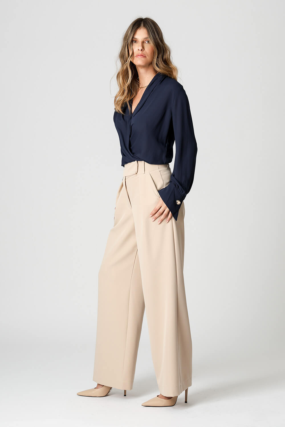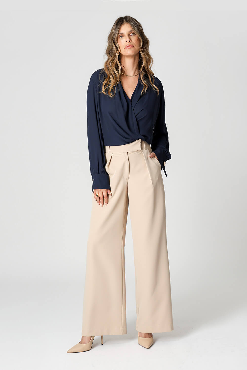 Blusa manga longa com botão diferenciado de dourado, modelagem cachecouer confeccionado em crepe fluído. Uma peça clássica e atemporal para um look elegante.
