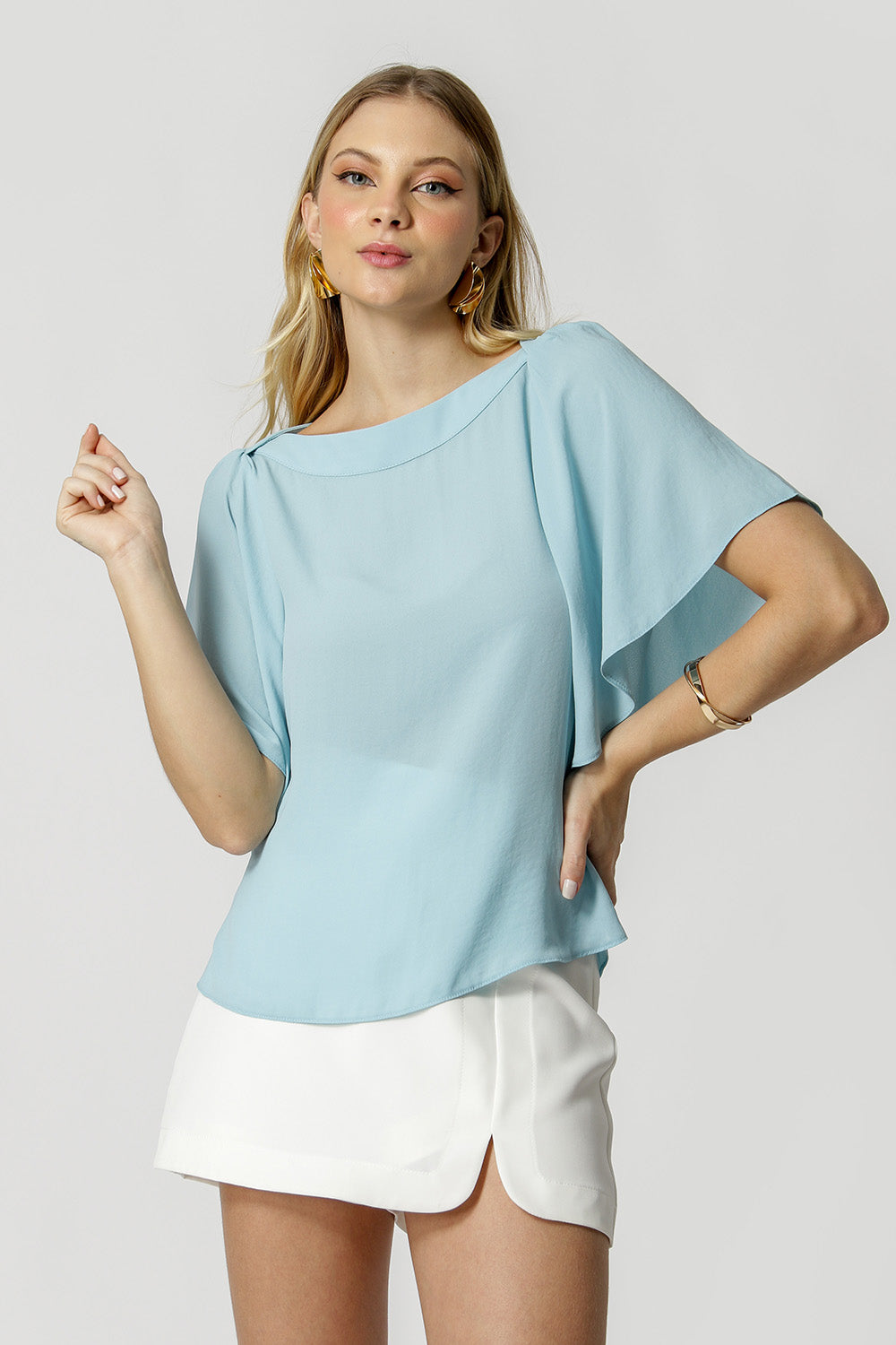 Blusa com decote canoa com detalhe sobreposição no ombro. Uma peça confeccionada em tecido de crepe fluído. Peça ideal para compor mood work confortável e chic.