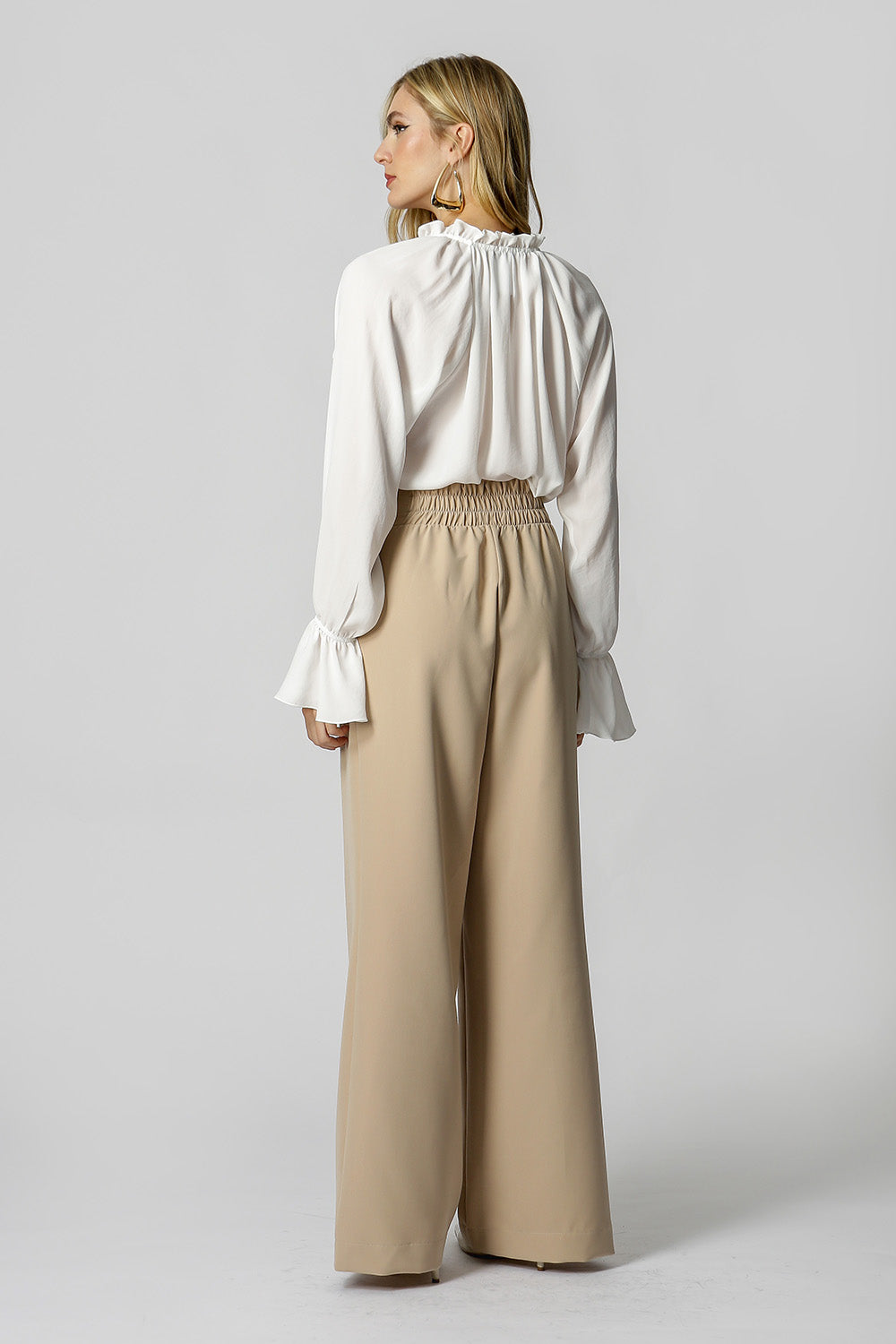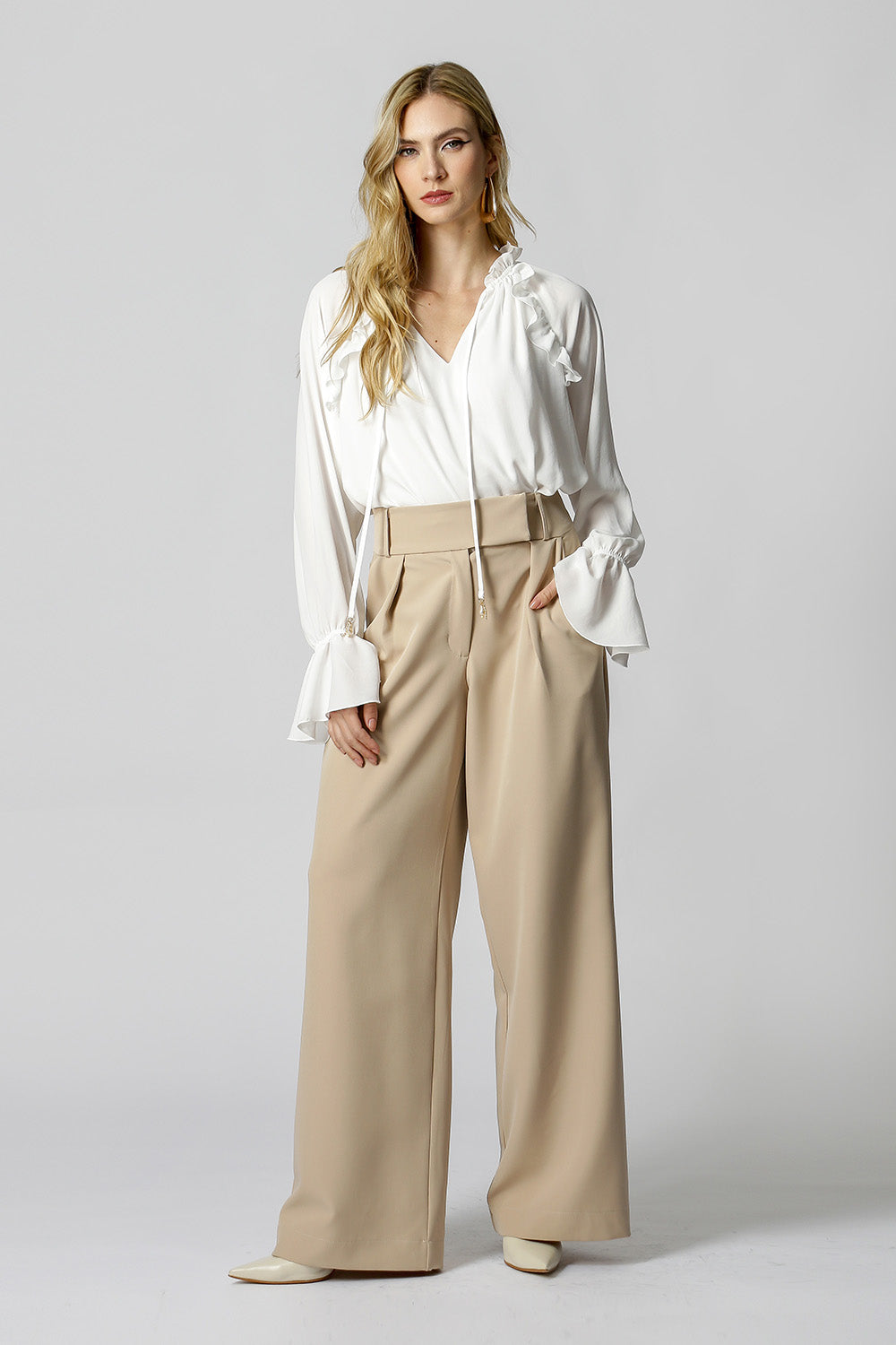 Blusa de crepe fluído com babado delicado na cava e gola. Possui detalhe de pérolas nas ponteiras. Uma peça romântica e elegante, aposte!