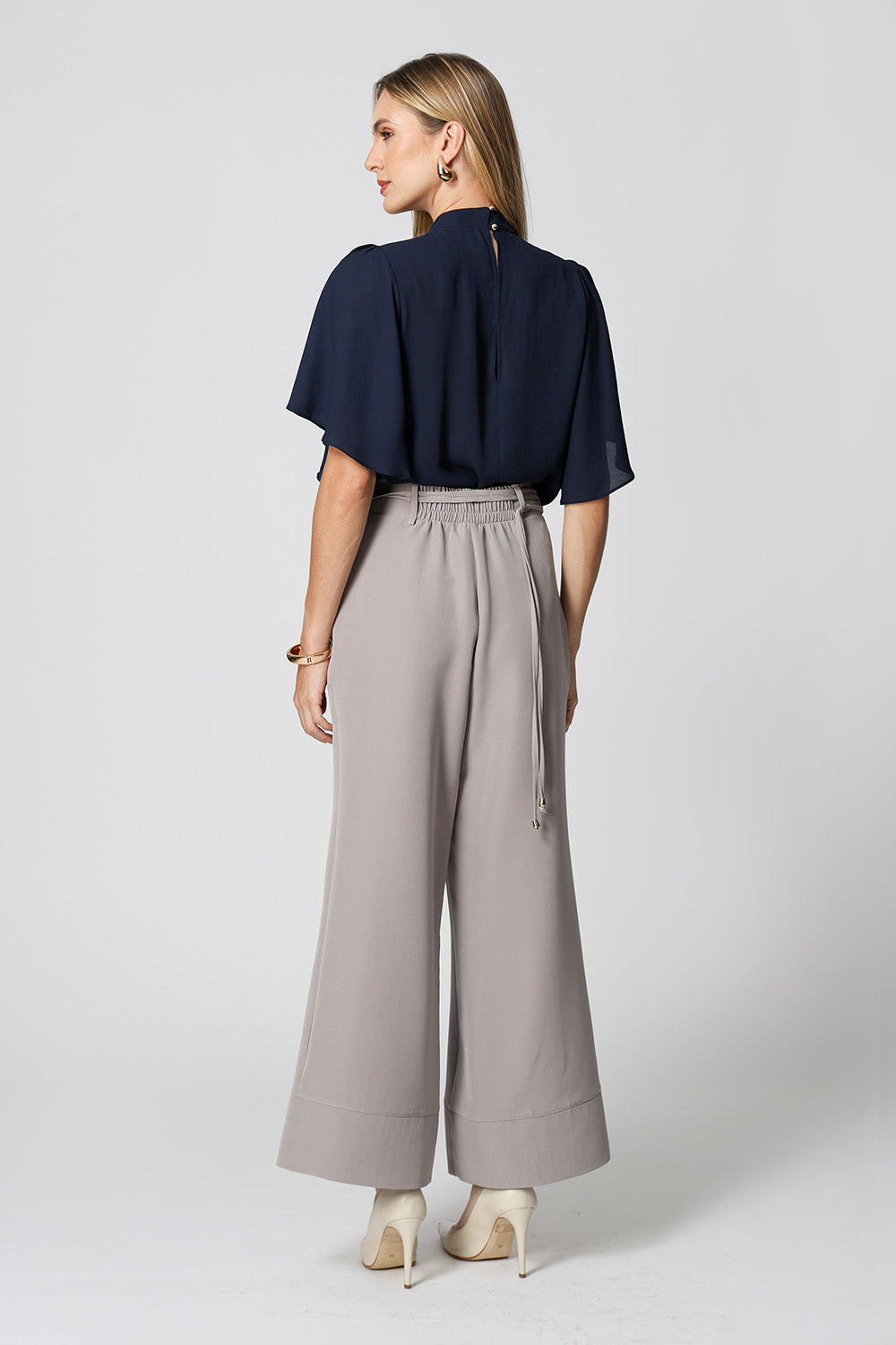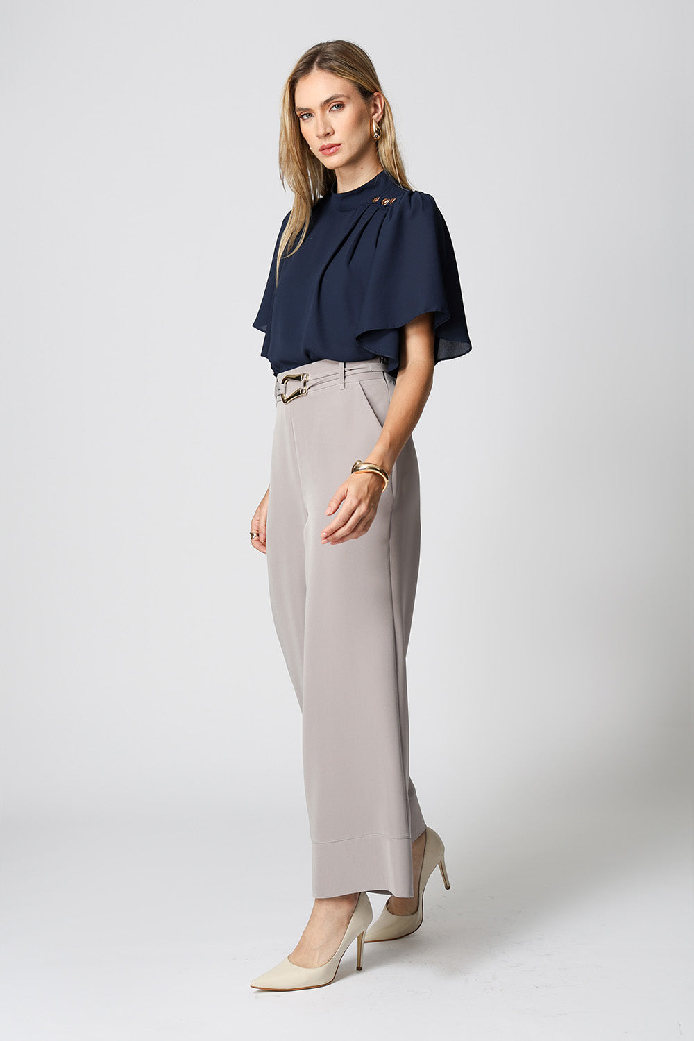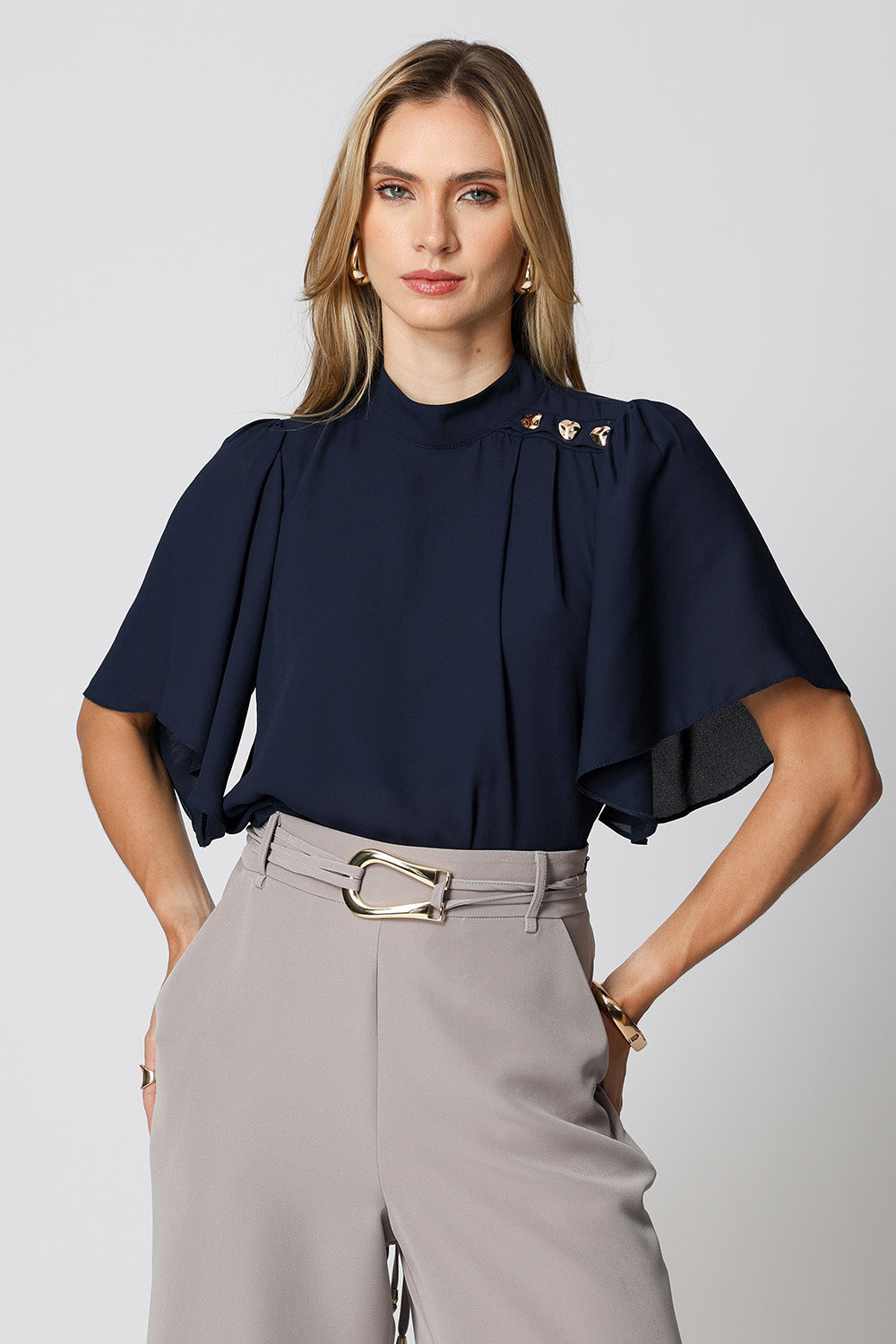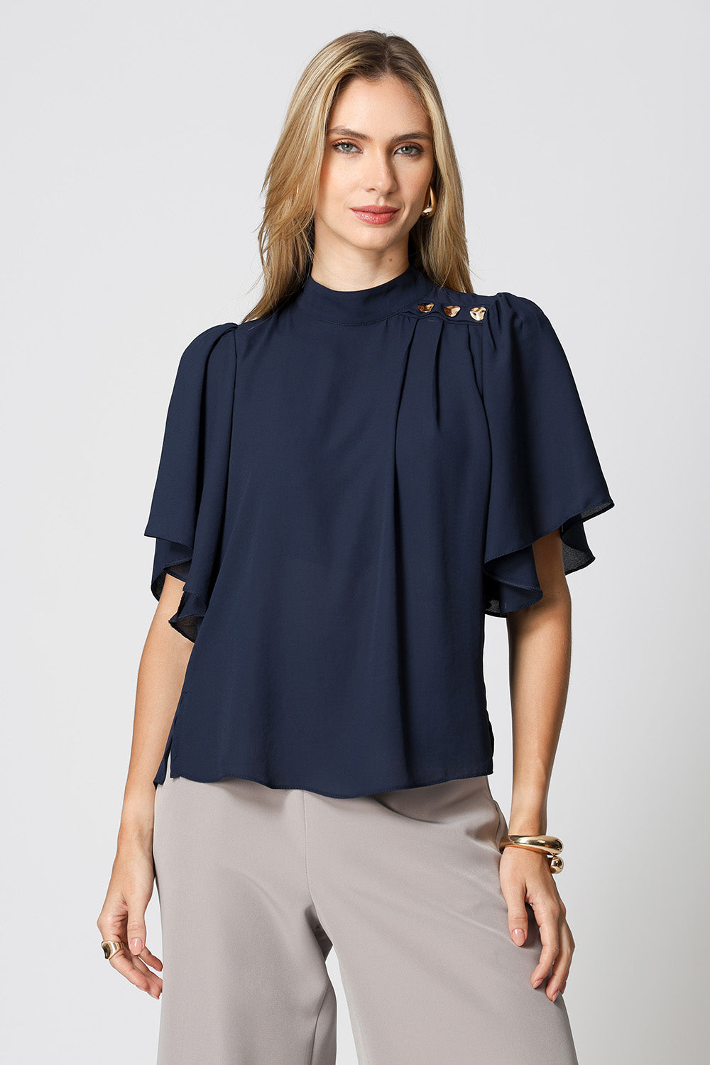 Blusa com manga curta e gola alta, com detalhe de botões de metais. Uma peça confeccionada em tecido crepe fluido. Um modelo perfeito para mood work cheio de charme.