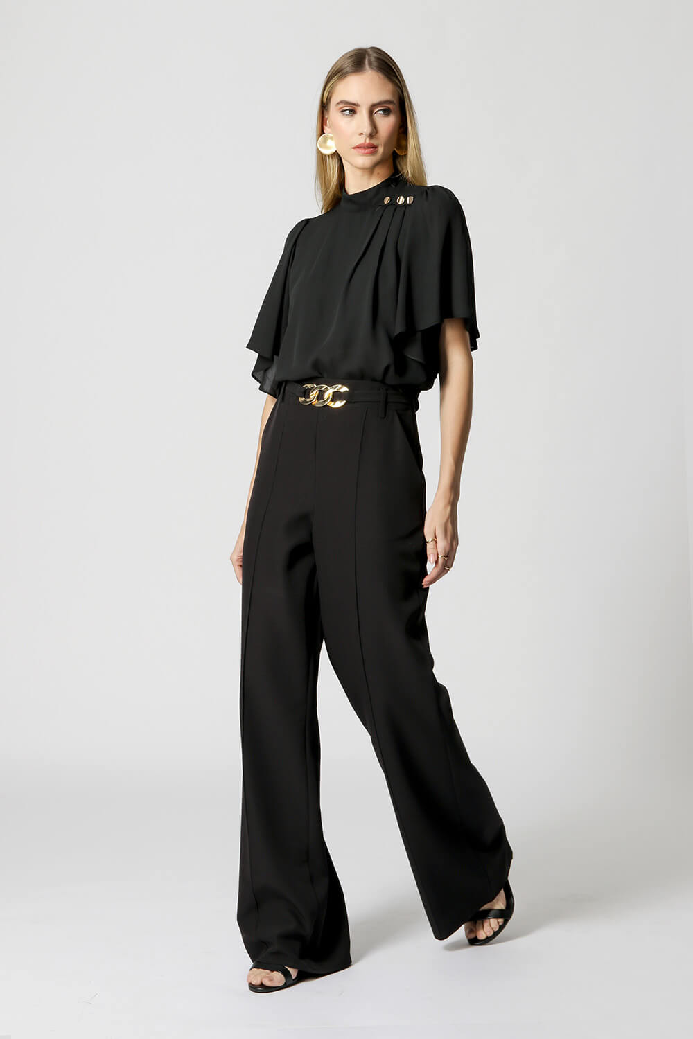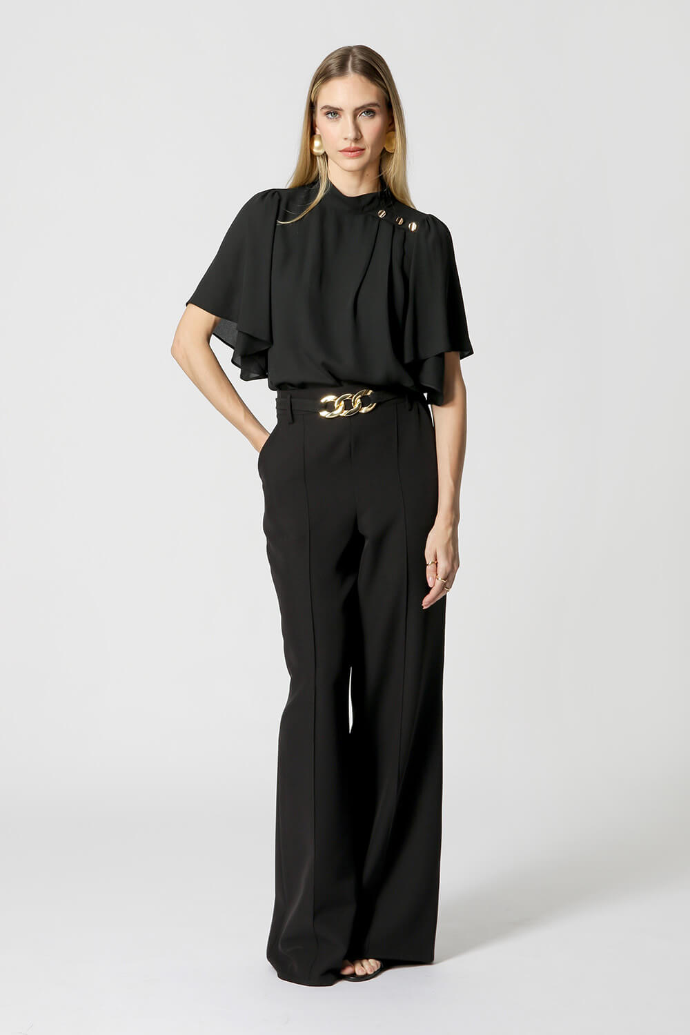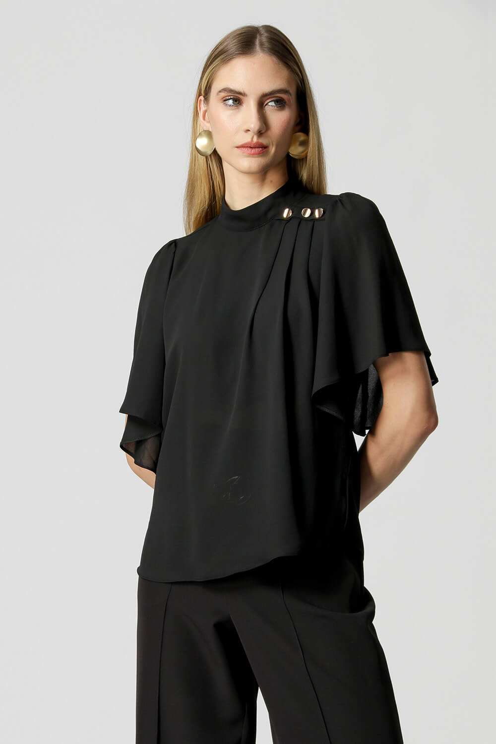 Blusa com manga curta e gola alta, com detalhe de botões de metais. Uma peça confeccionada em tecido crepe fluido. Um modelo perfeito para mood work cheio de charme.