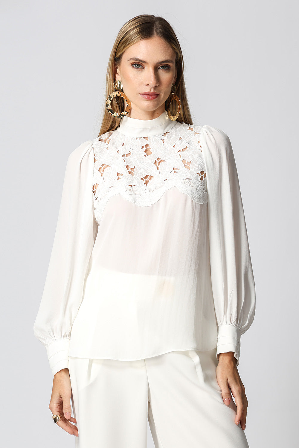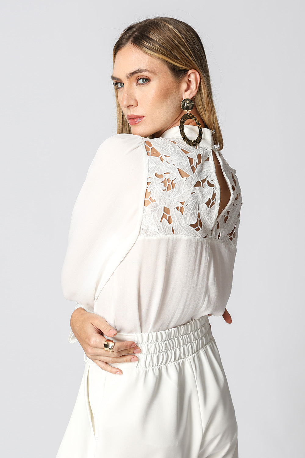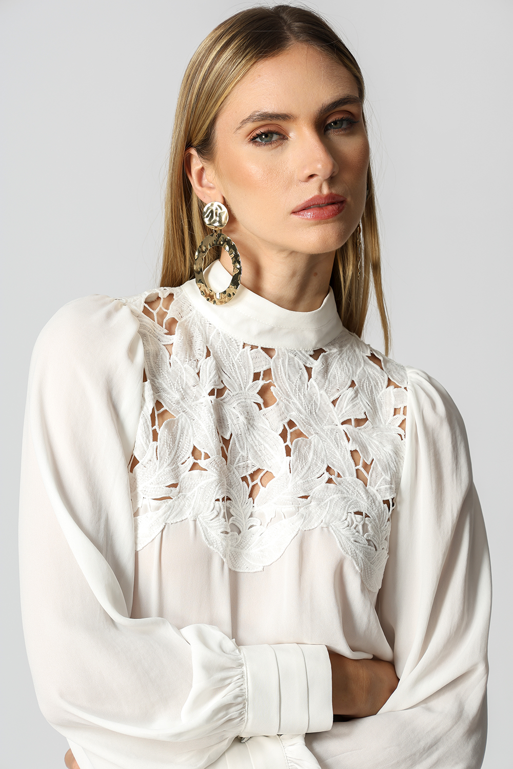 Blusa elegante e moderna, com detalhes em guippir, um delicado bordado floral que adiciona leveza e feminilidade. Perfeita para looks do dia a dia ou ocasiões especiais, combina sofisticação e conforto em uma só peça.