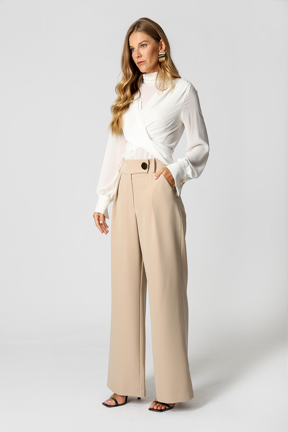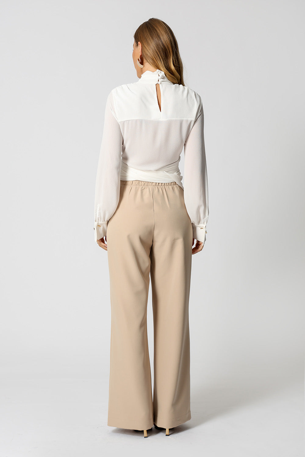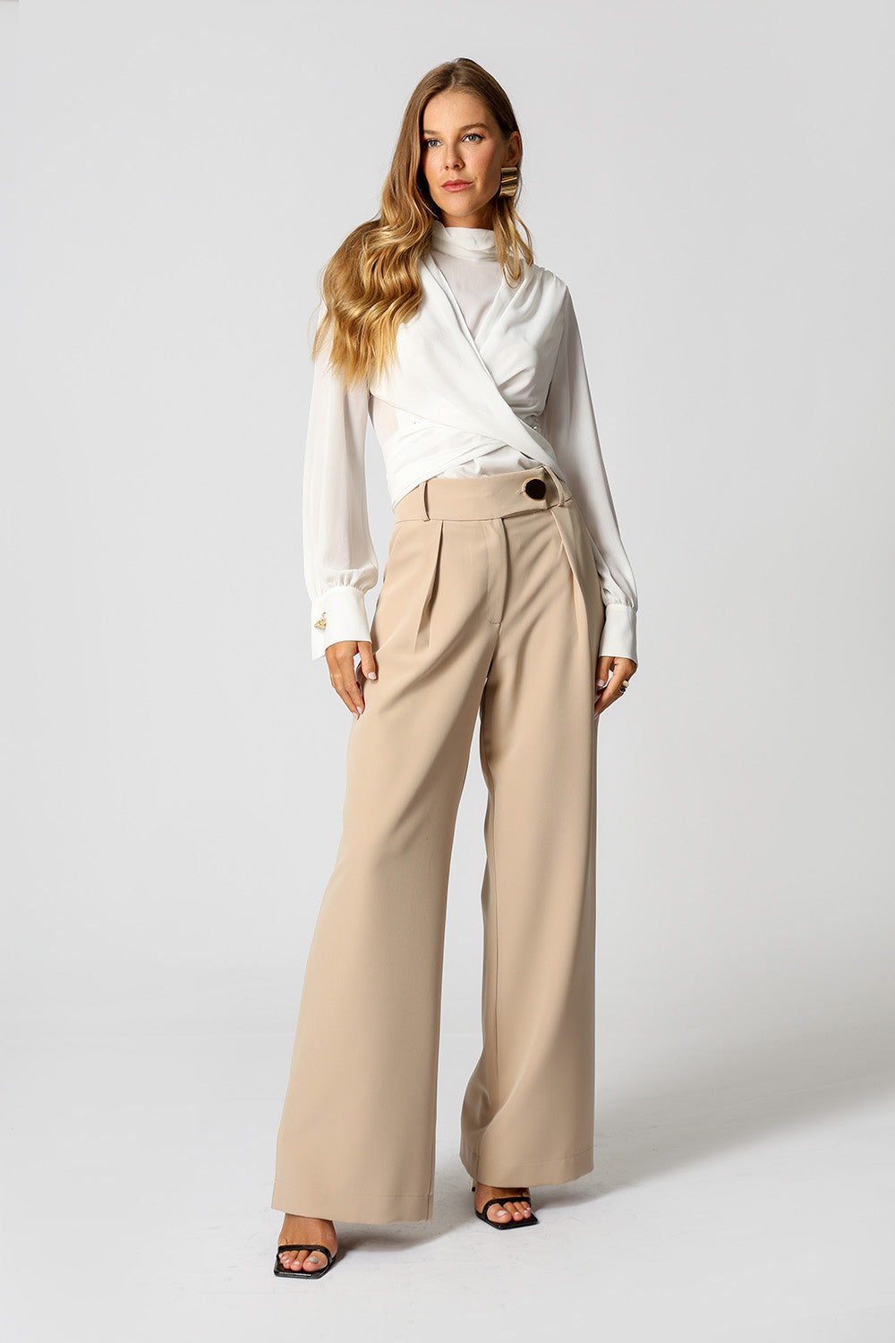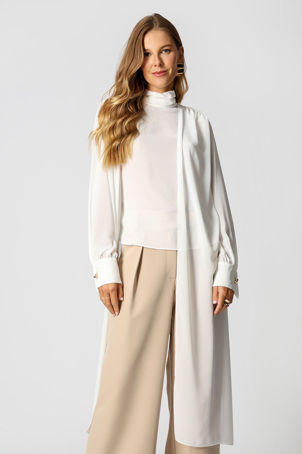 Blusa com detalhe de echarpe aplicado elegante e cheia de personalidade. O charme especial fica por conta da echarpe integrada, que permite uma amarração cruzada, criando diferentes estilos em uma única peça.