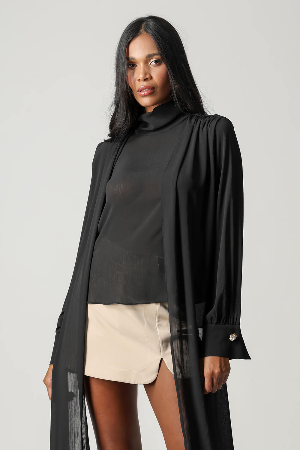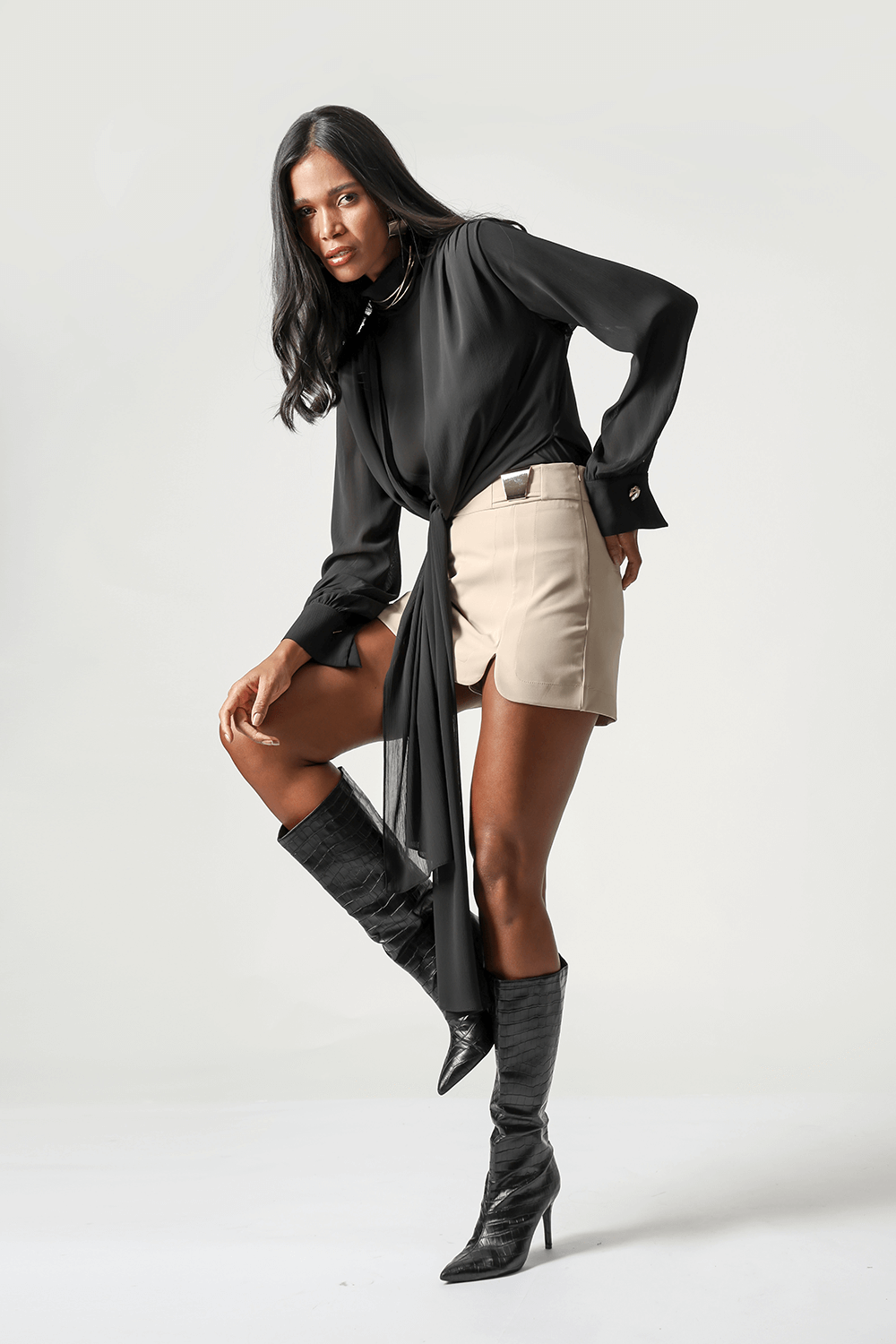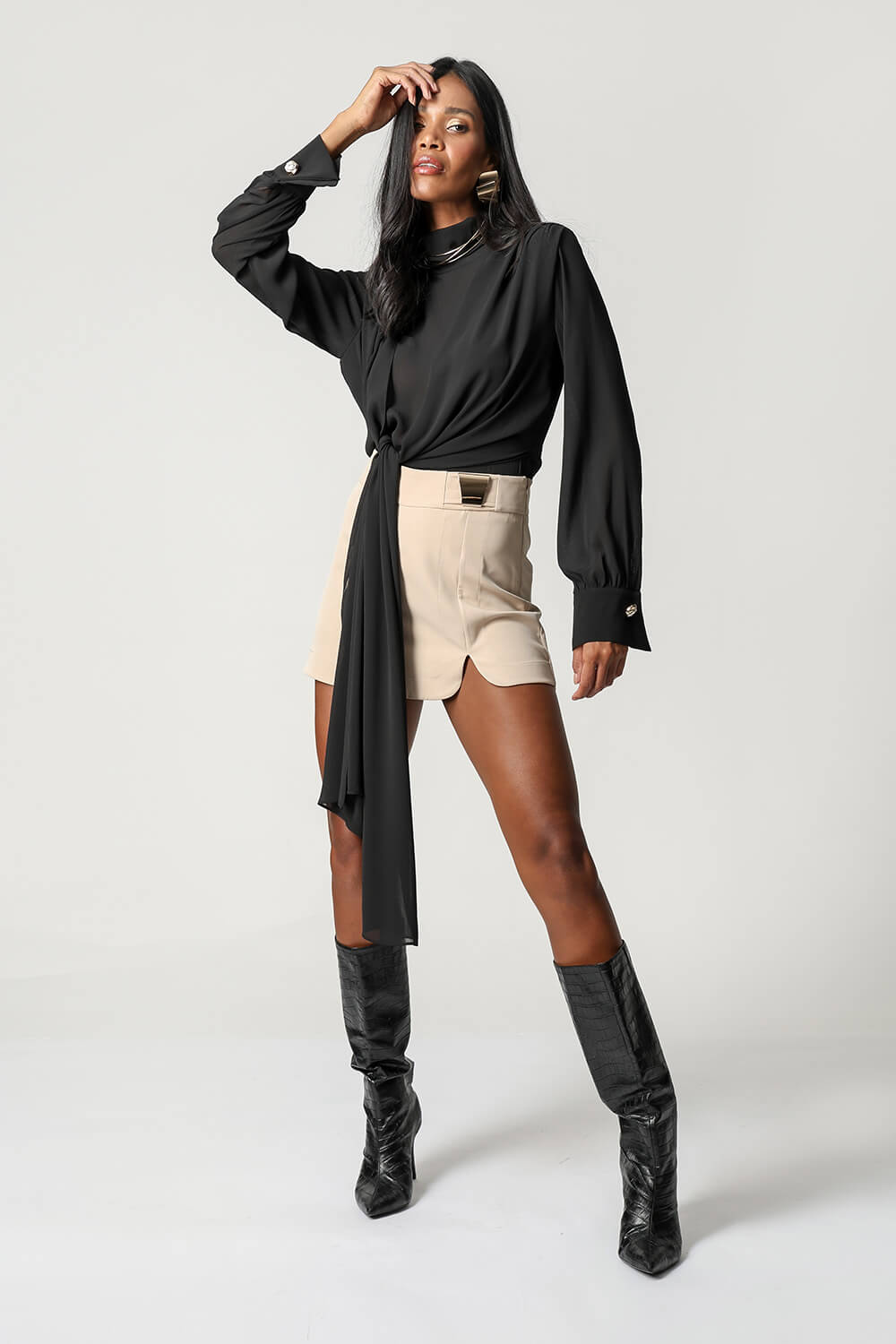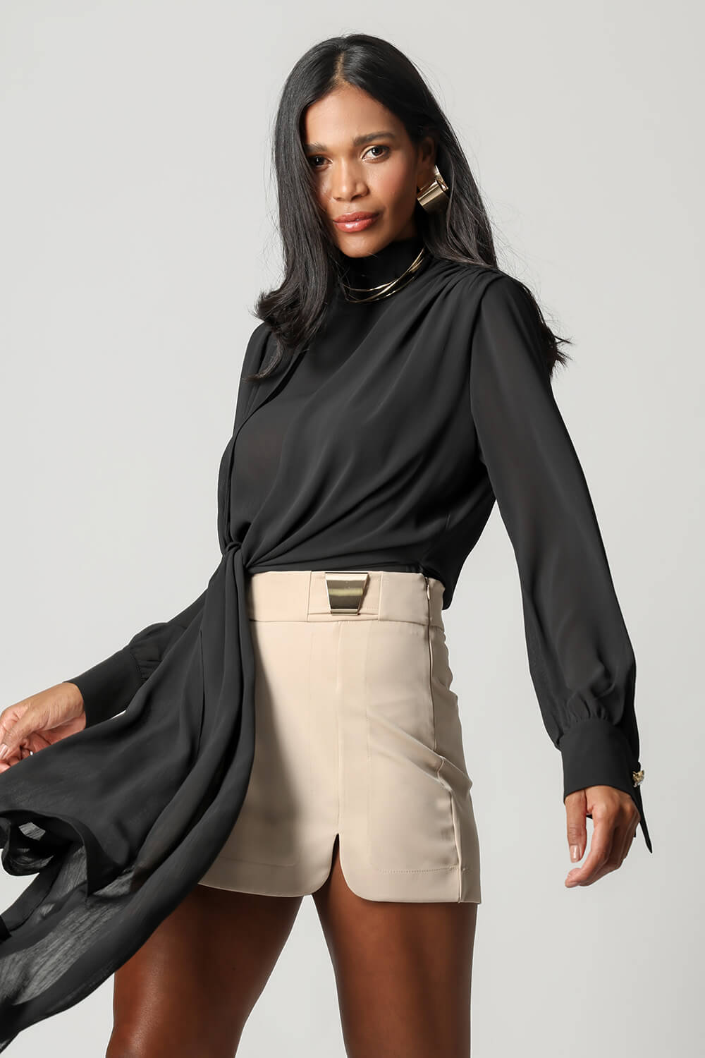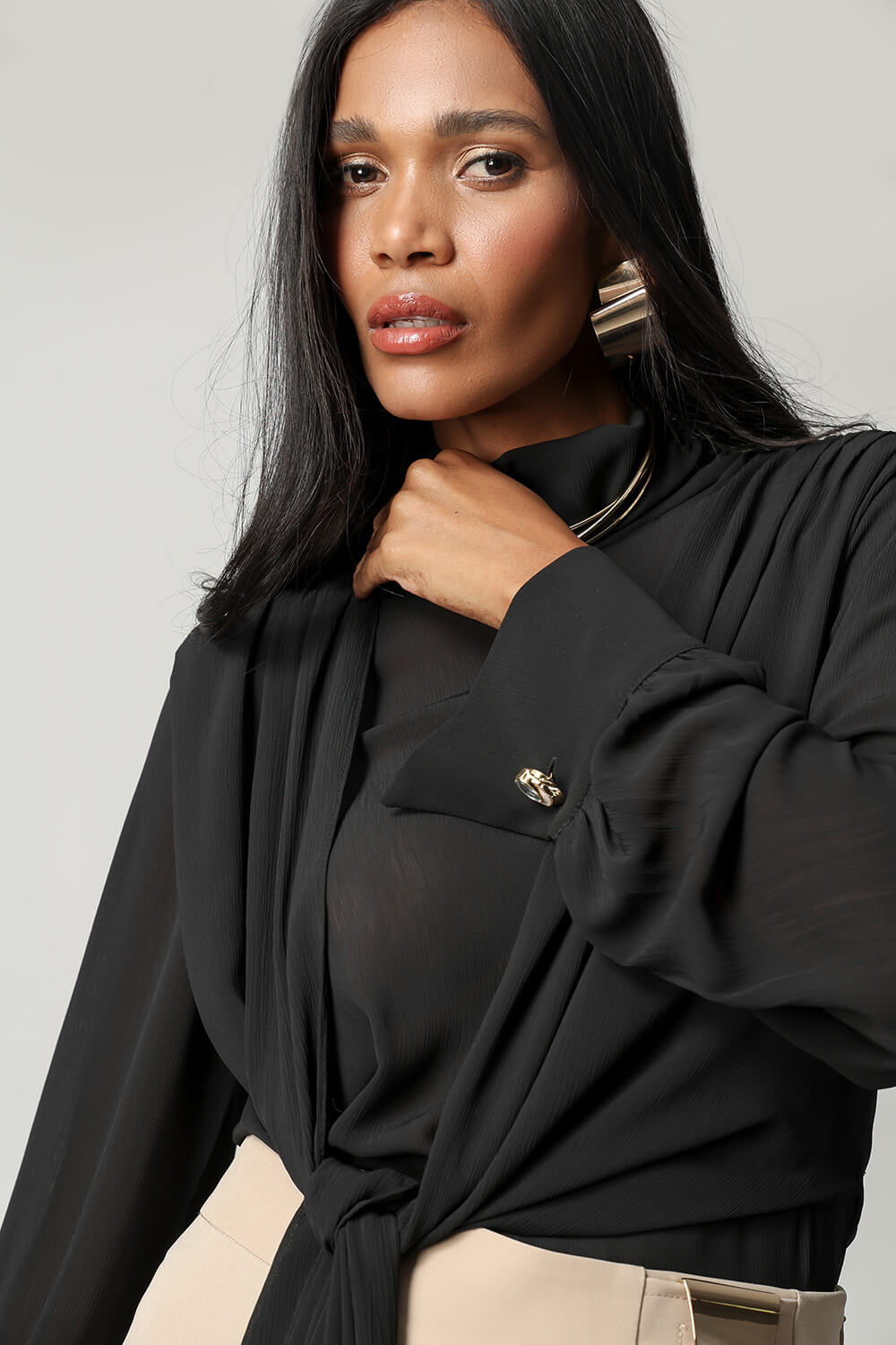 Blusa com detalhe de echarpe aplicado elegante e cheia de personalidade. O charme especial fica por conta da echarpe integrada, que permite uma amarração cruzada, criando diferentes estilos em uma única peça.