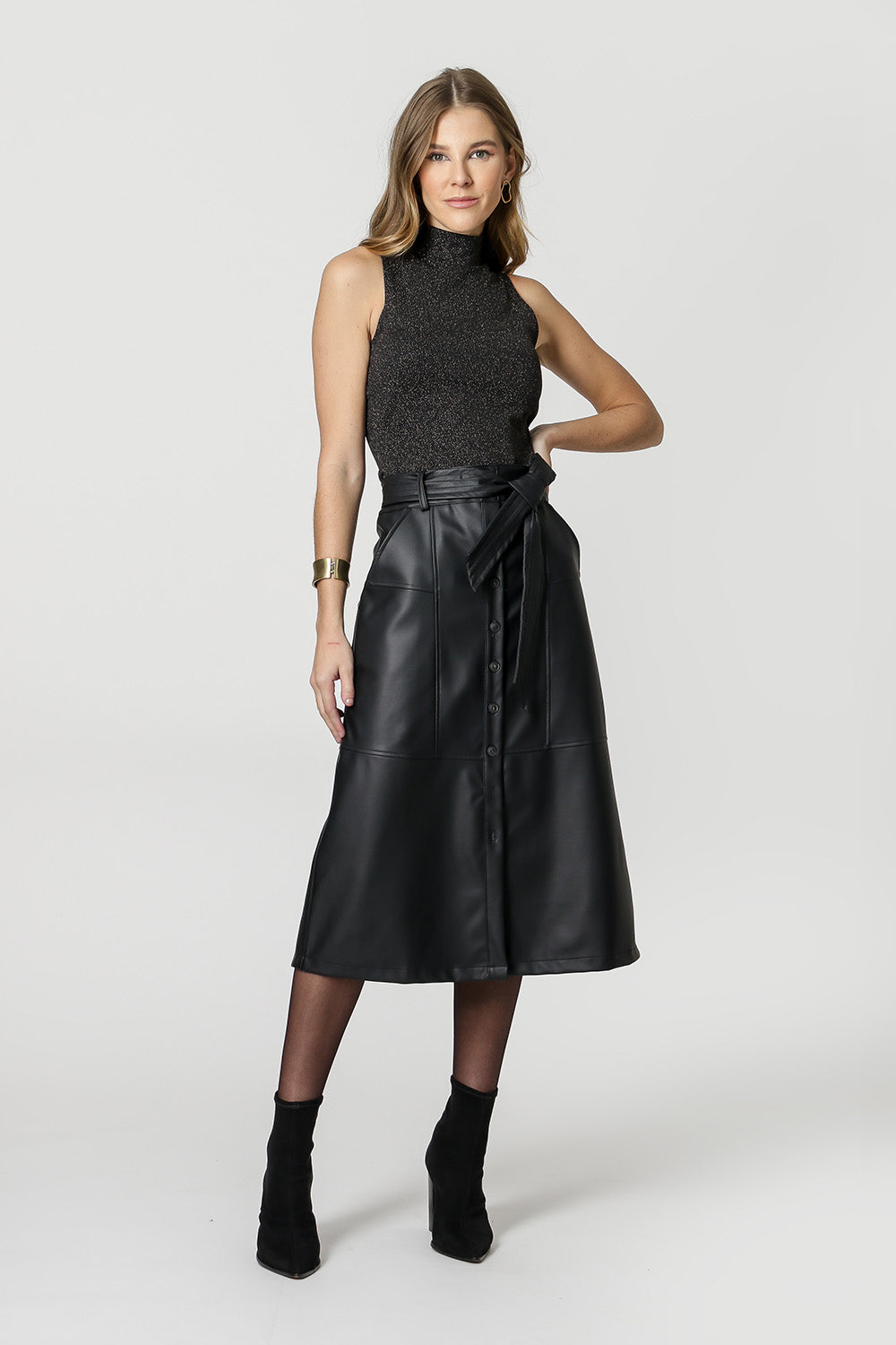 Blusa sem manga com uma charmosa gola, feita em malha com fios de lurex, uma peça prática e versátil para looks night ou mesmo para um evento casual.
