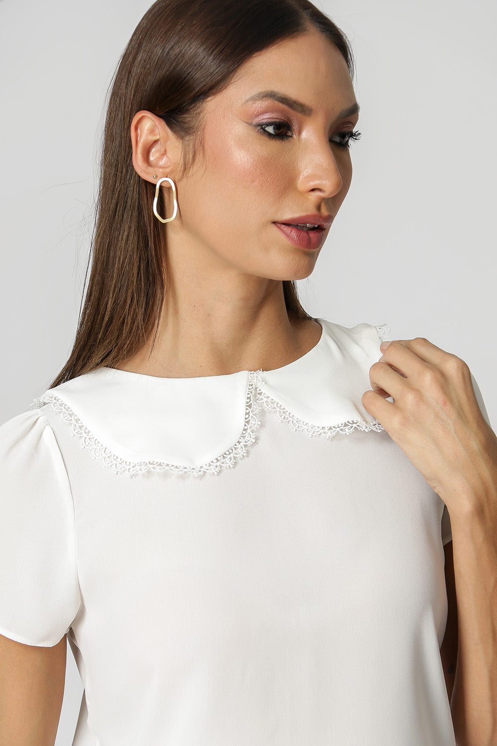 Blusa feita em crepe fluído, com gola big collar e detalhe de renda. Peça delicada, ideal para looks casuais e formais.