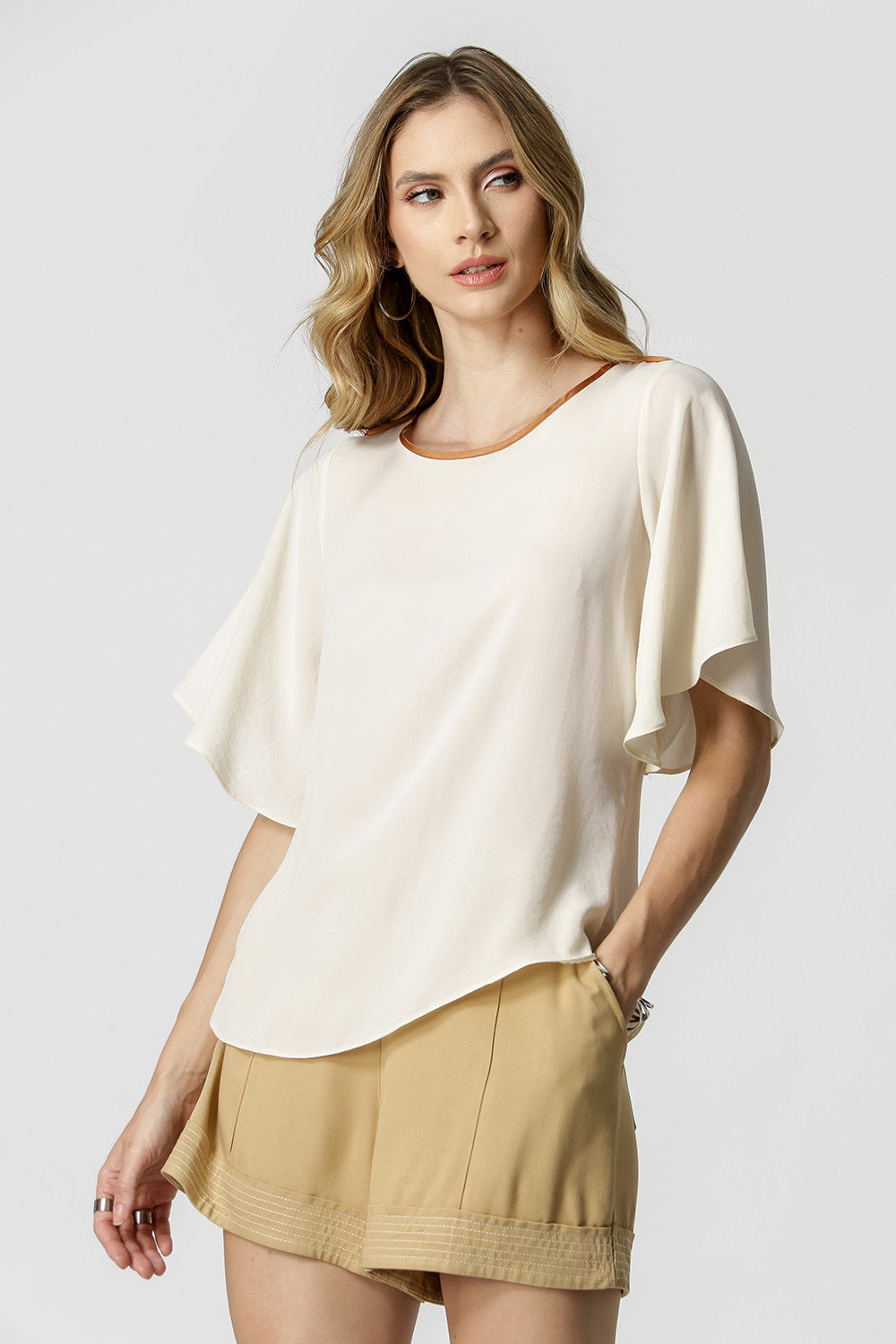 Blusa com modelagem solta nas mangas, abertura gota nas costas e detalhes em cor contraste. É o clássico que você precisa ter no armário. Perfeito ocasiões mais formais.