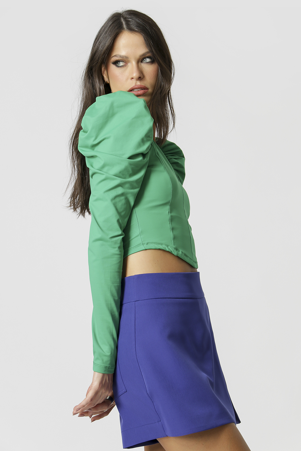 Blusa com manga bufante e com detalhes de pregas. Uma peça confeccionada em malha amni. Peça pefeita para compor vários look casual e com estilo.