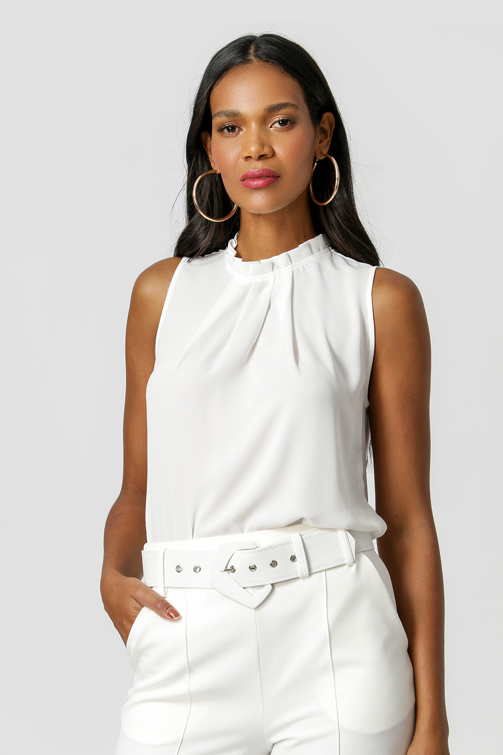 Blusa regata com detalhe de pregas na gola. Confecciona em tecido fluido. Uma peça perfeita que permite diversas composições, para diferentes ocasião e arrasar no look.