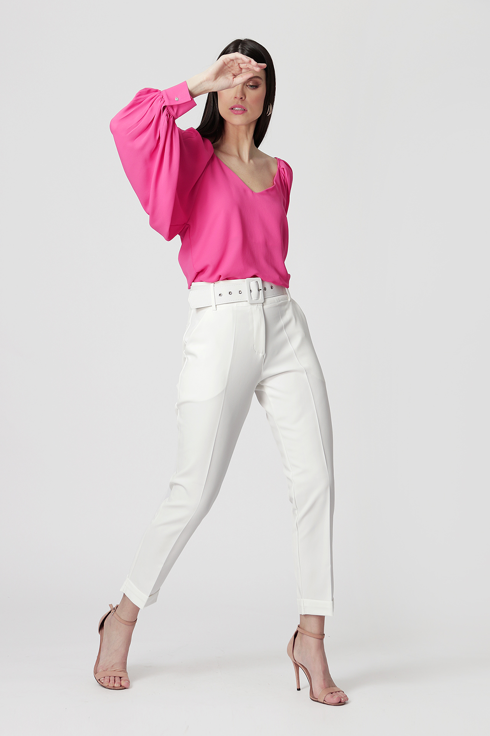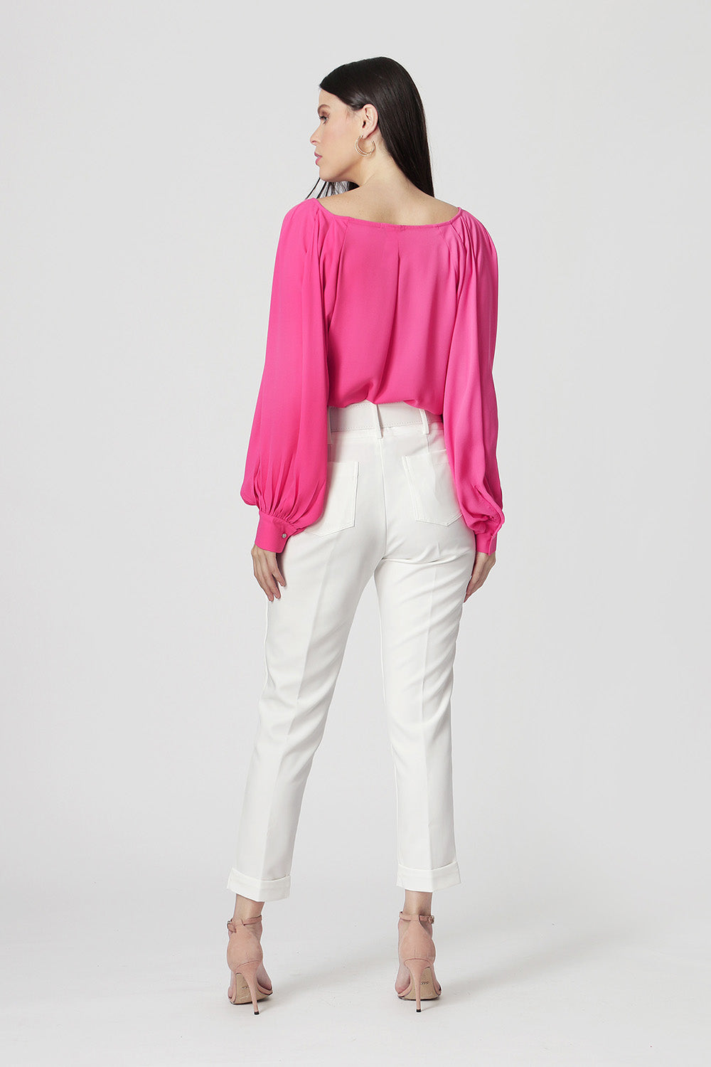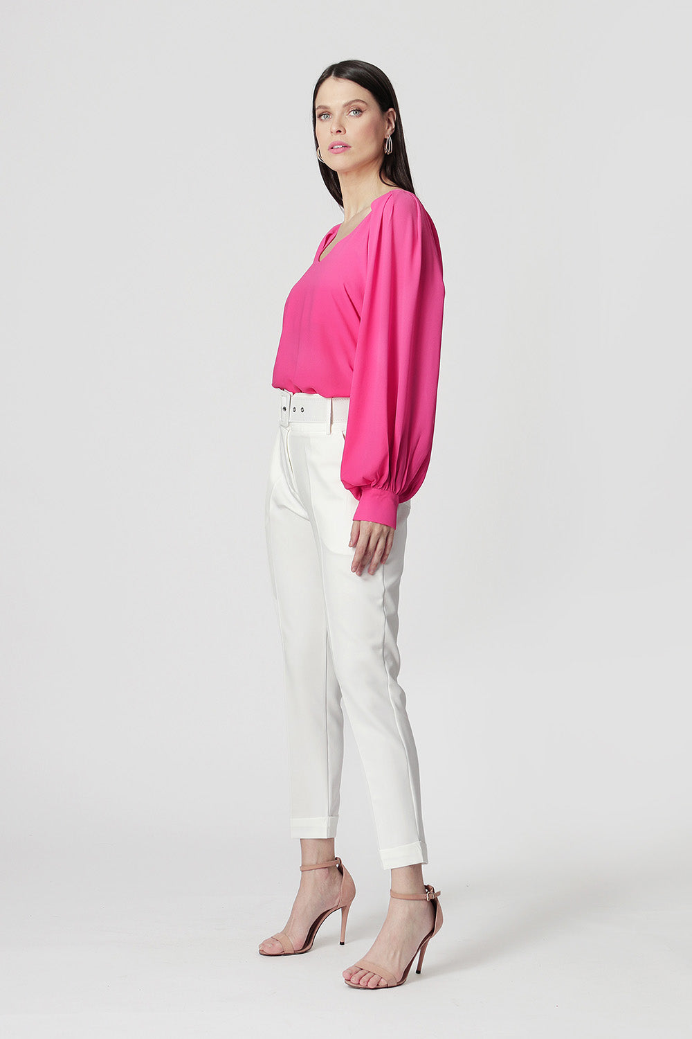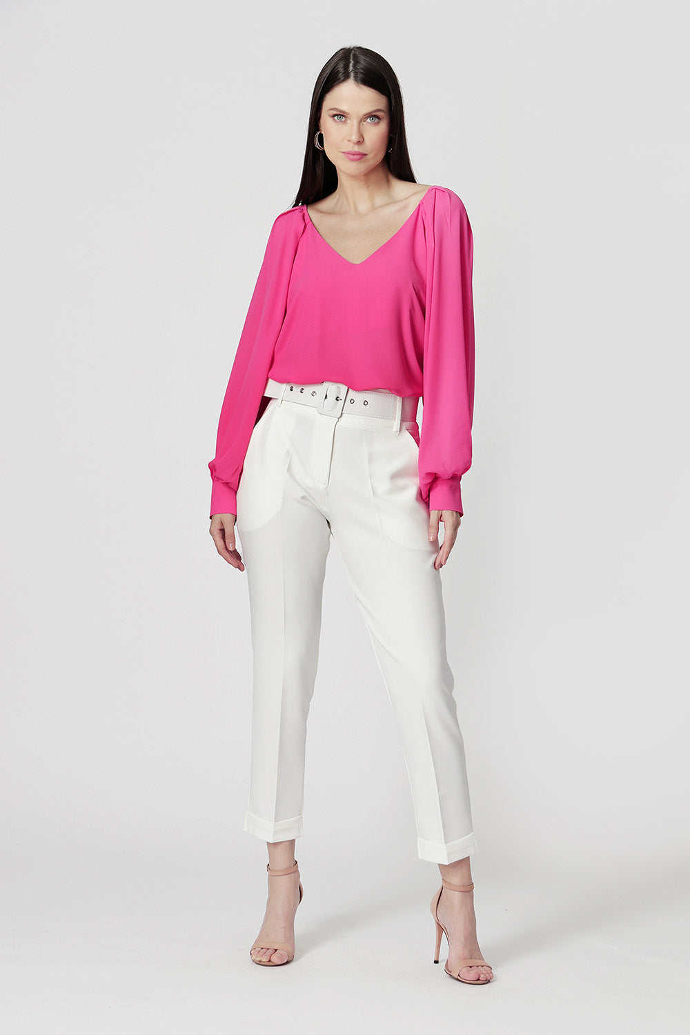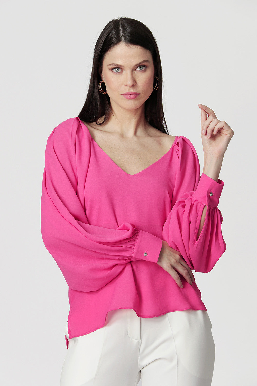 Blusa feita em crepe fluída com decote V, e delicadas pregas no ombro, uma peça com abotoamento no punho com shape mais despojado e elegante, ideal para um look trabalho ou eventos especiais.
