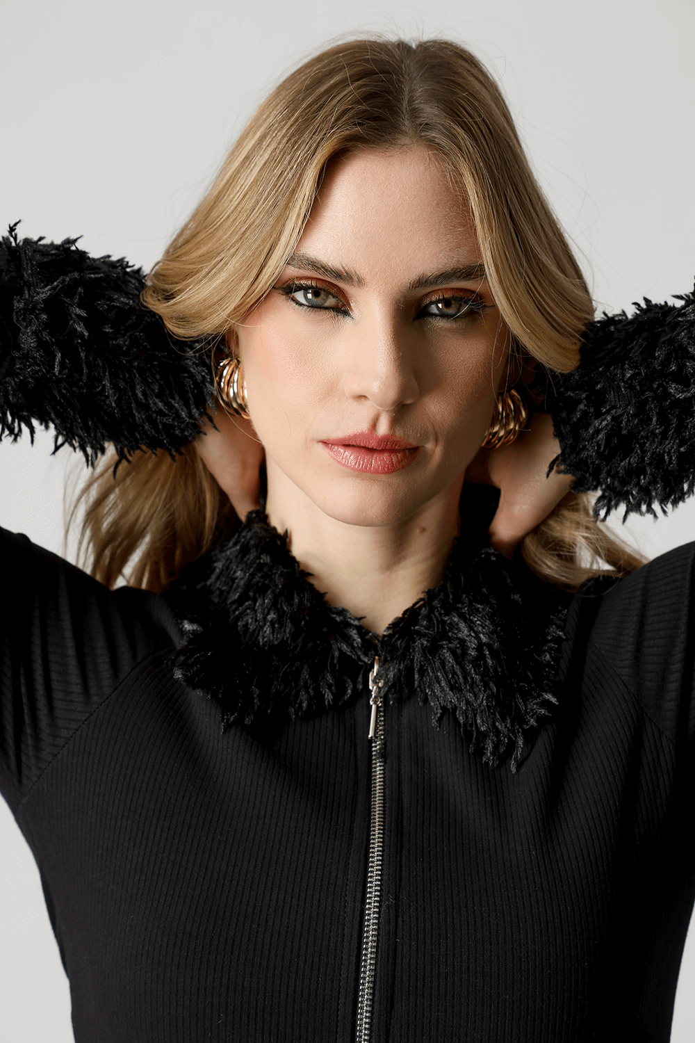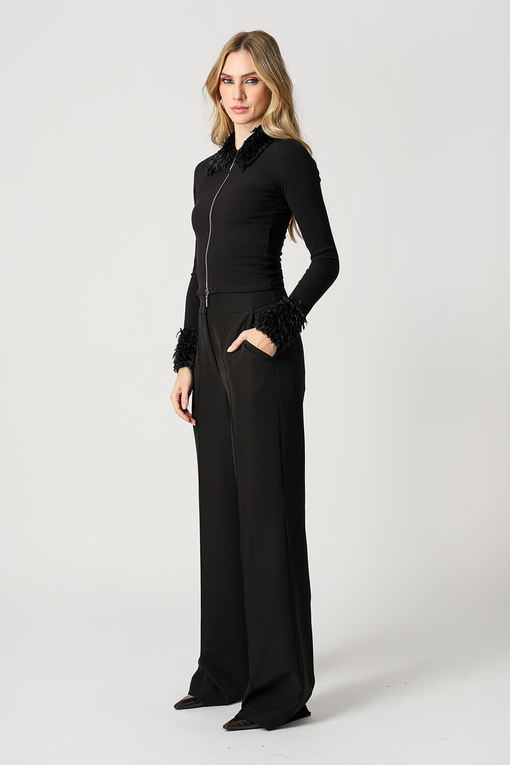 Blusa ajustada com zíper frontal de dois cursores, que permite diferentes formas de uso, desde um visual mais discreto até um decote ousado. A proposta versátil garante estilo em composições casuais ou mais marcantes.