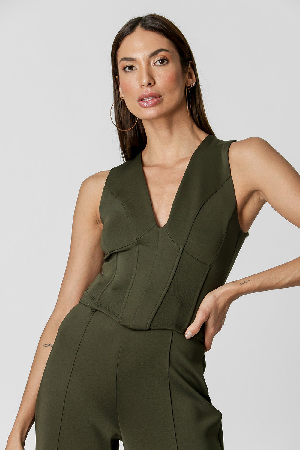Blusa corset confeccionada em neoprene com shape ajustado ao corpo, decote em V, recortes com pespontos aparente, e estrutura com barbatanas e alças grossas. É uma peça única que pode ser usada tanto de maneira mais cool e descolada quanto de maneira mais elegante.