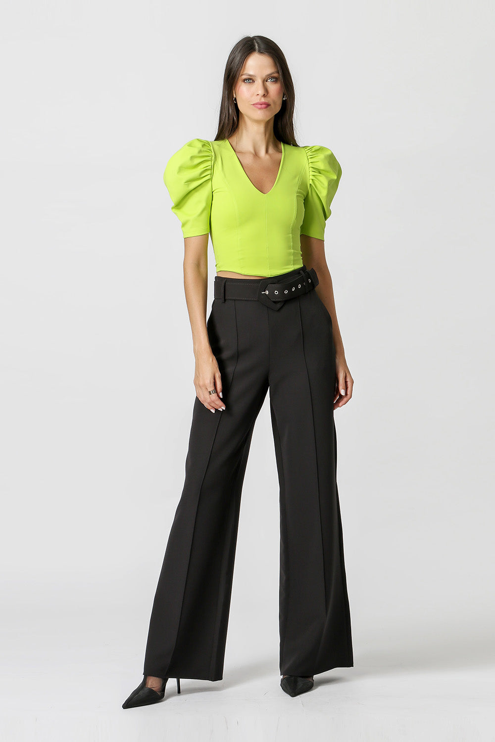 Blusa de comprimento cropped, confeccionada em malha AMNI com mangas bufantes. Peça cool e super despojada, perfeita para looks casuais.