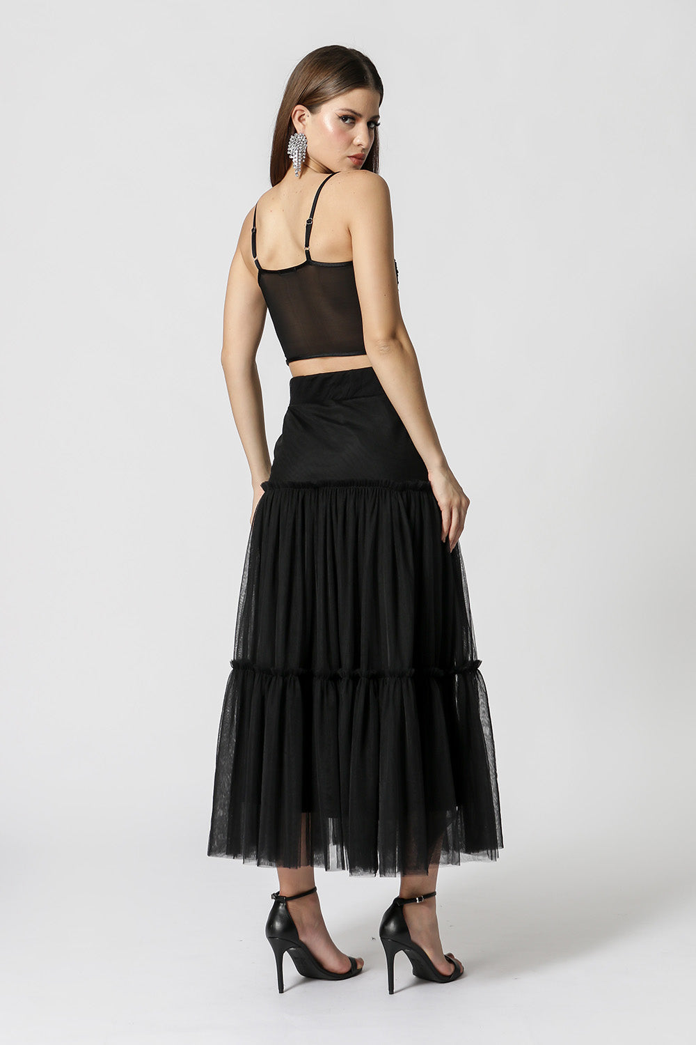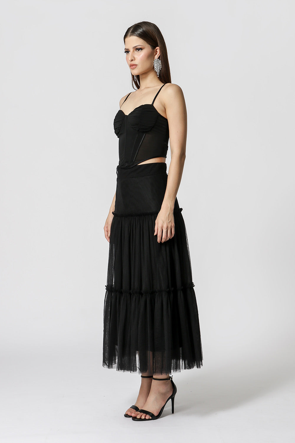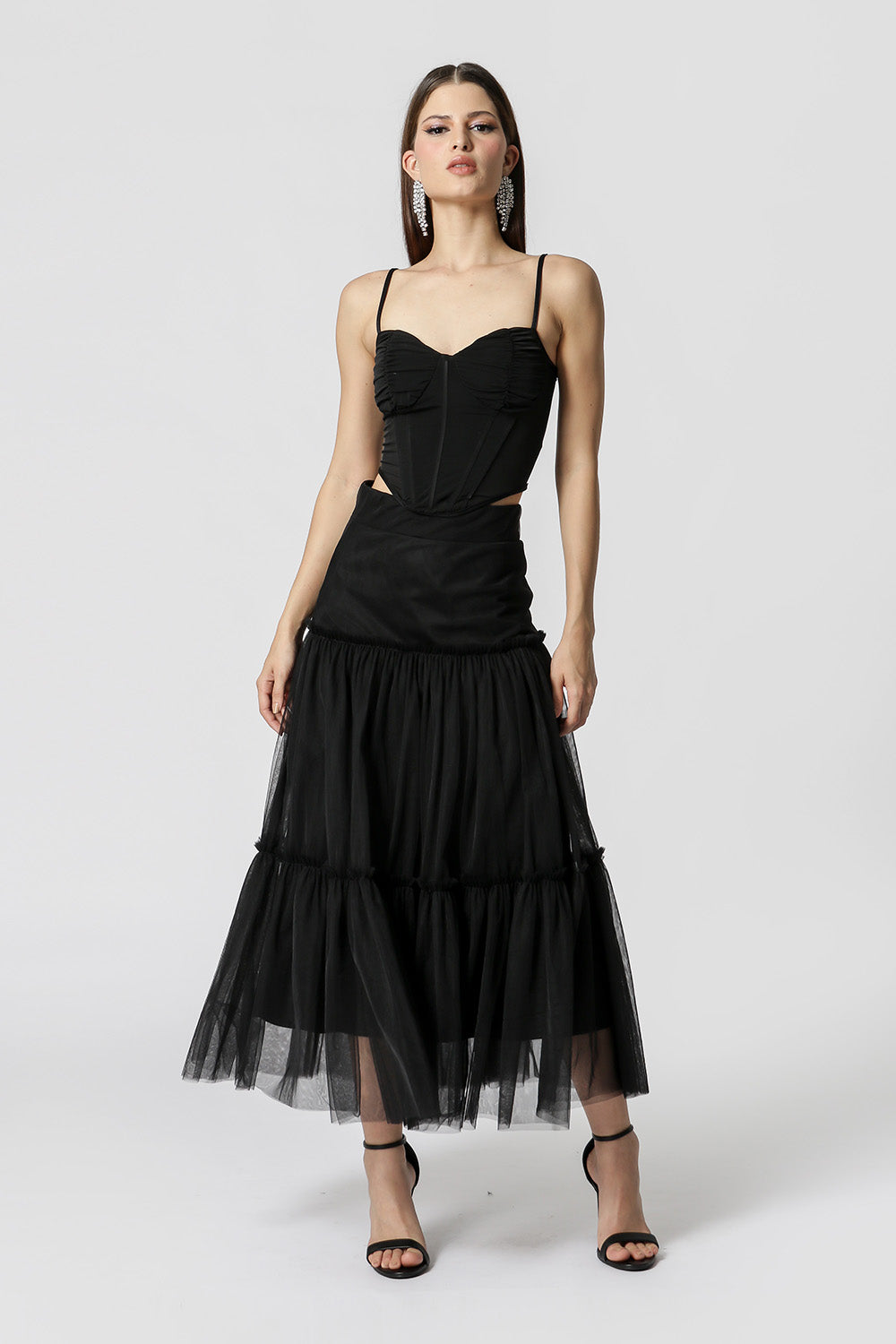 Blusa corset com alça reguláveis. Peça confeccionada em tecido malha e tule. Uma peça com shape justo que valoriza a silhueta e que pode ser usado em diversos looks night.