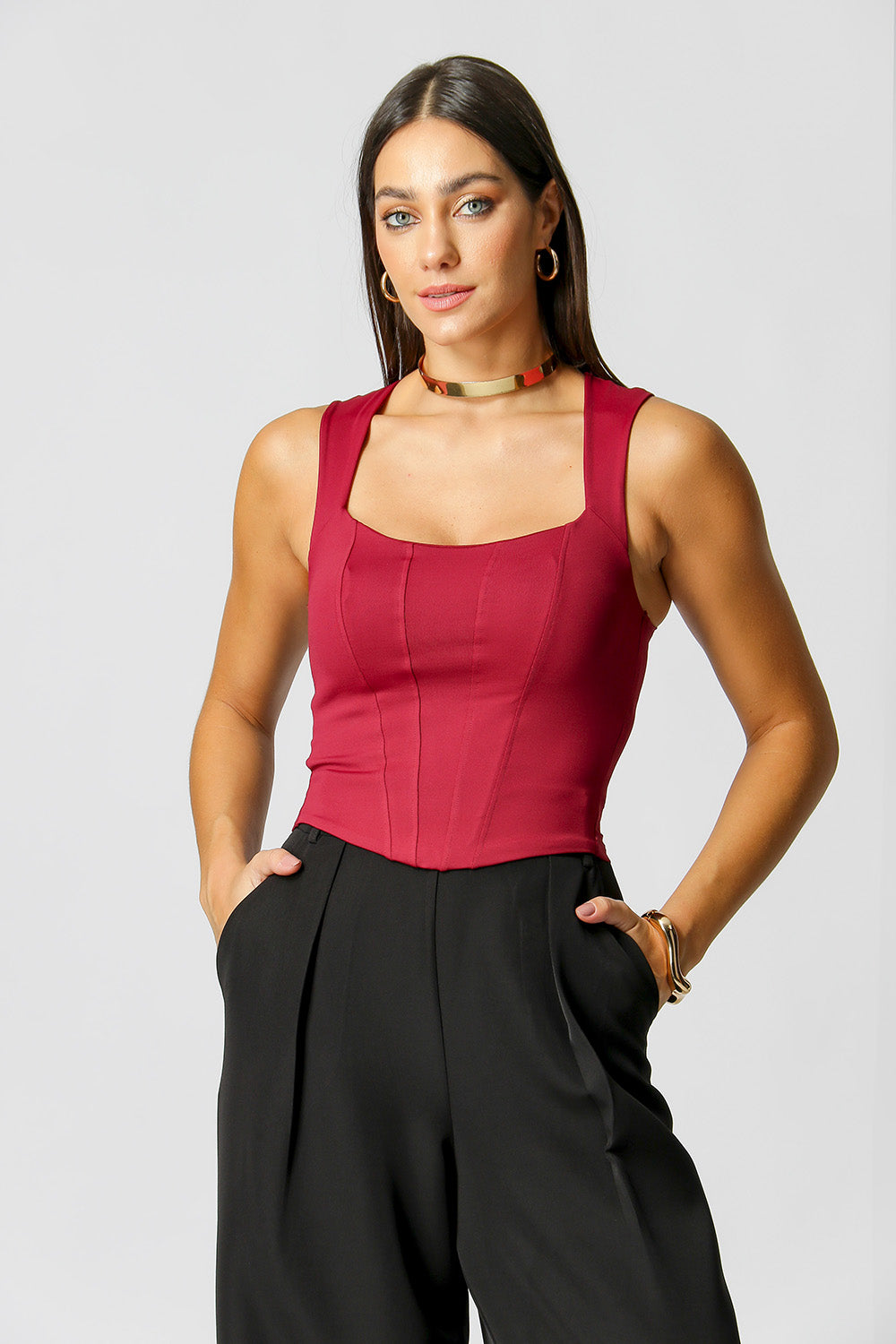 Blusa com inspiração corset, com recortes que valorizam a silhueta feminina, uma peça feita malha amni. É o básico diferenciado que você estava procurando!