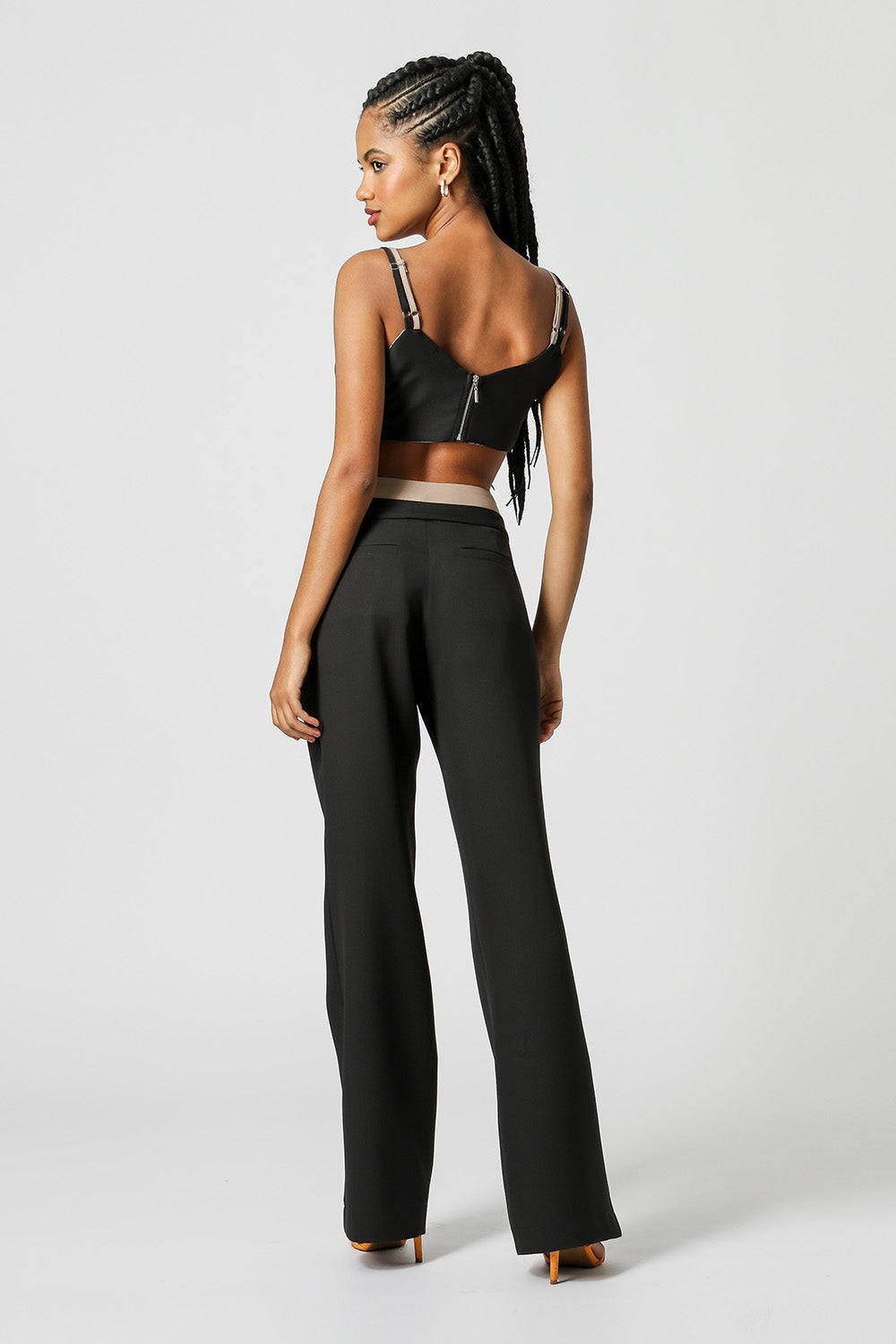 Blusa com comprimento cropped e shape mais ajustado ao corpo. Decote V, alças finas e zíper metal nas costas. Detalhe de alça dupla bicolor. Perfeita para looks de verão.