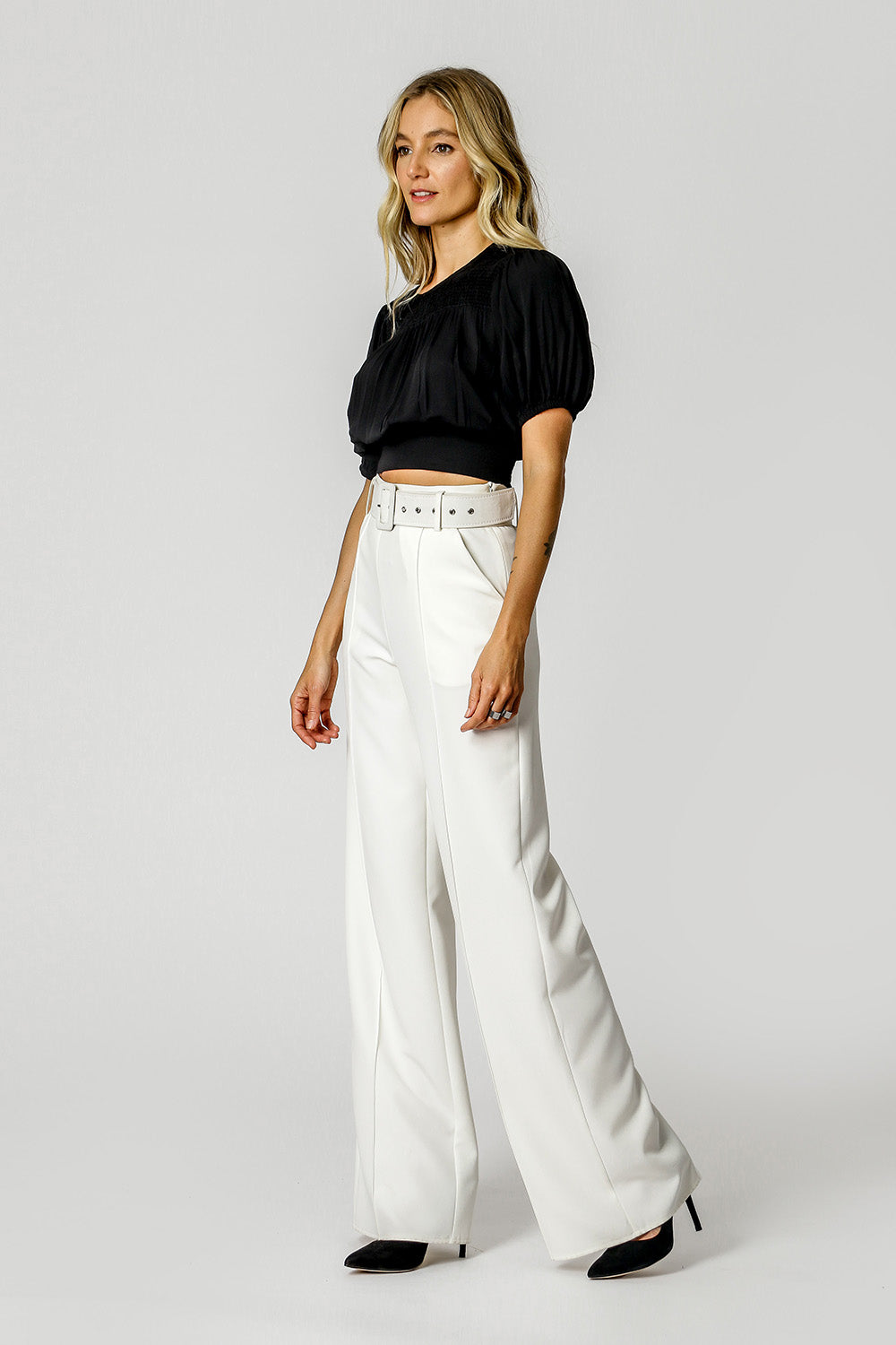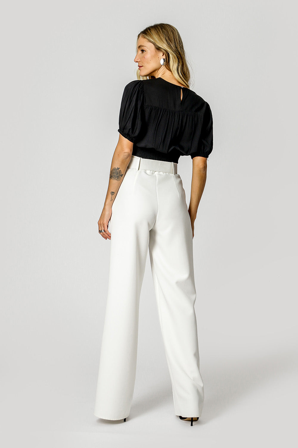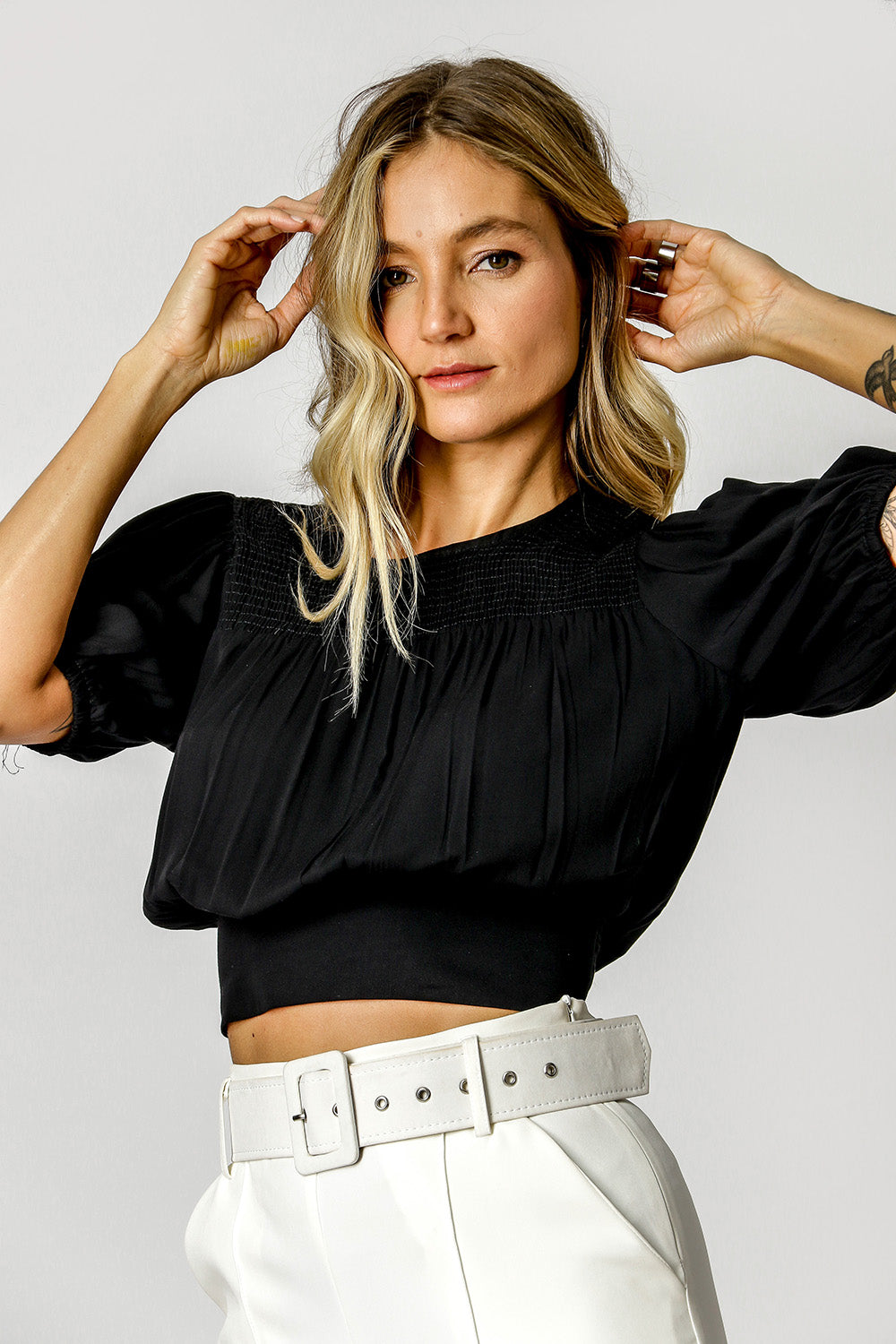 Blusa cropped feito em viscose fluída, com detalhe de lastex no decote, uma peça prática para compor looks casuais.