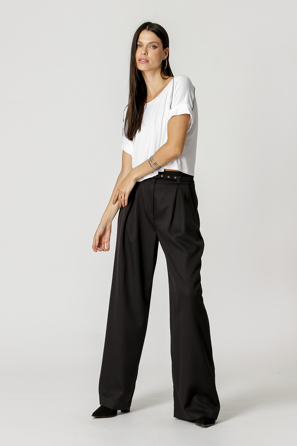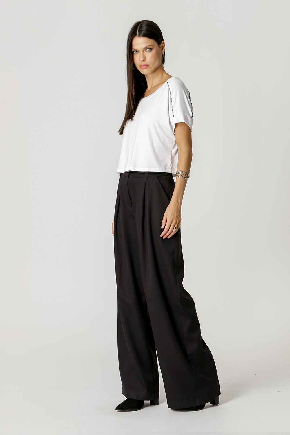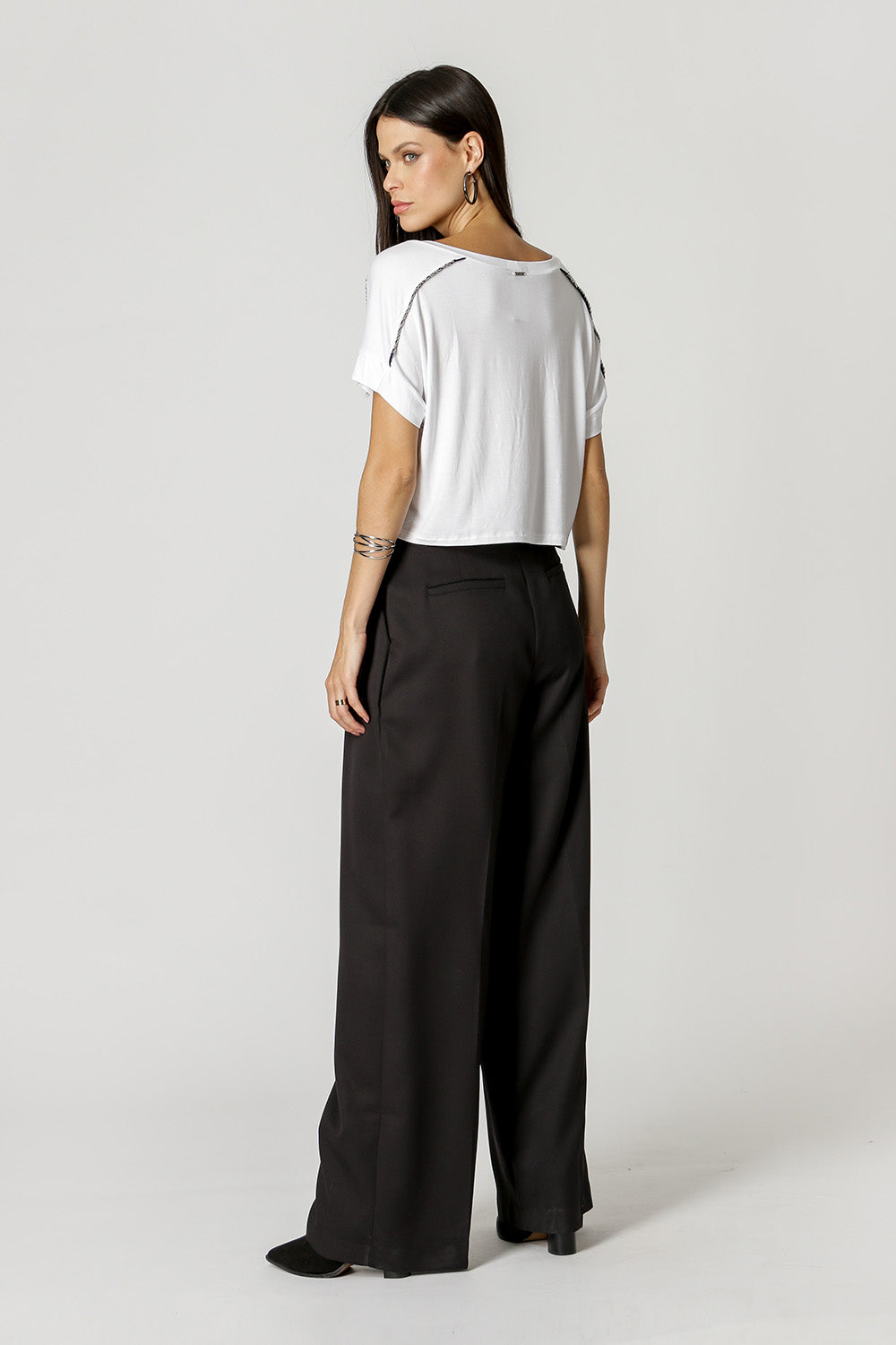 Blusa Cropped com detalhe de aviamento no recorte. Confeccionada em tecido visco pet. Peça básica, confortável para compor vários look casual.