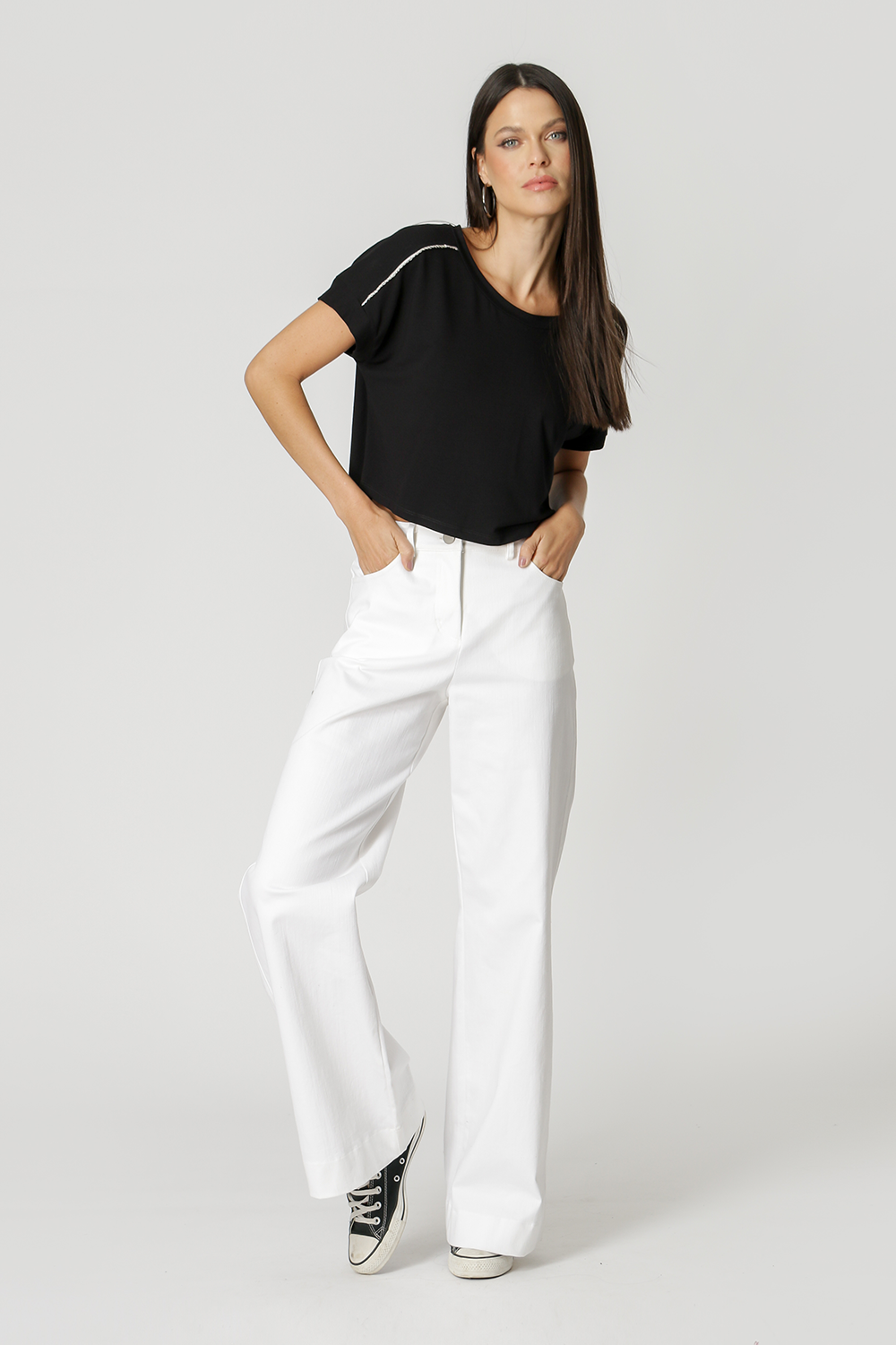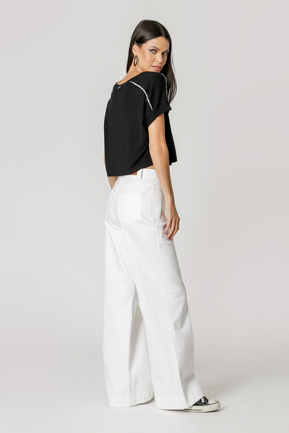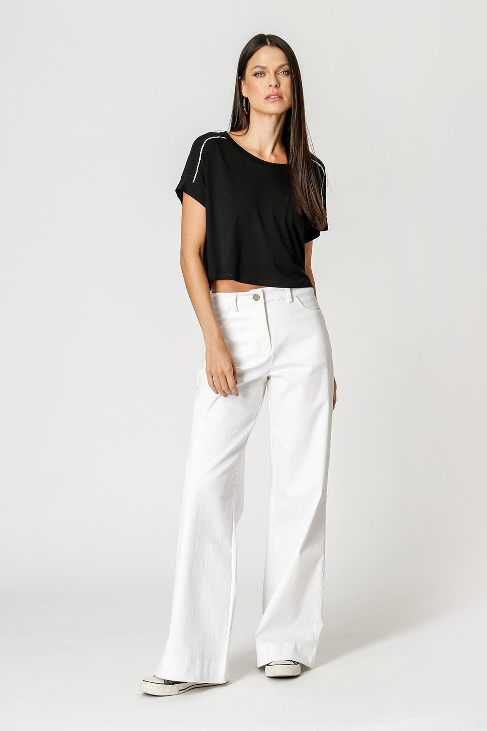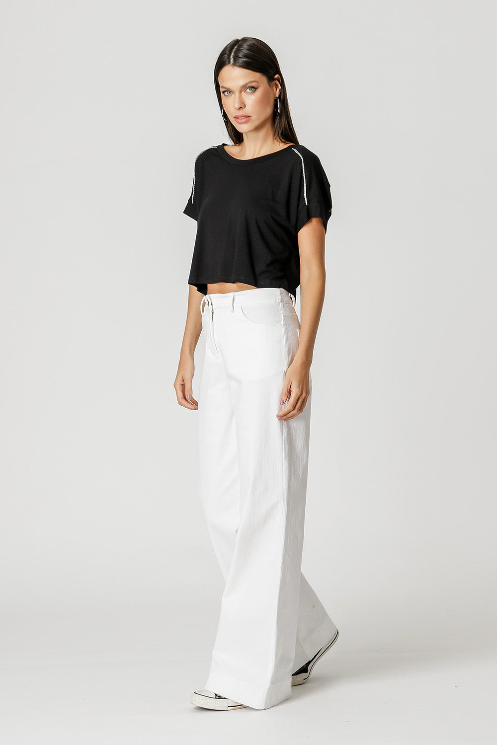 Blusa Cropped com detalhe de aviamento no recorte. Confeccionada em tecido visco pet. Peça básica, confortável para compor vários look casual.