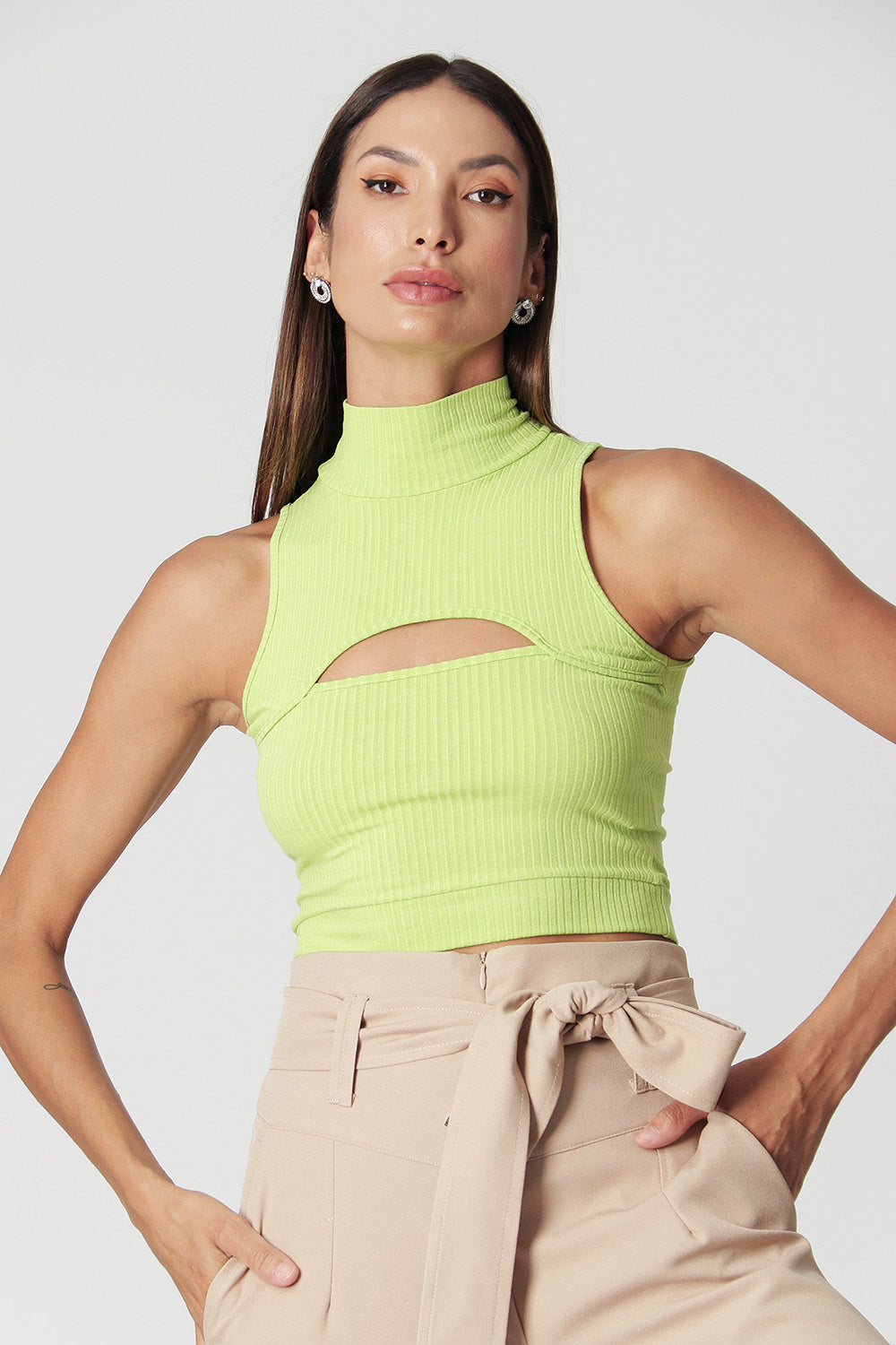 Blusa cropped com cava americana, gola e detalhe decote vazado. Feito em malha canelada. Peça básica, perfeita para trabalhar looks com sobreposições.