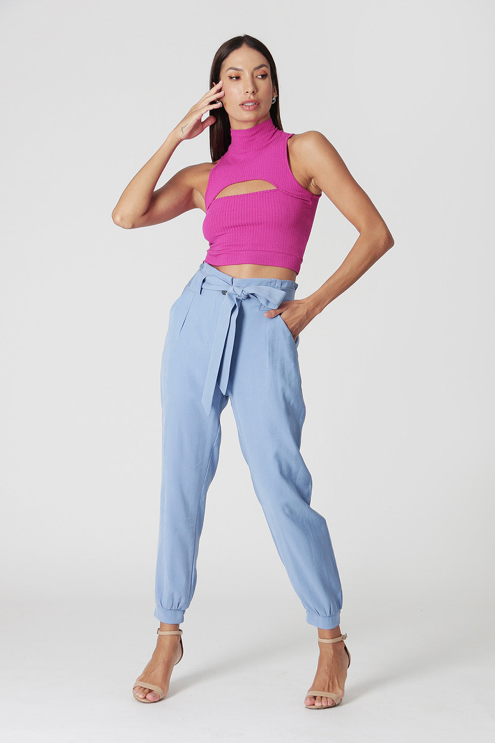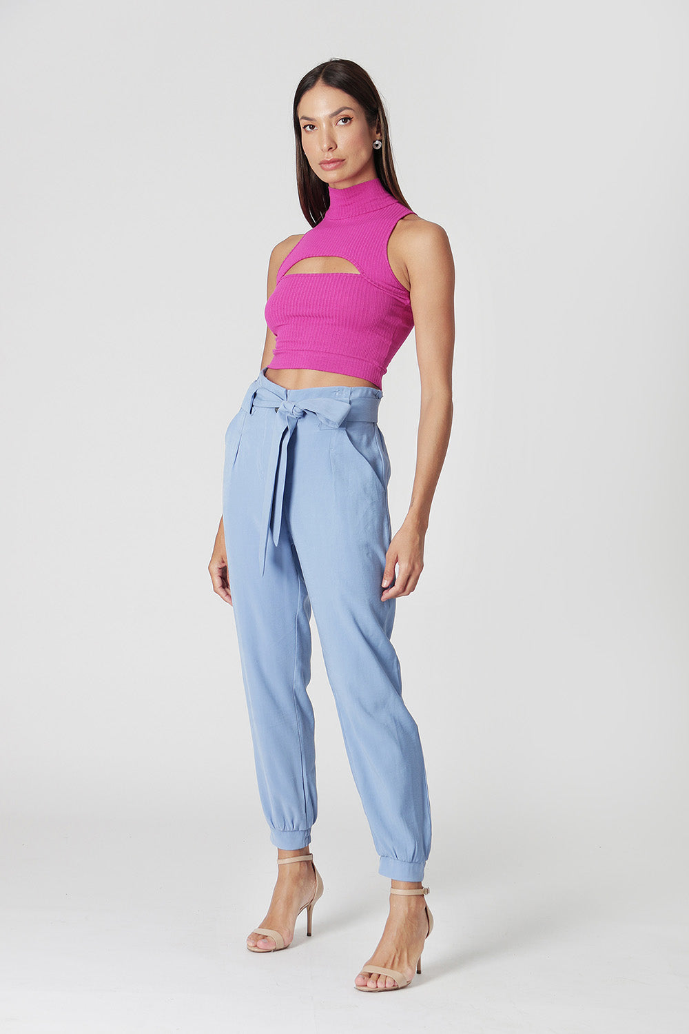 Blusa cropped com cava americana, gola e detalhe decote vazado. Feito em malha canelada. Peça básica, perfeita para trabalhar looks com sobreposições.