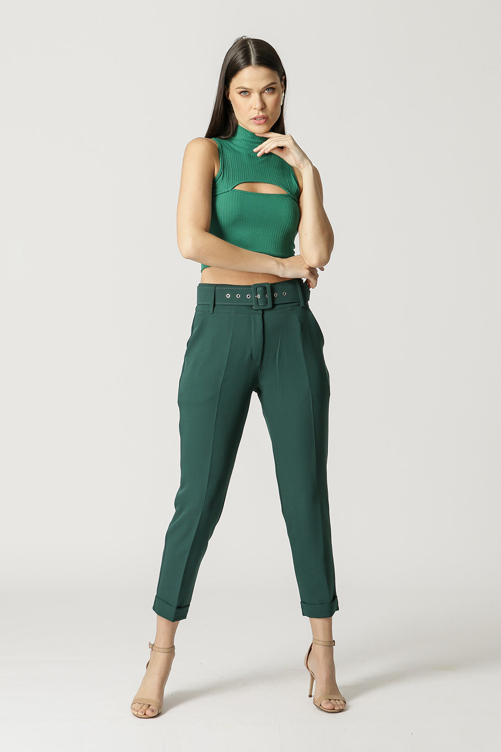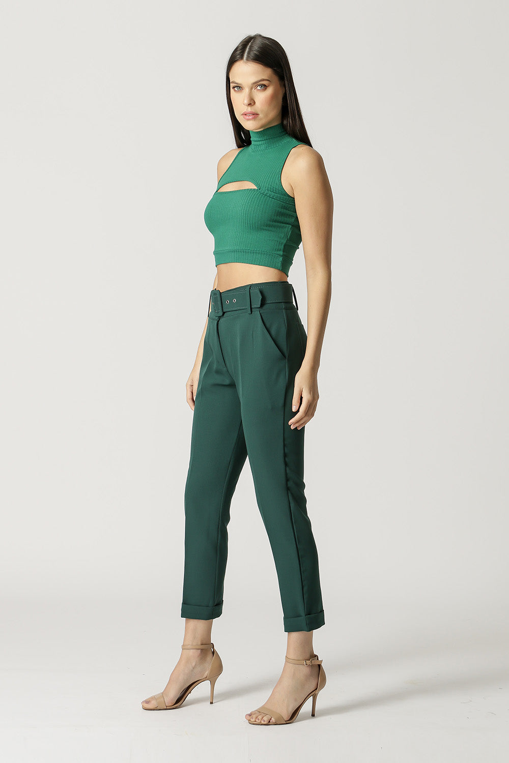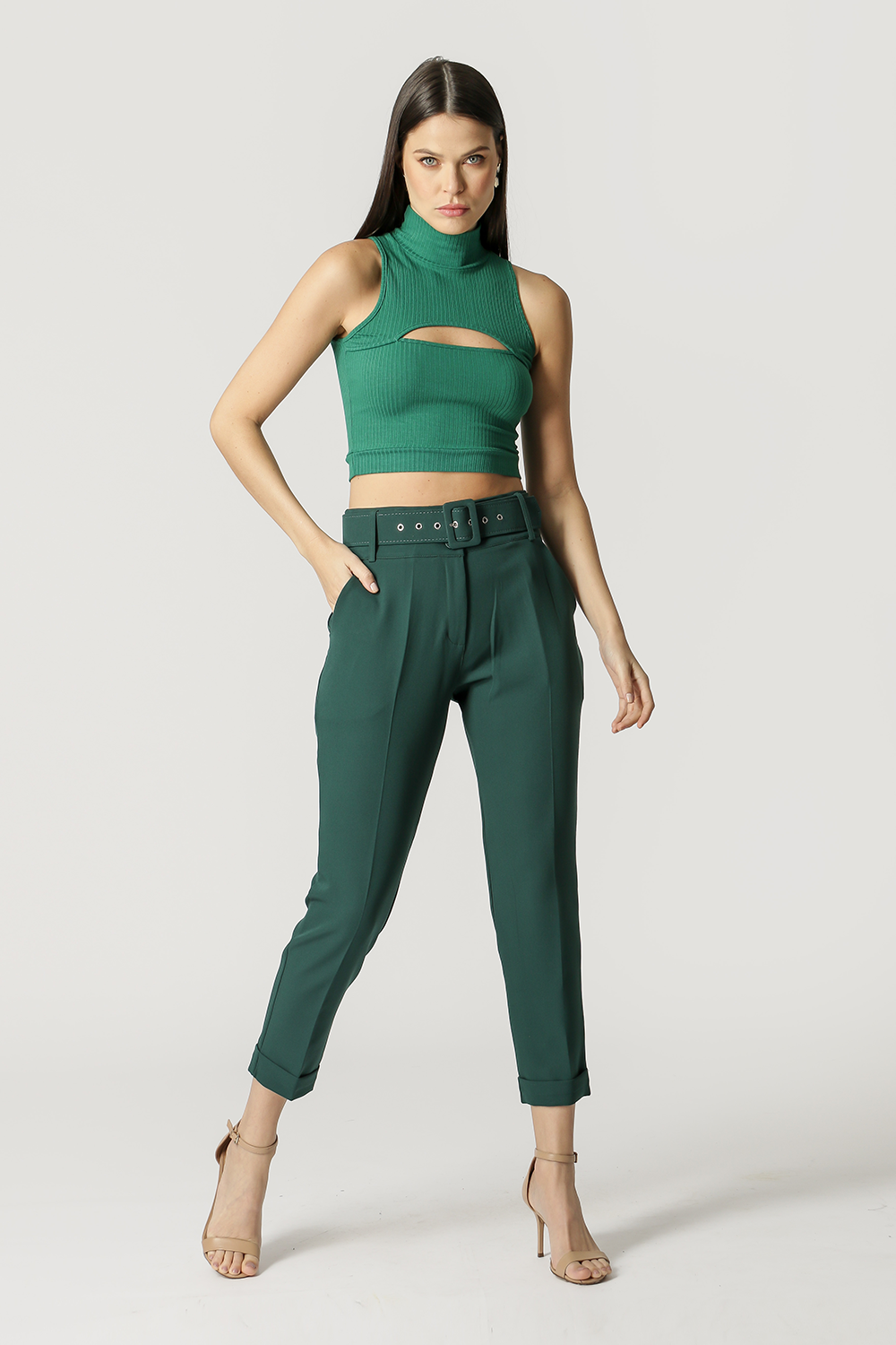 Blusa cropped com cava americana, gola e detalhe decote vazado. Feito em malha canelada. Peça básica, perfeita para trabalhar looks com sobreposições.