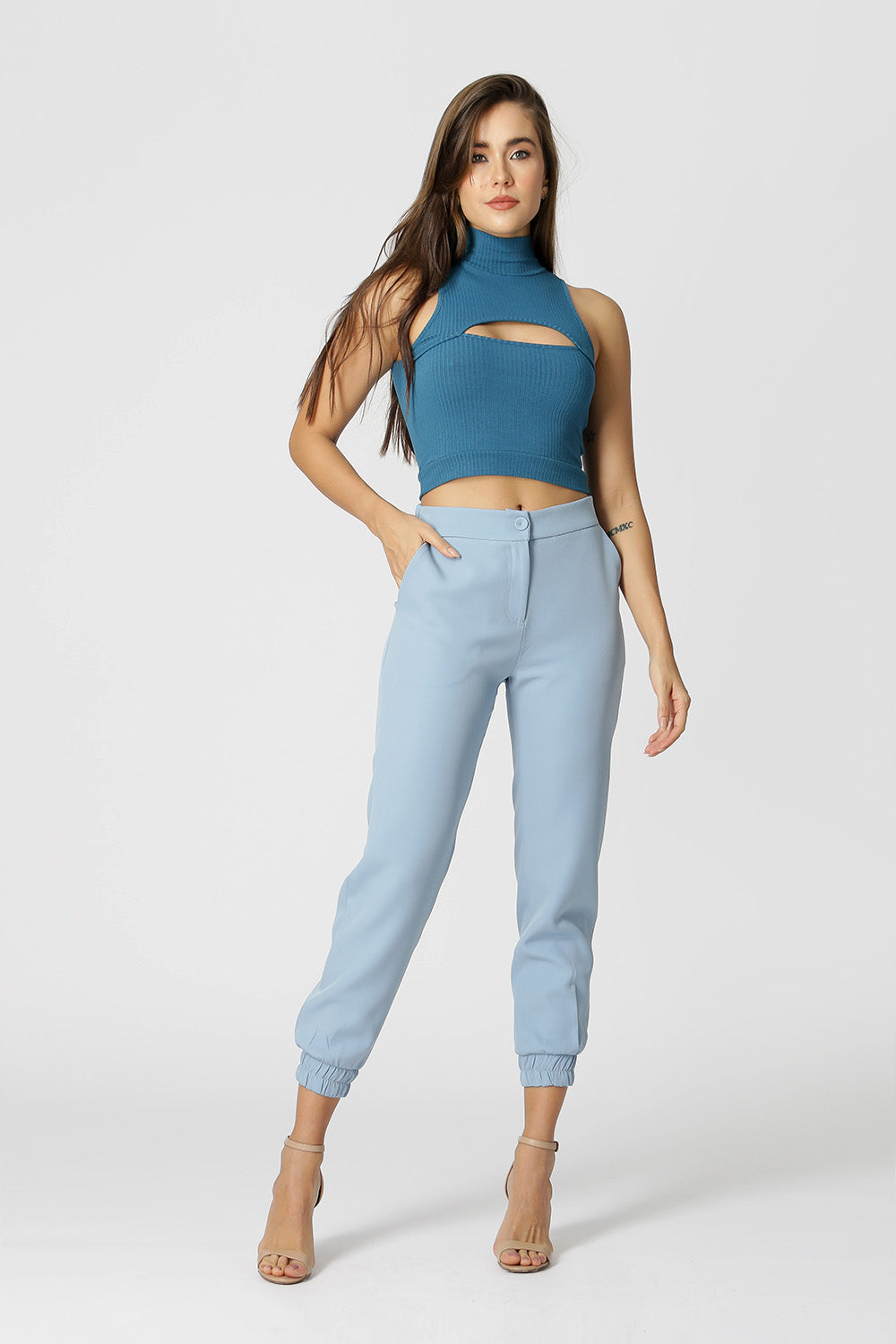 Blusa cropped com cava americana, gola e detalhe decote vazado. Feito em malha canelada. Peça básica, perfeita para trabalhar looks com sobreposições.
