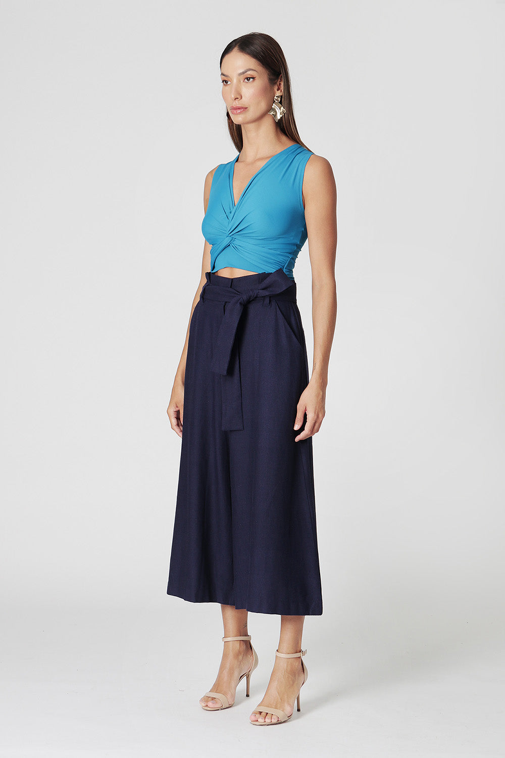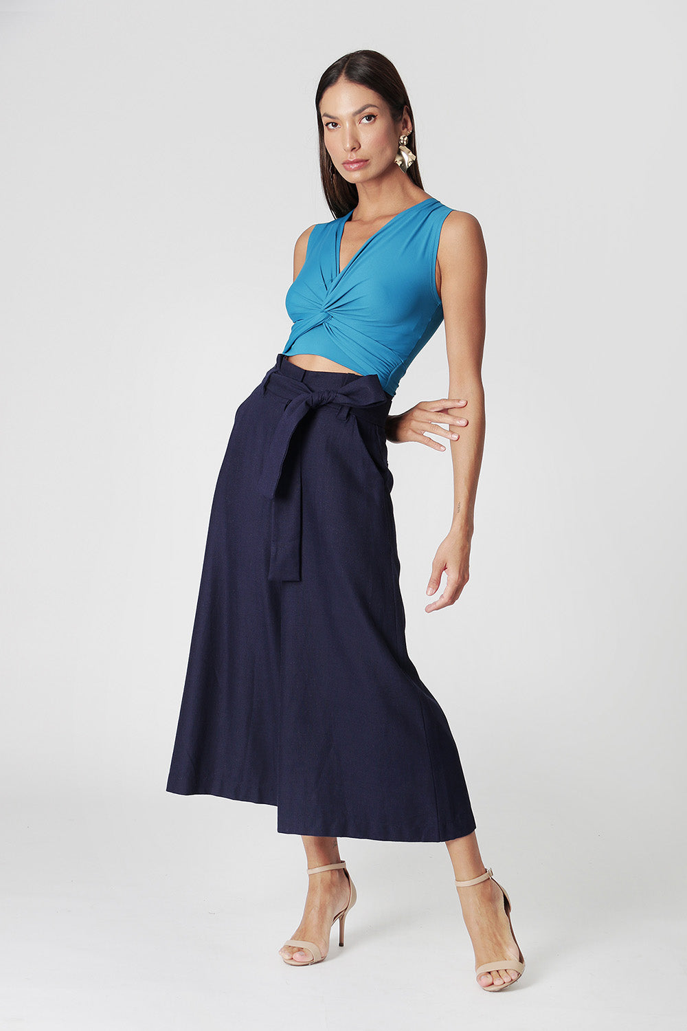 Blusa cropped em malha de poliamida e elastano. Com decote em V, tem trabalho de torção na frente, que deixa a peça diferenciada e descolada. Ideal para compor looks com calça ou saia alta.