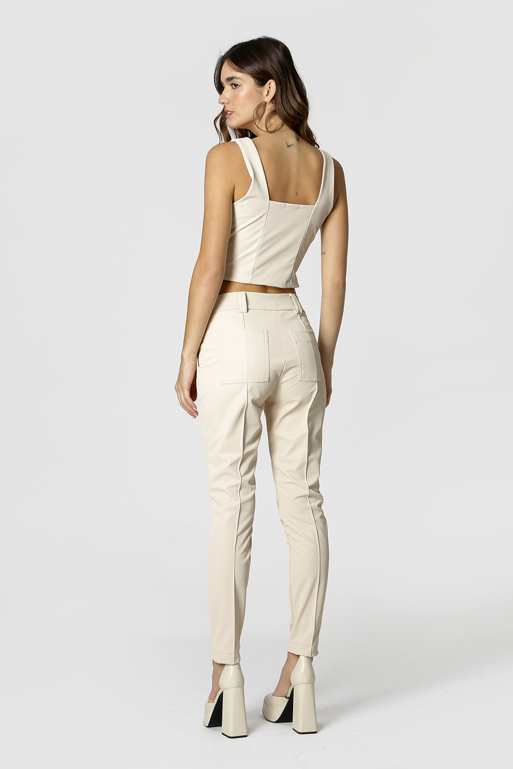 Blusa cropped com recortes. Peça Confeccionada em tecido couro sintético. Uma peça perfeita para deixar seu visual moderno e se adequando para diversas ocasiões.