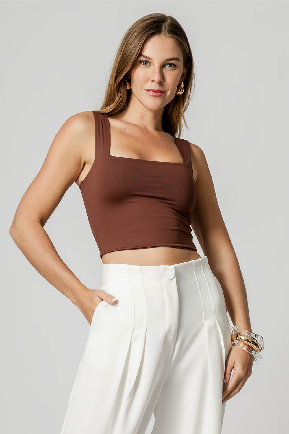 Cropped básico e versátil com alças largas, ideal para compor looks confortáveis e estilosos. Confeccionado em tecido Amni, que oferece toque macio e elasticidade. Perfeita para compor looks casuais ou esportivos com estilo.