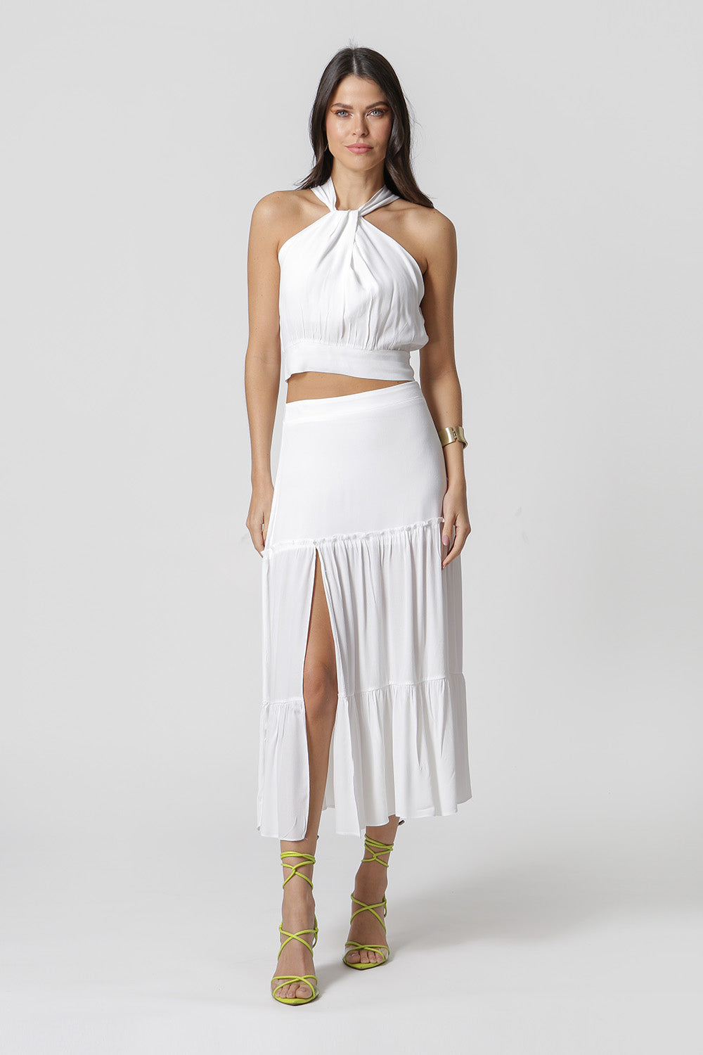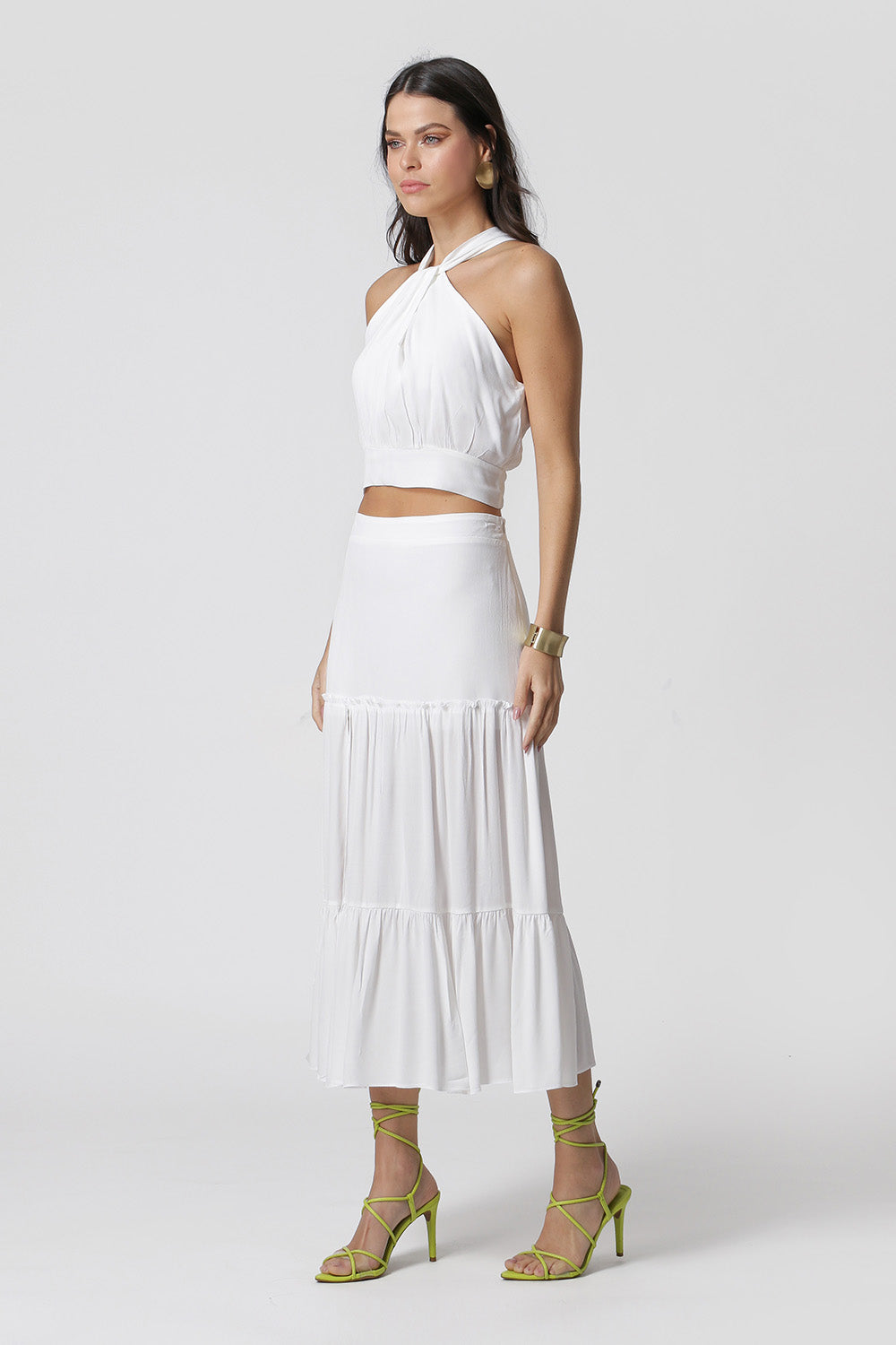 Blusa cropped com cava americana, pala, elástico na pala costas e transpasse no decote. Uma peça feita em viscose creponada, perfeita para os dias mais quentes.