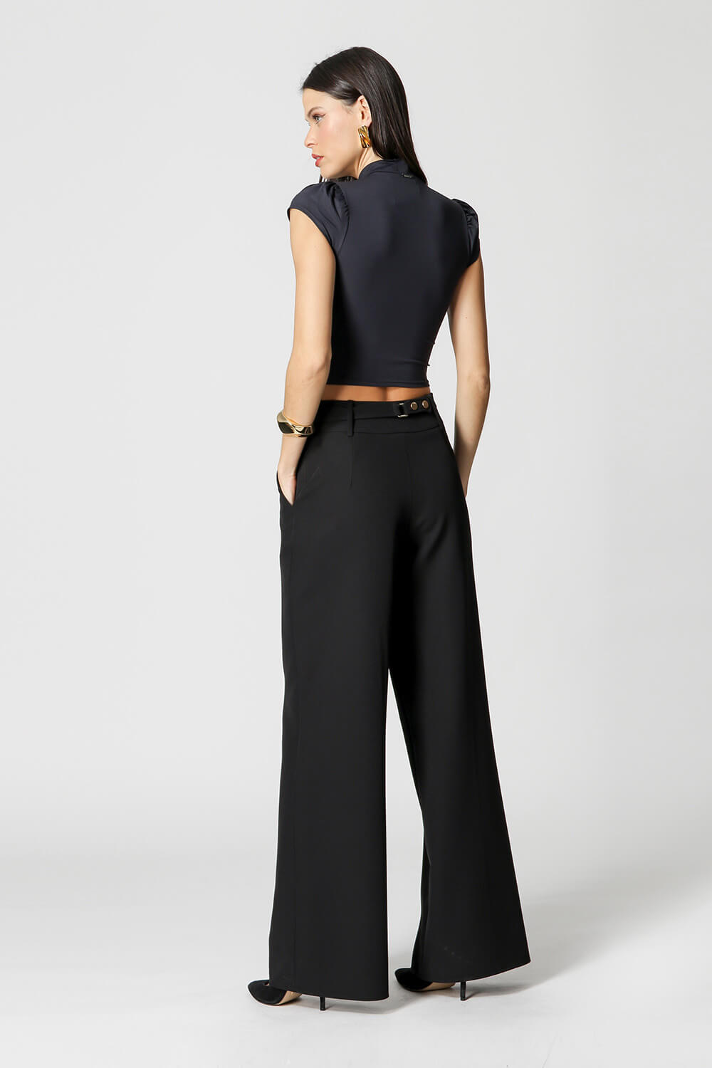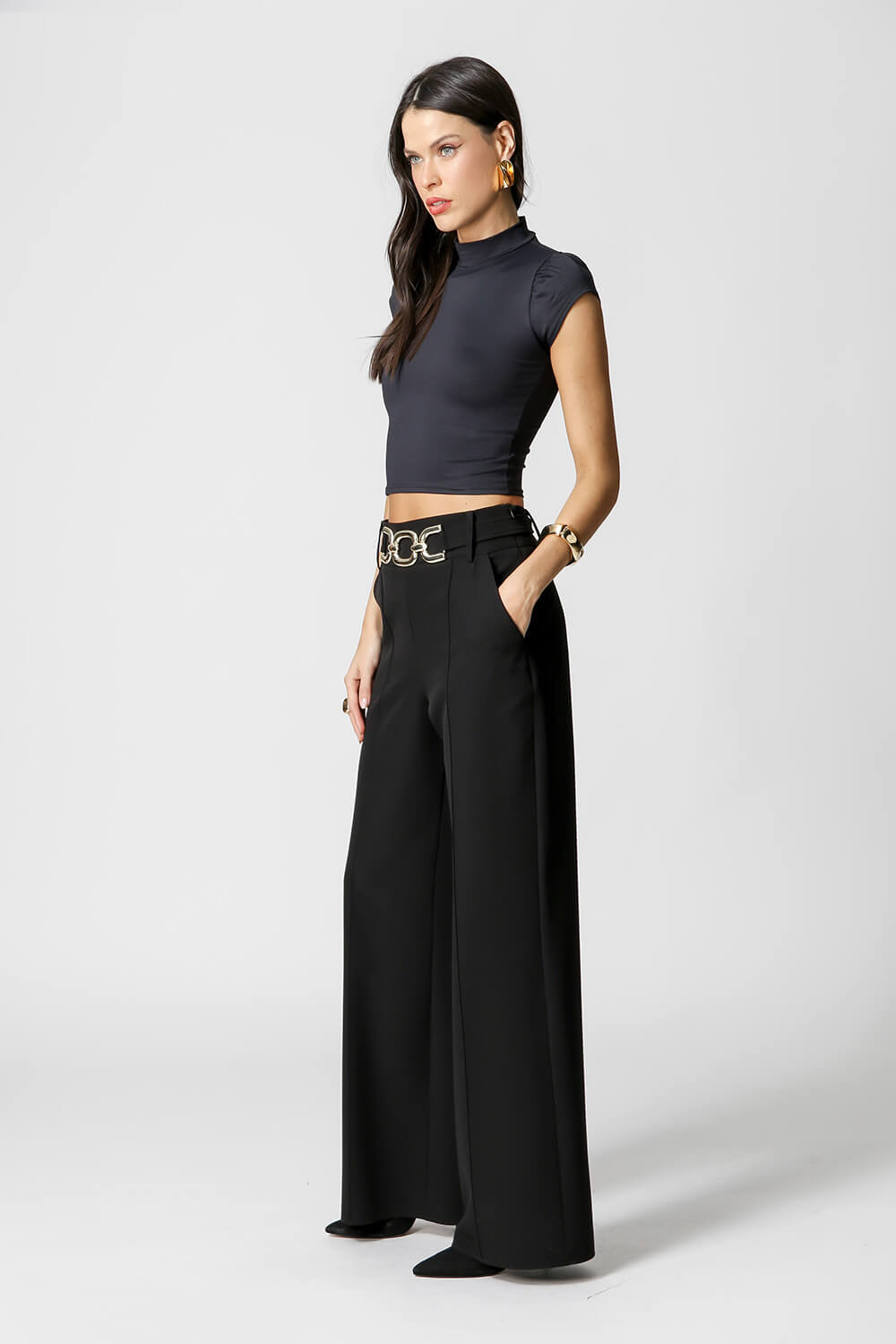Blusa confeccionada em malha, com comprimento cropped, shape justo ao corpo, gola alta e detalhe de mangas levemente franzidas