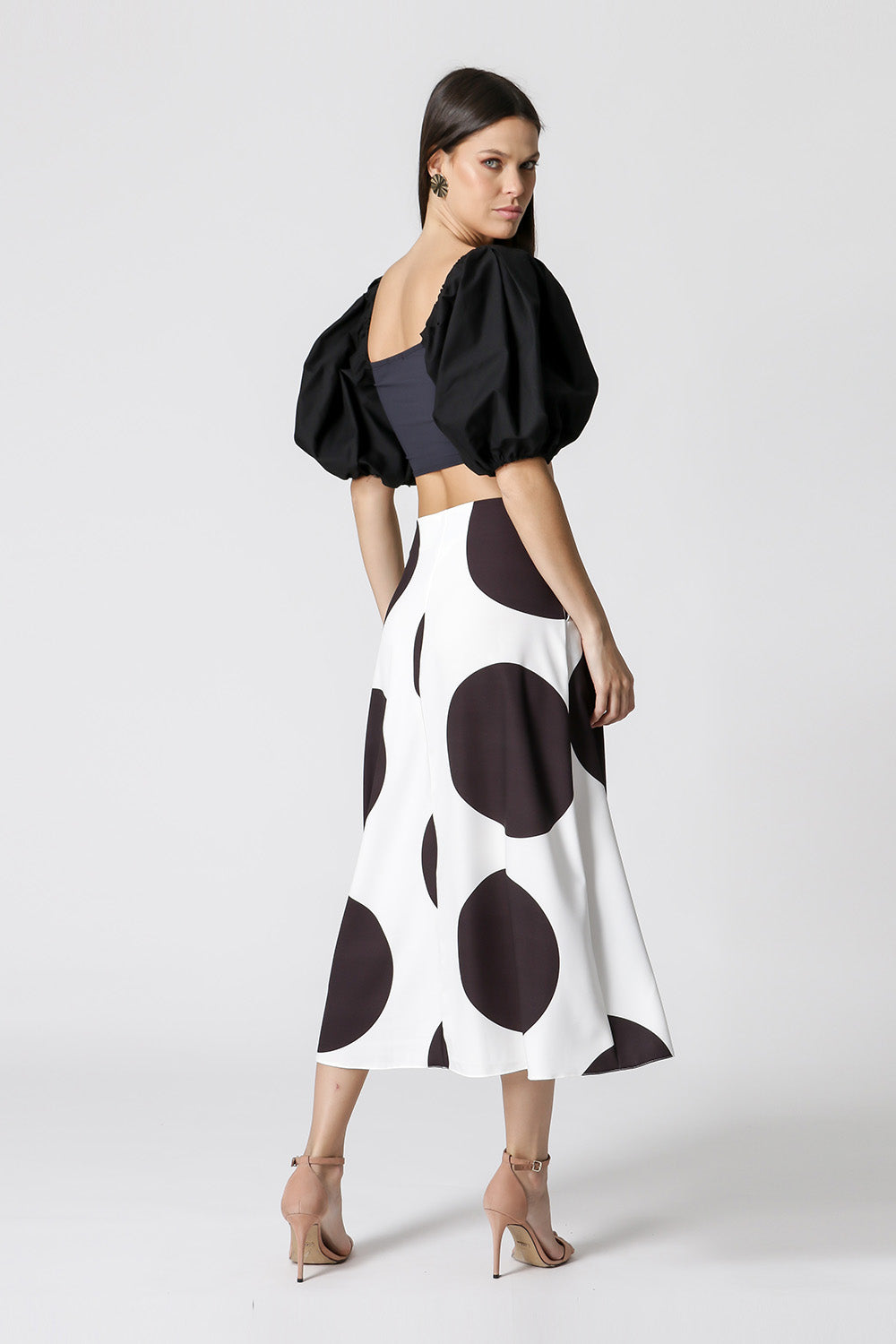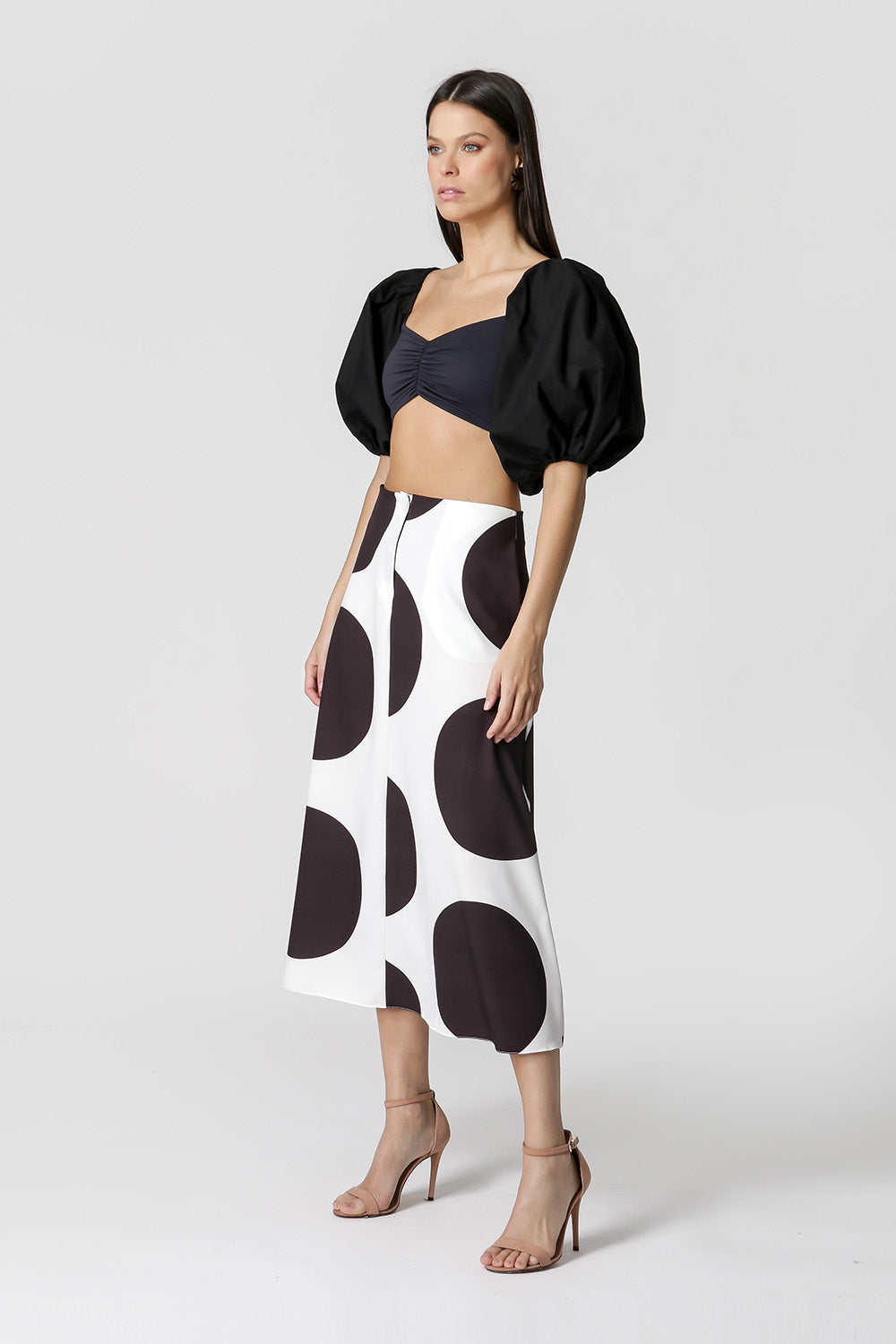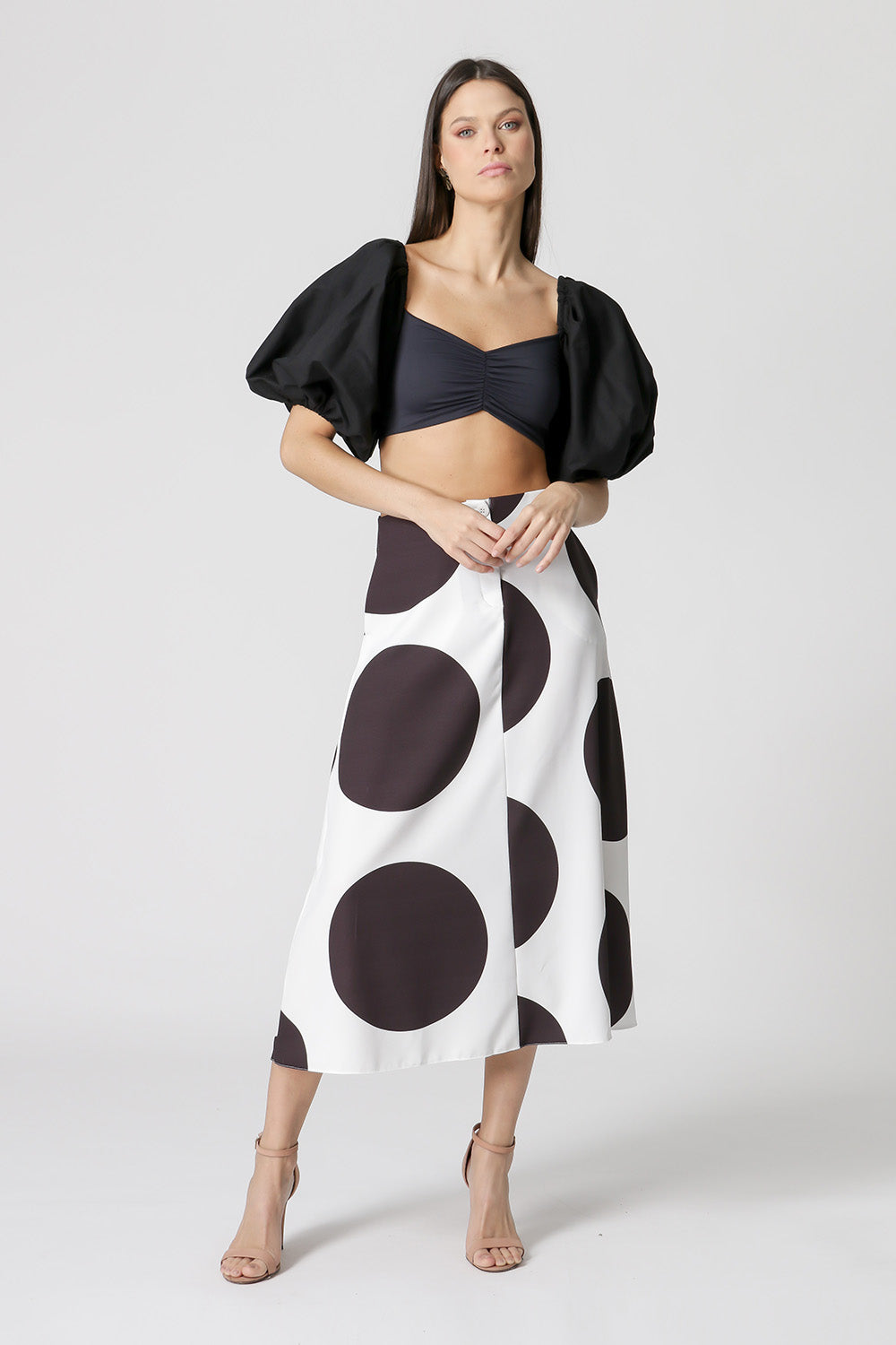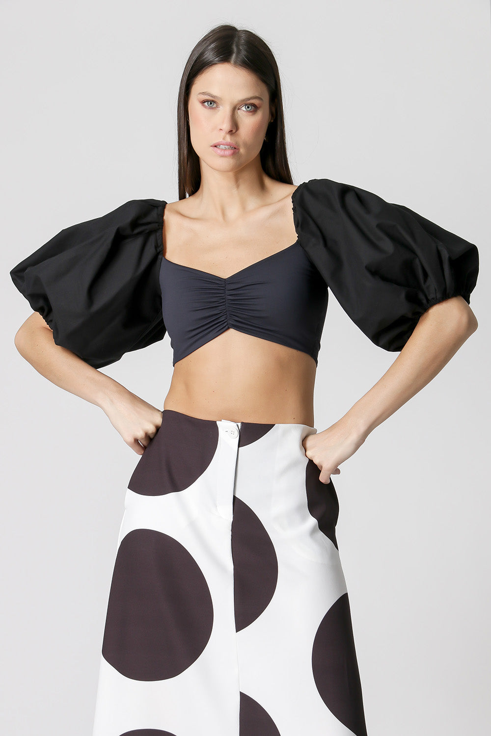 Blusa cropped com corpo em malha Amni e mangas em tecido plano. Possui detalhe de franzido com elástico no decote e no punho da manga. Peça que é tendência da estação.