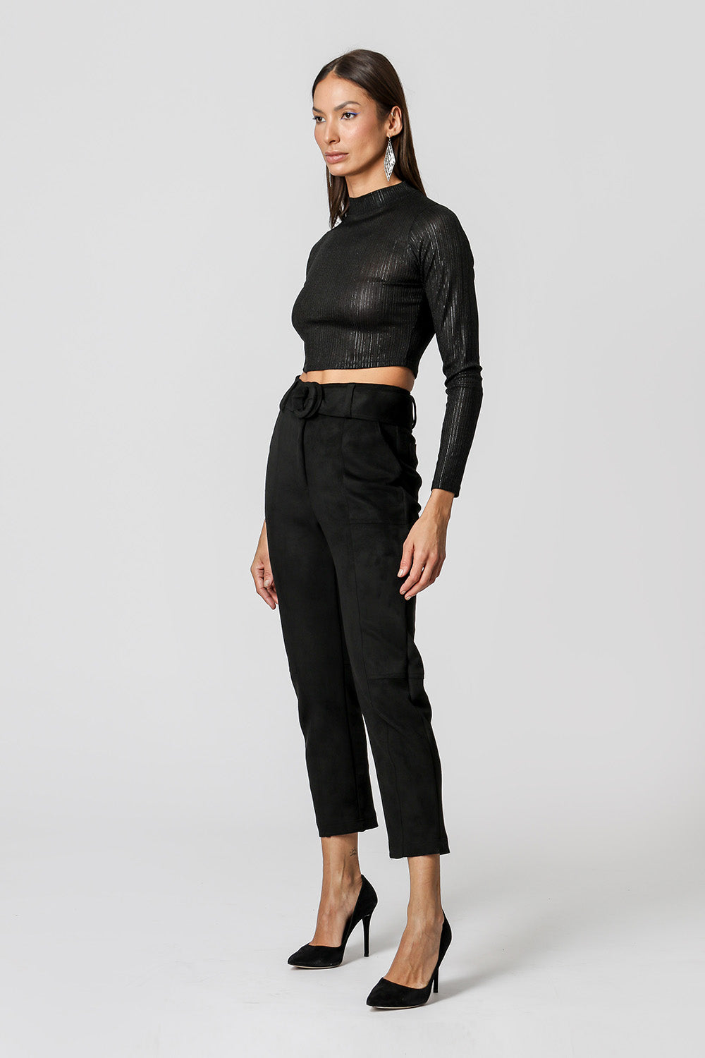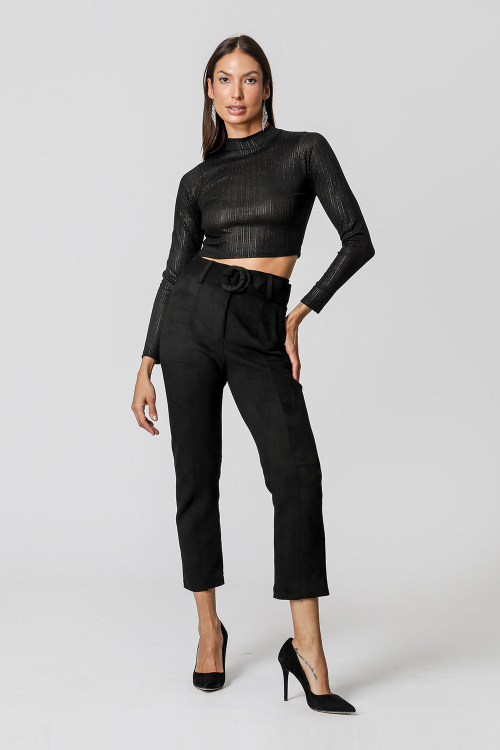 Cropped confeccionado em malha canelada brilhante, com shape mais ajustado ao corpo, mangas longas e gola alta. É uma peça mais descolada, perfeita para compor um look night.