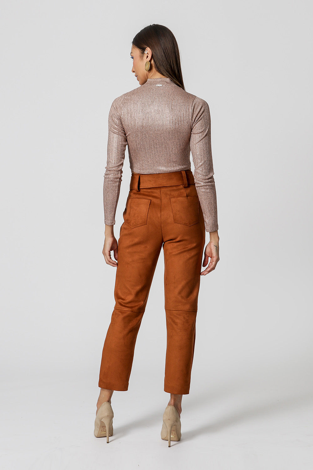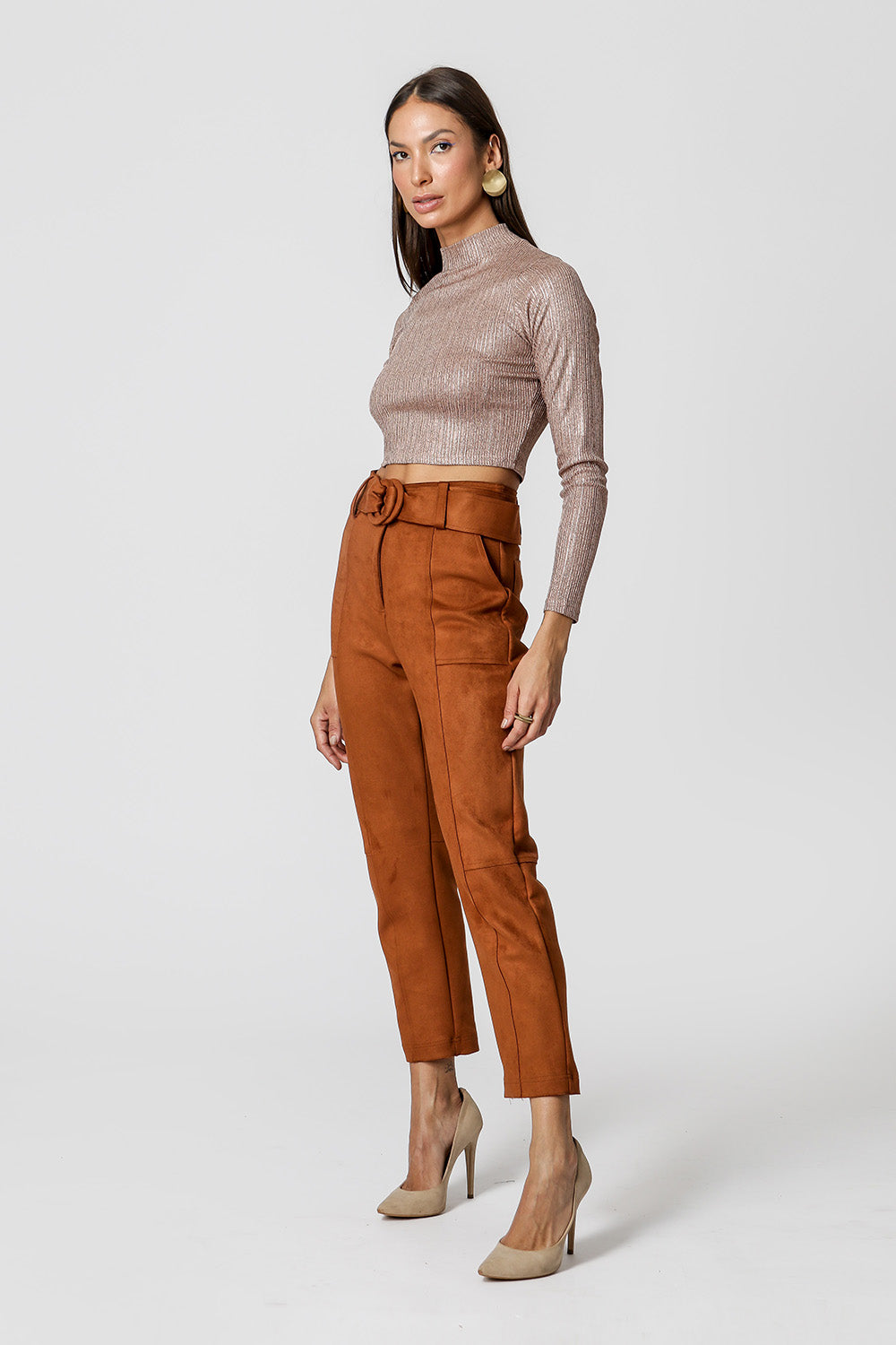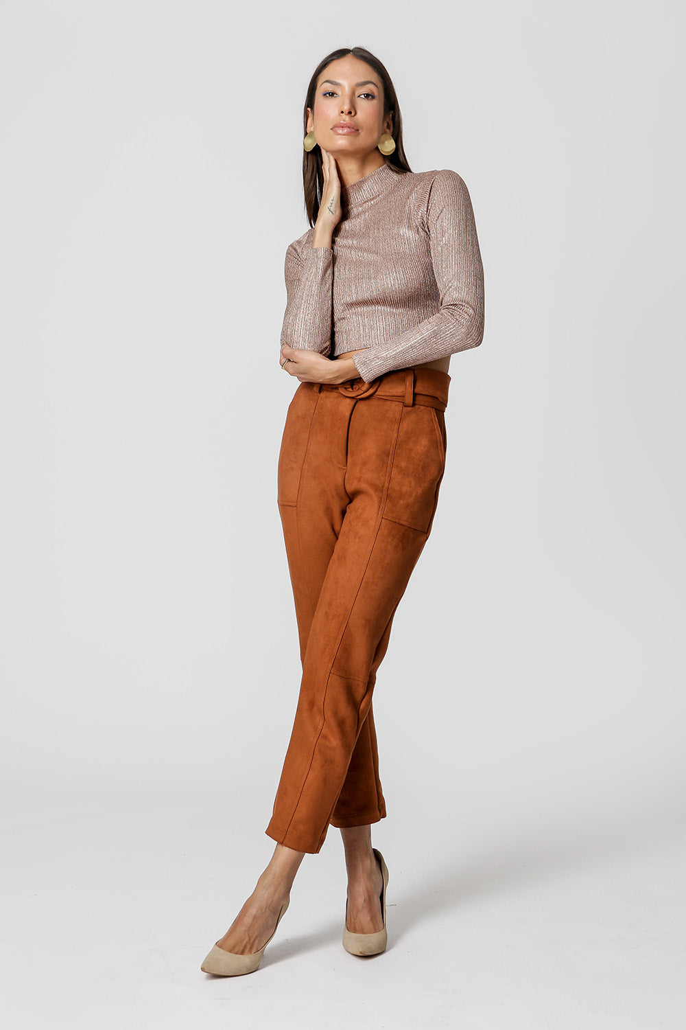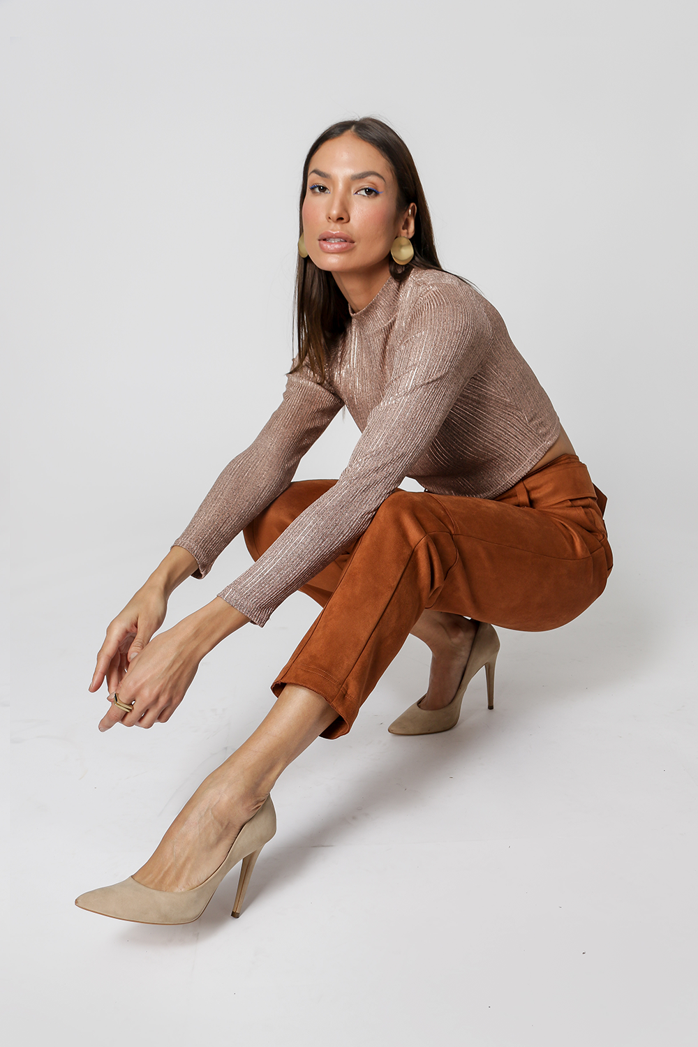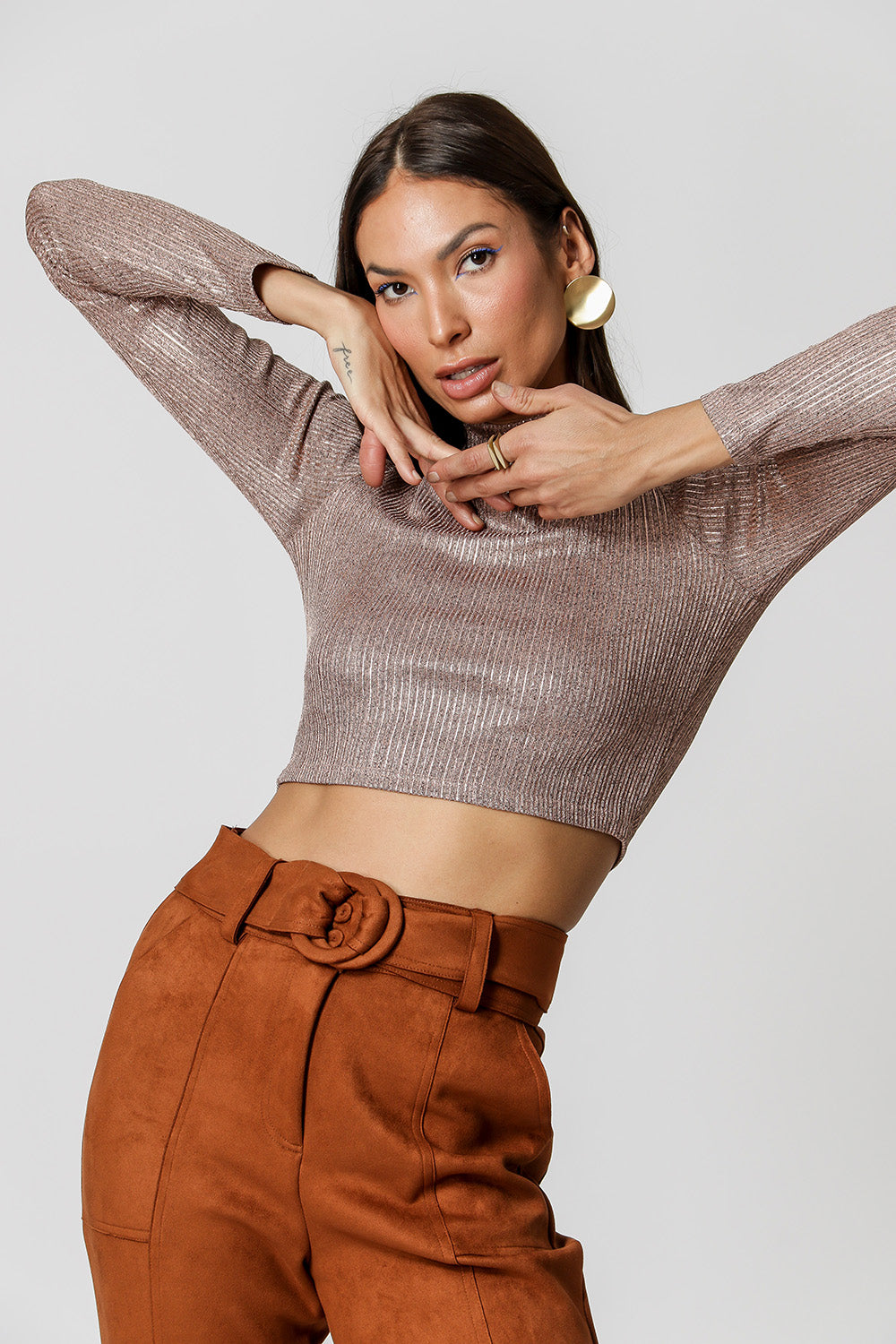 Cropped confeccionado em malha canelada brilhante, com shape mais ajustado ao corpo, mangas longas e gola alta. É uma peça mais descolada, perfeita para compor um look night.