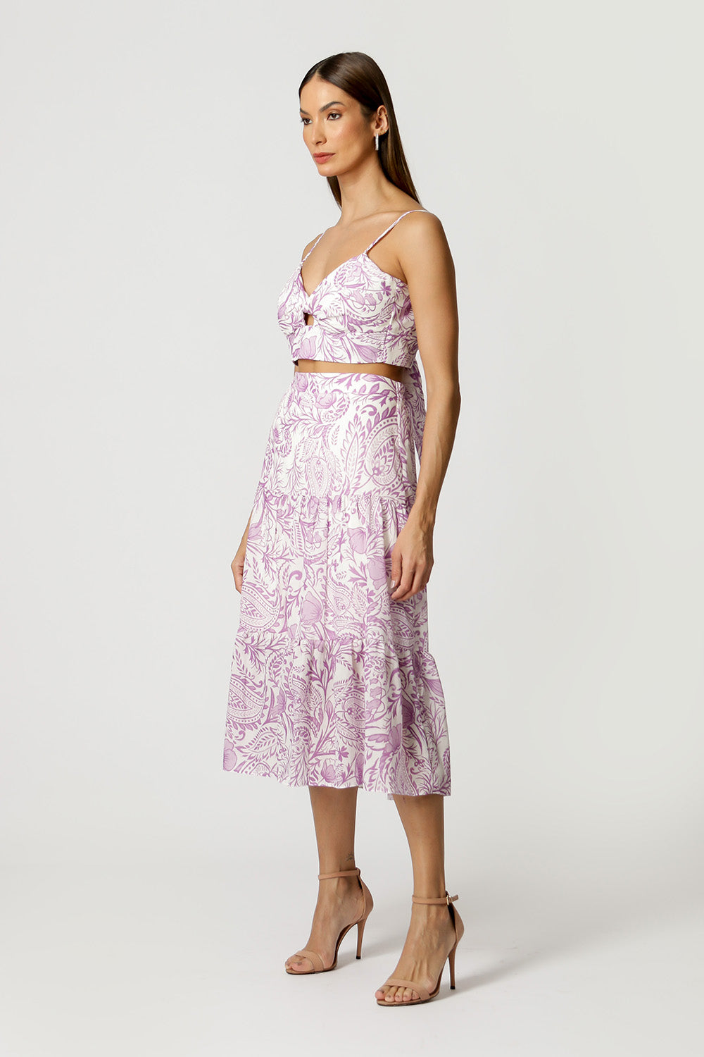 Blusa cropped alça com detalhe de nó no decote frente. Possui bojo, frente forrada e amarração nas costas. Peça feita em voil glass estampado, leve, fesh e despojado!