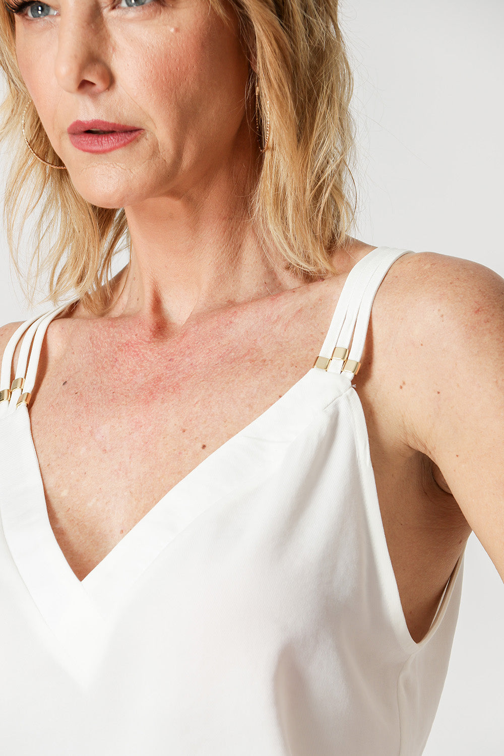 Blusa com delicado detalhe nos ombros, composto por três tiras finas com adereço metálico. Perfeita para o look casual chic.