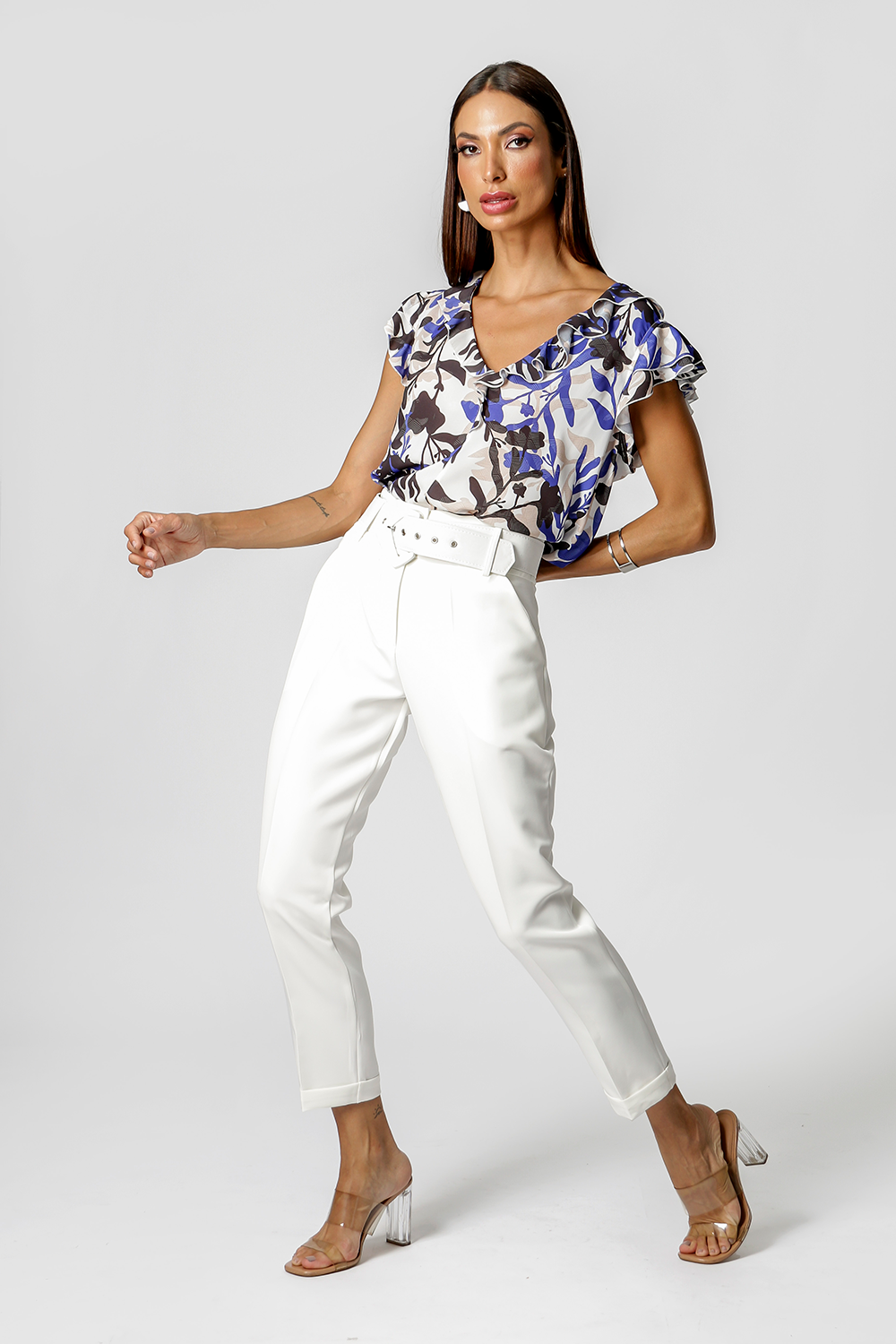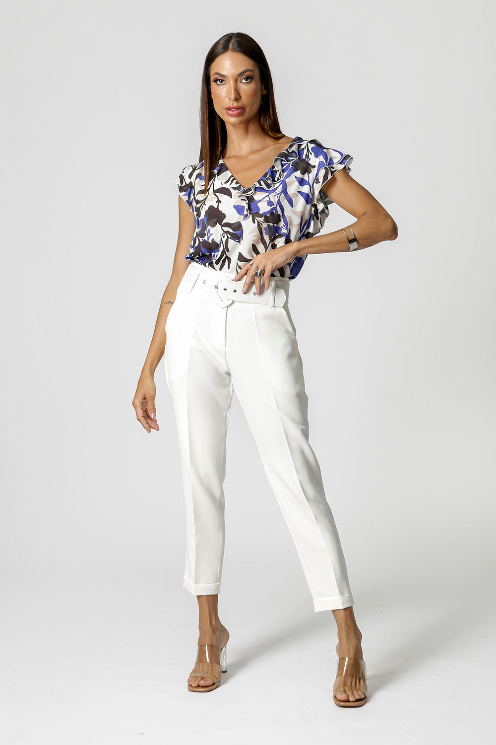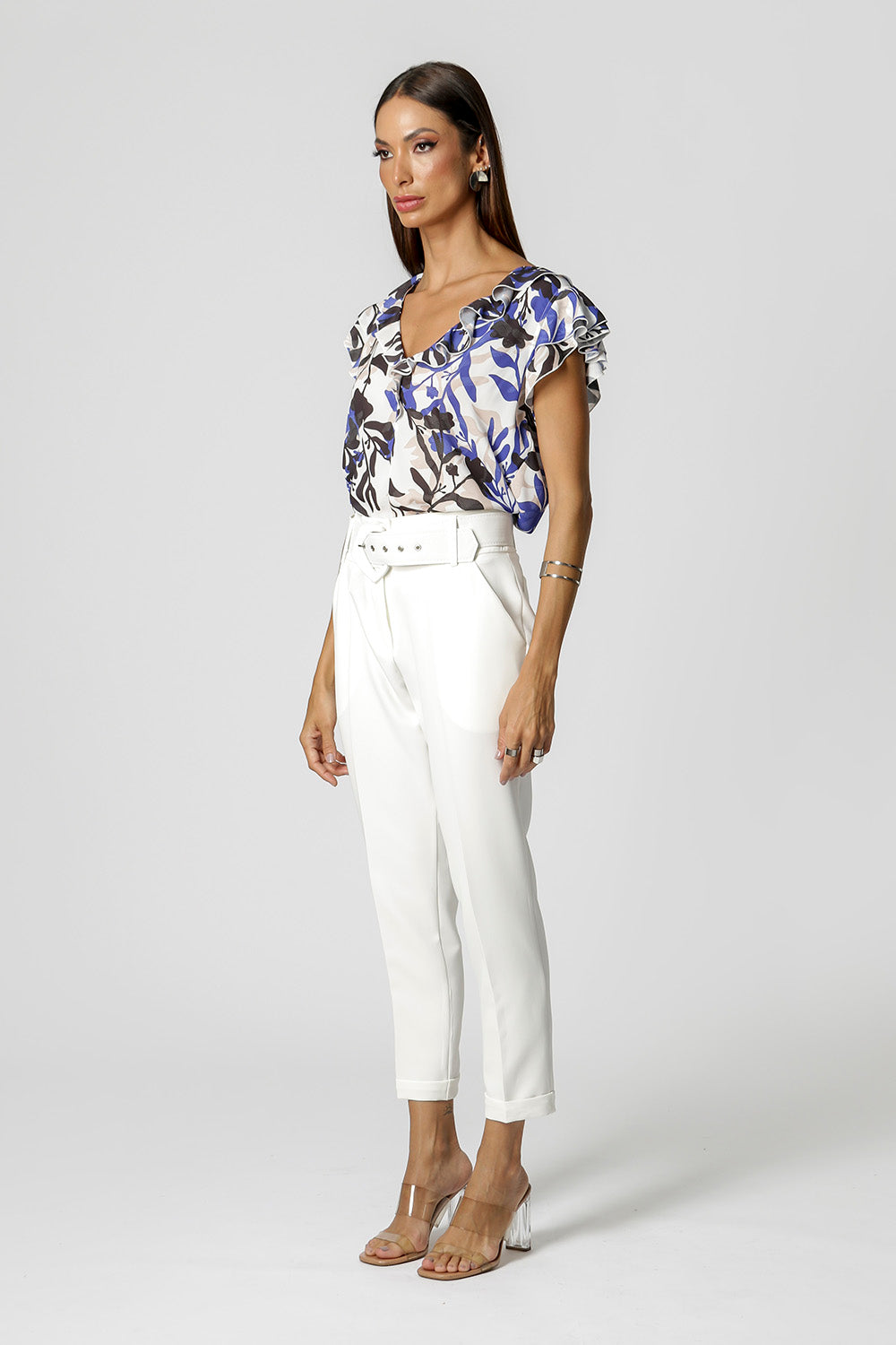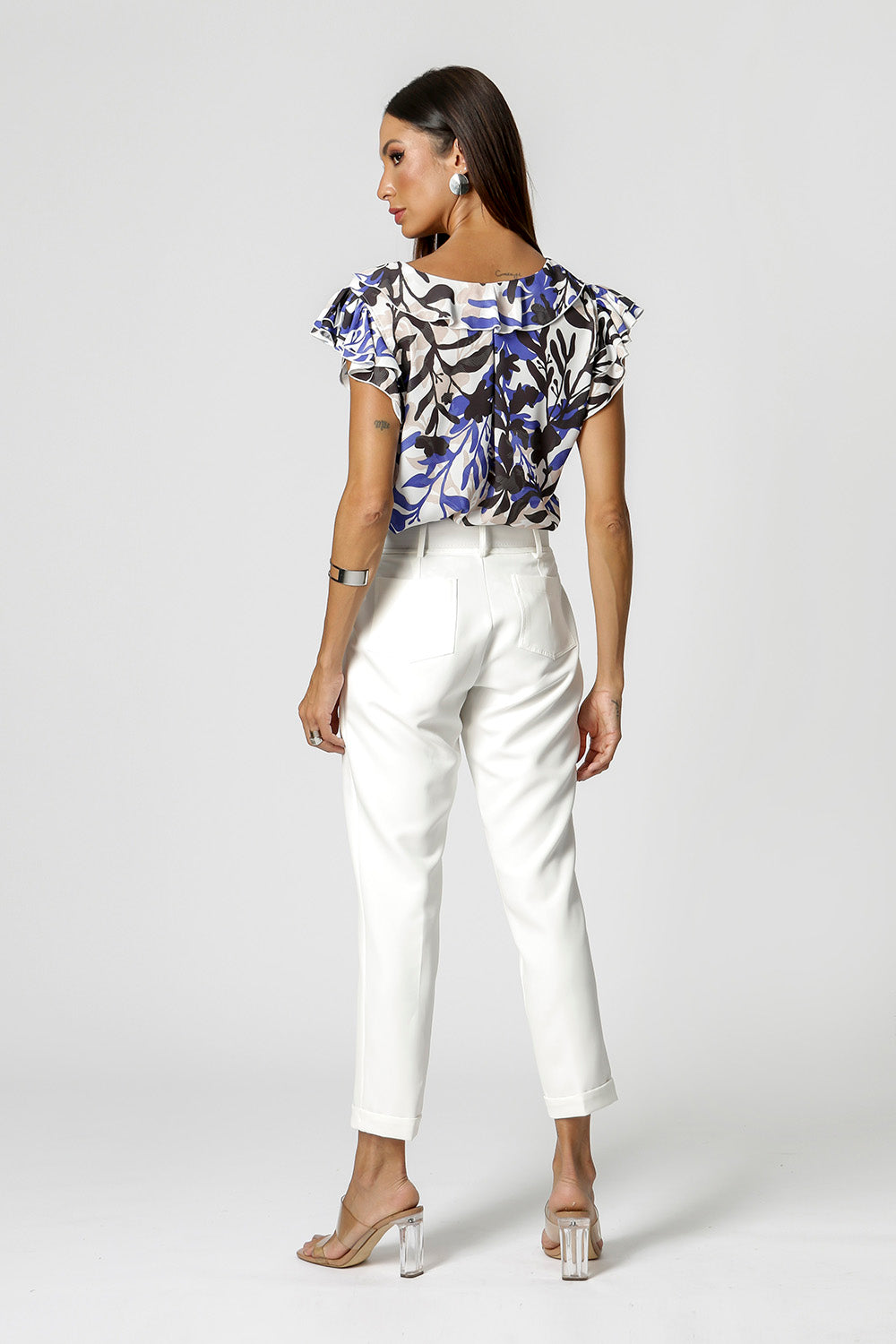 Blusa com decote e mangas em babados, confeccionada em crepe. Uma peça fresh, delicado e elegante.