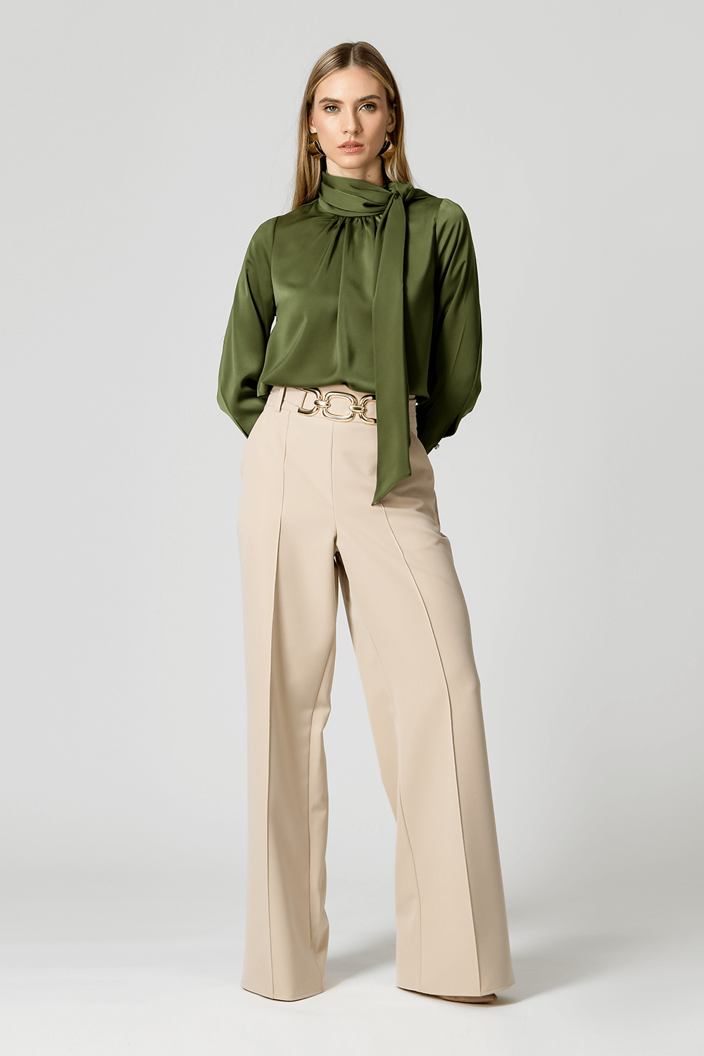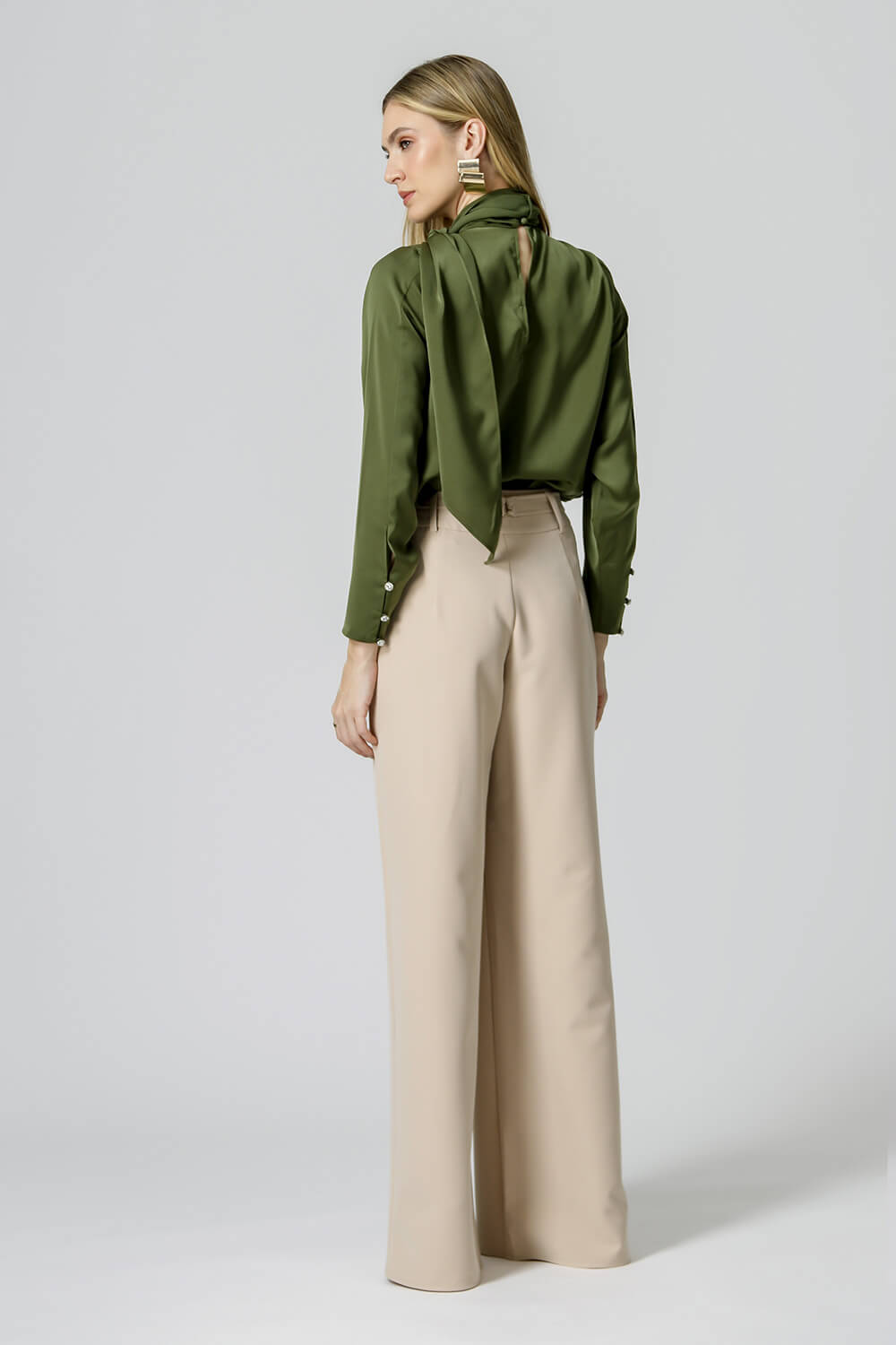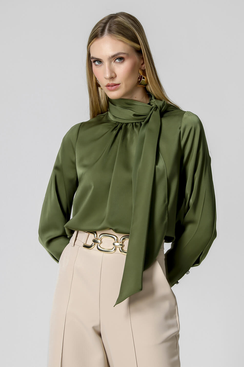 Blusa manga longa com detalhe franzido na gola, faixa na cintura, botões forrado e strass. Modelo confeccionado em tecido Cetim. Uma peça que pode ser usada em diversas maneiras e ocasiões aposte nessa peça.