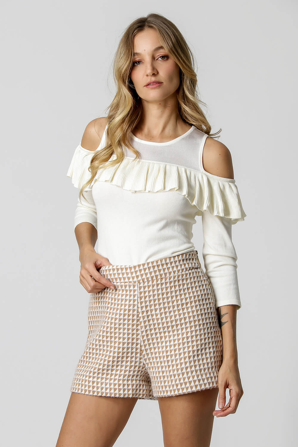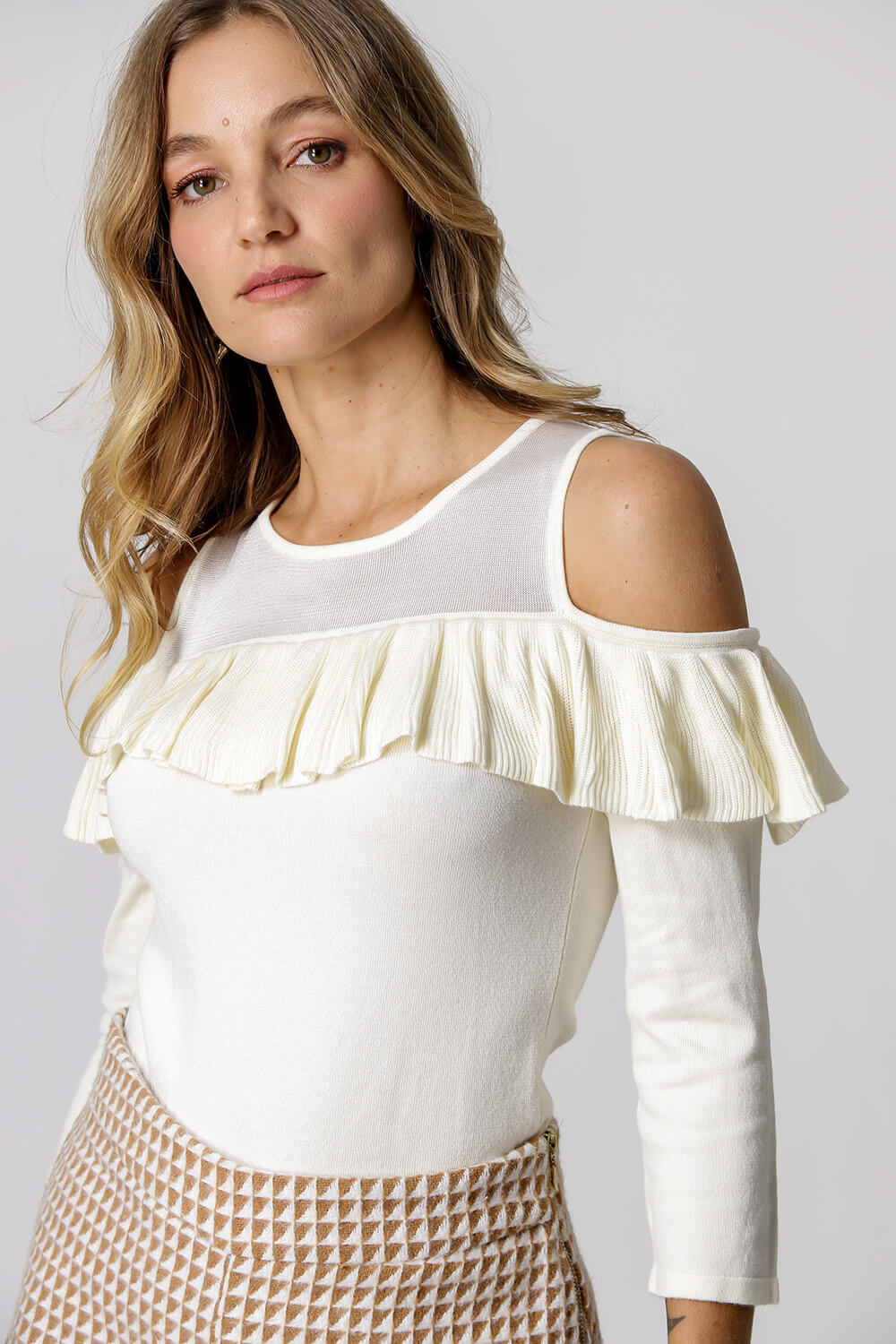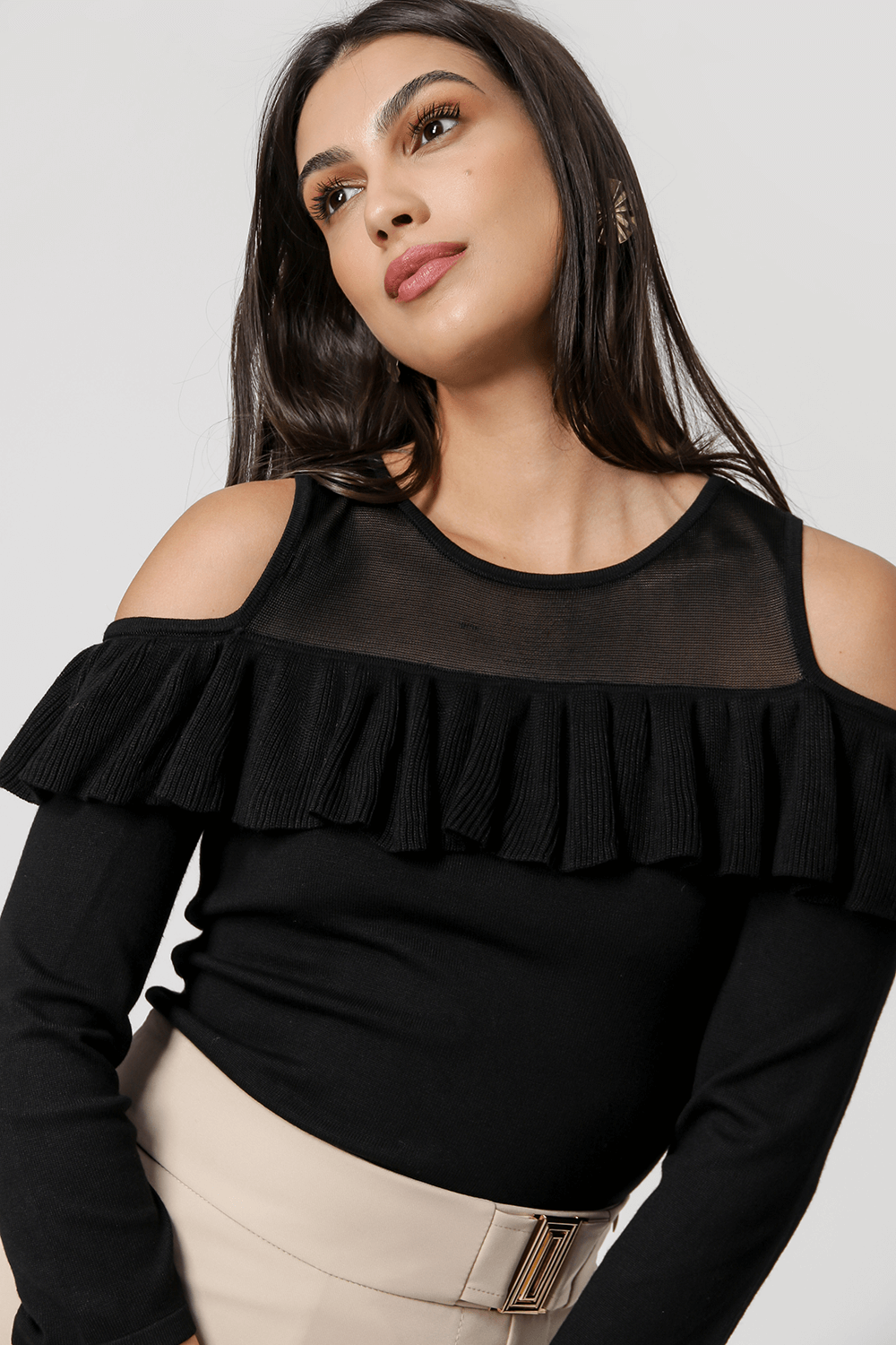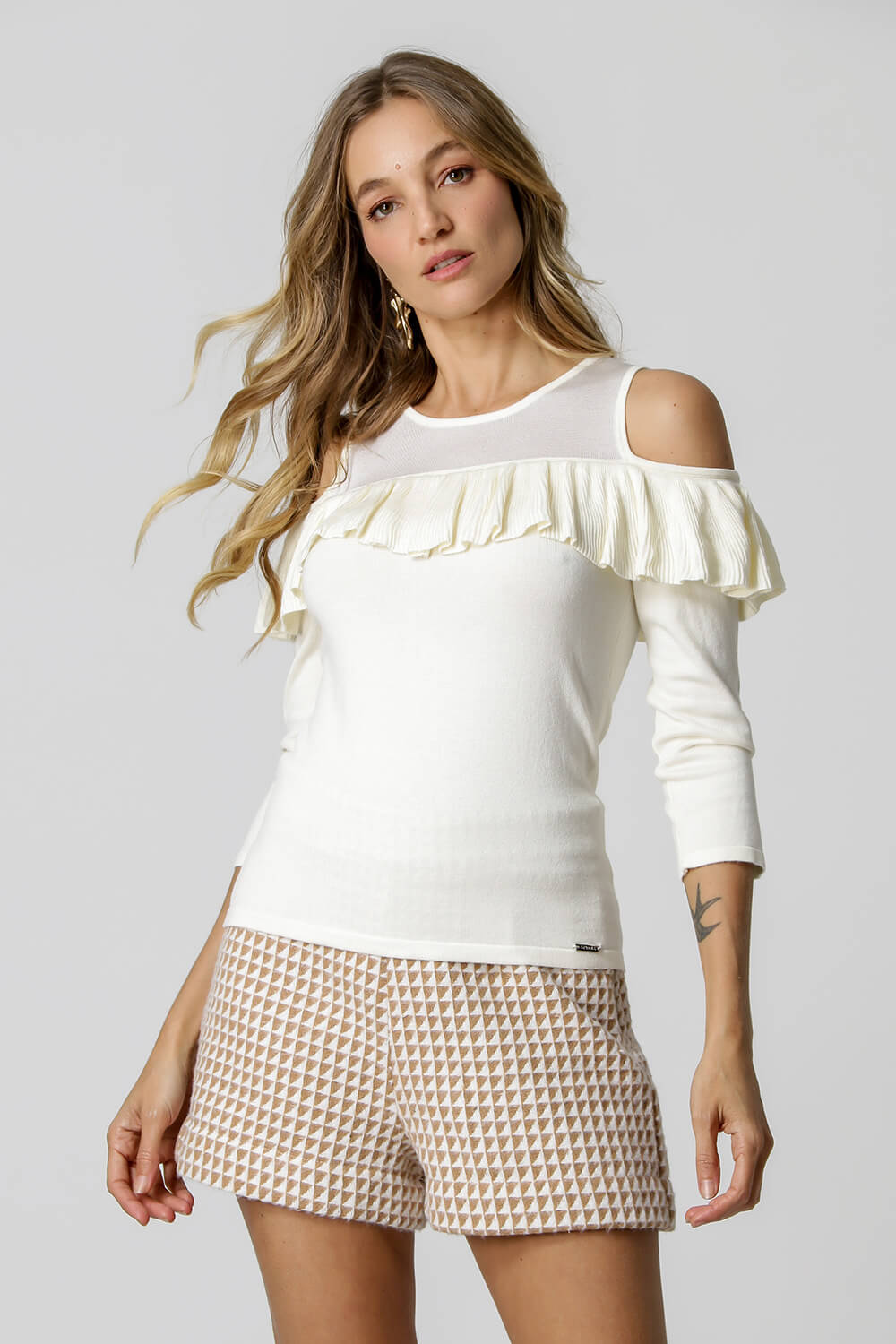 Blusa de retilínea com manga 3/4, no decote tem uma leve transparência, na parte do ombro é vazado, deixando-o a mostra; a peça conta ainda com um babado que vai de um ombro a outro com shape que valoriza silhueta feminina.