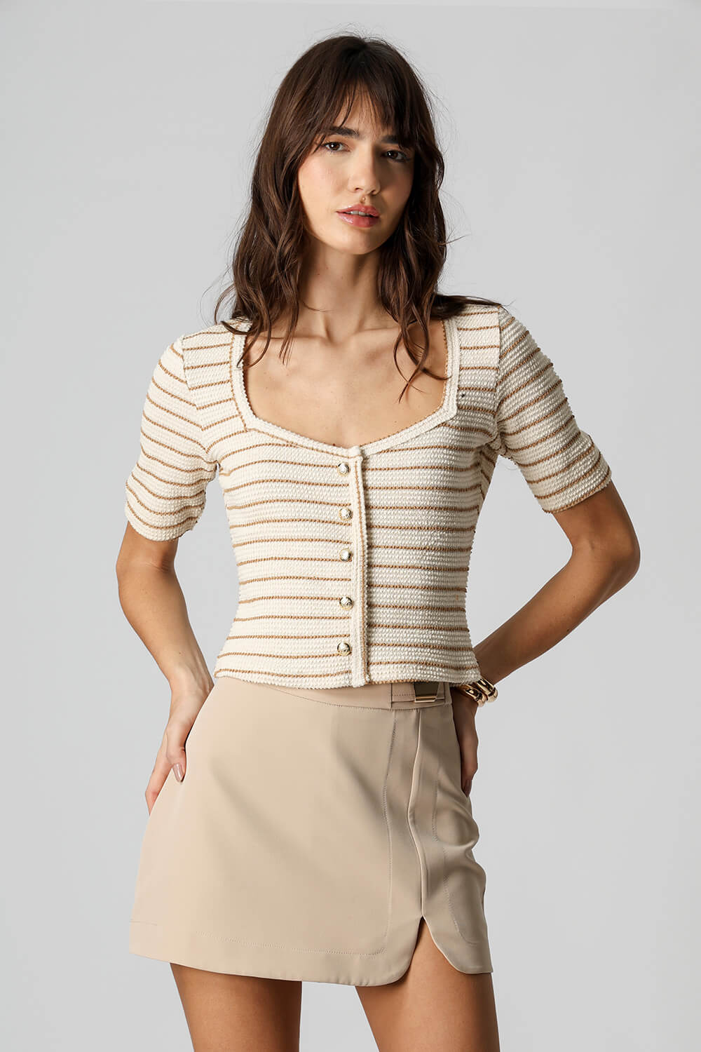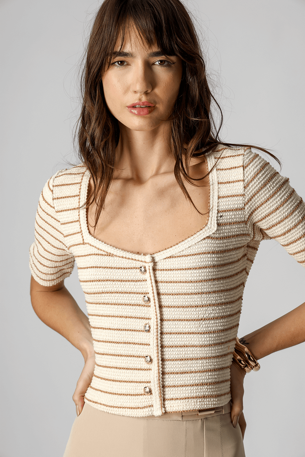 Conforto e sofisticação em uma só peça. Confeccionada em tricot listrado, esta blusa com mangas 3/4 se destaca pelos botões dourados decorativos na parte frontal, que dão um charme extra ao design. Ideal para looks casuais elegantes ou produções versáteis do dia a dia.