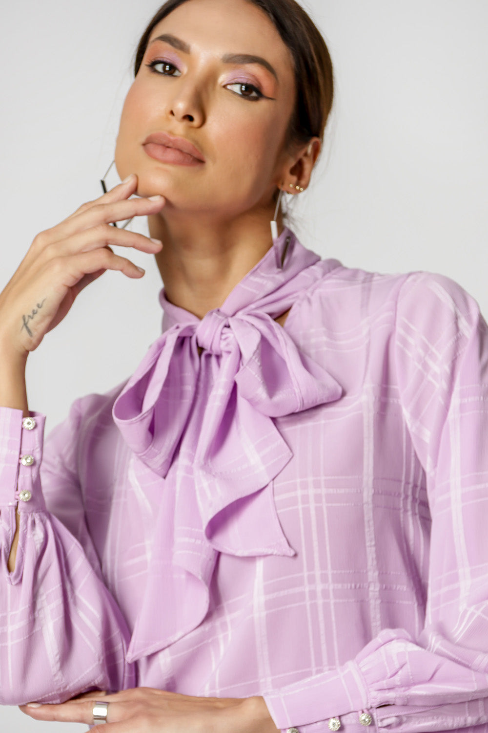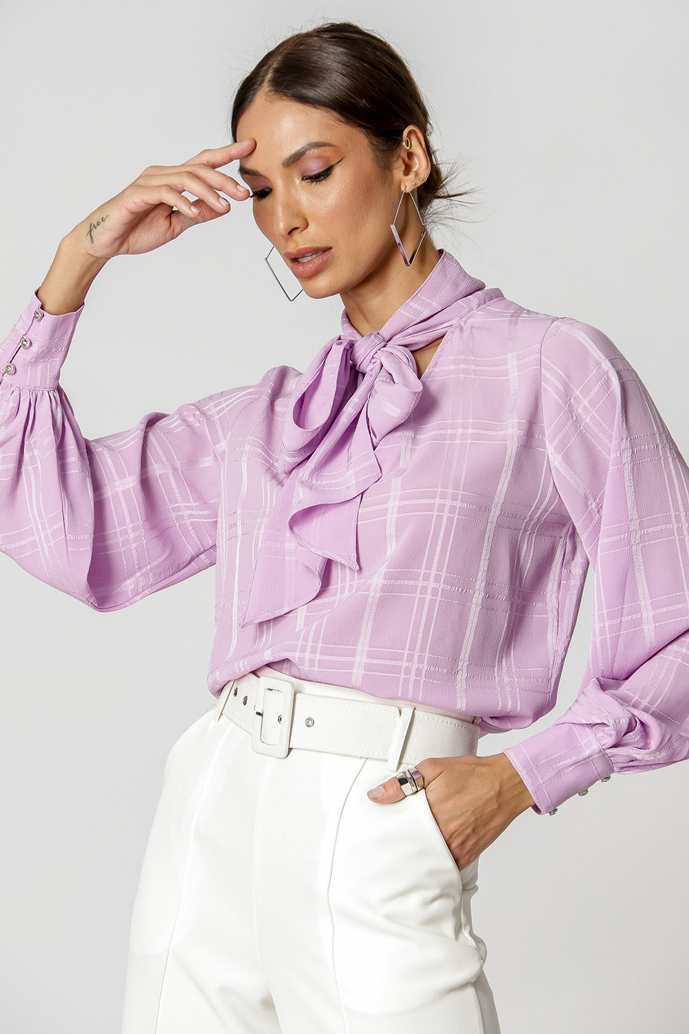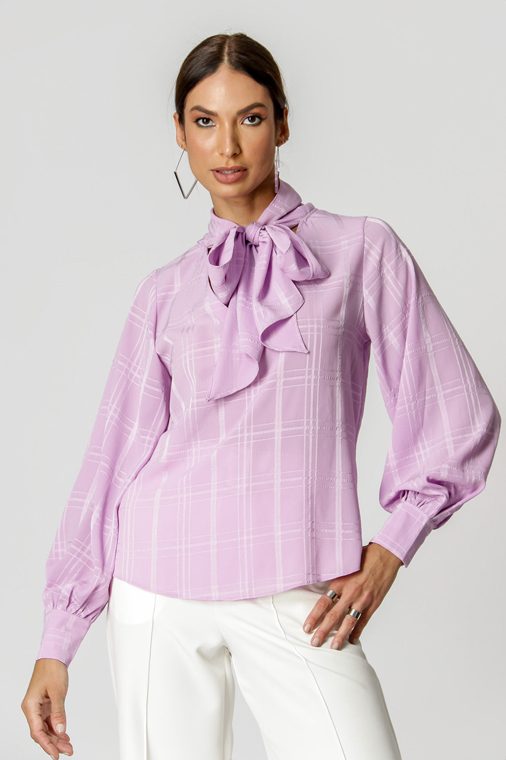 Blusa com shape mais solto, mangas longas, decote V e detalhe de laço no decote. Feita em chiffon com padronagem xadrez. Uma peça delicada e classica, que vai deixar seu look mais feminino.