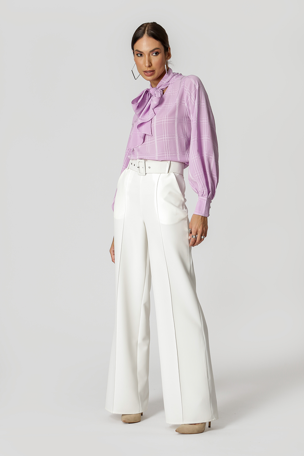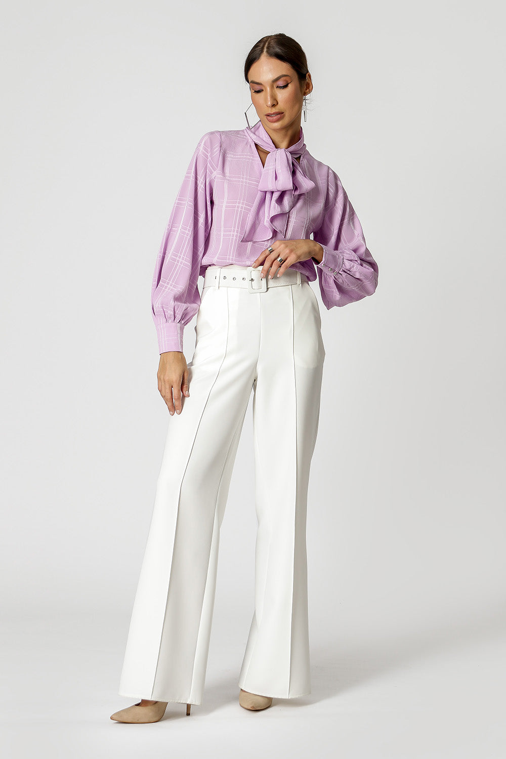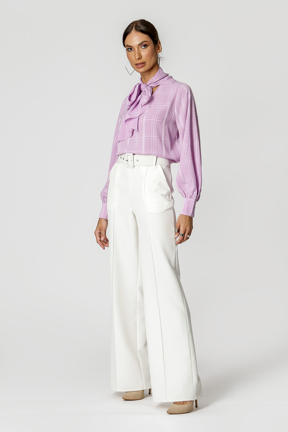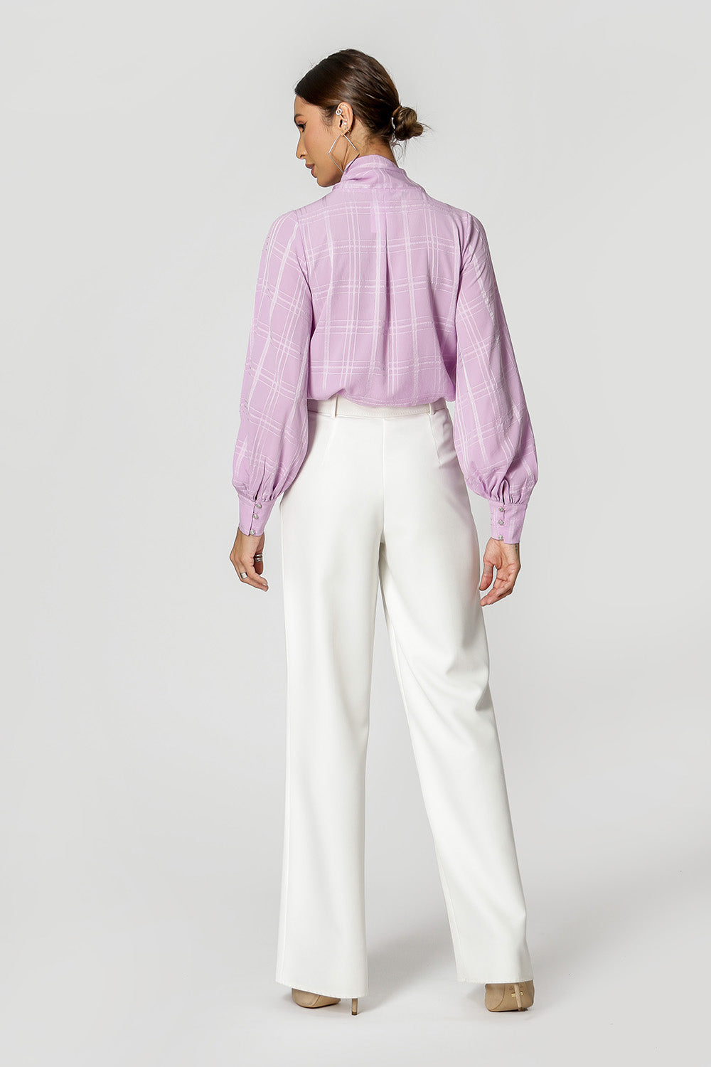 Blusa com shape mais solto, mangas longas, decote V e detalhe de laço no decote. Feita em chiffon com padronagem xadrez. Uma peça delicada e classica, que vai deixar seu look mais feminino.